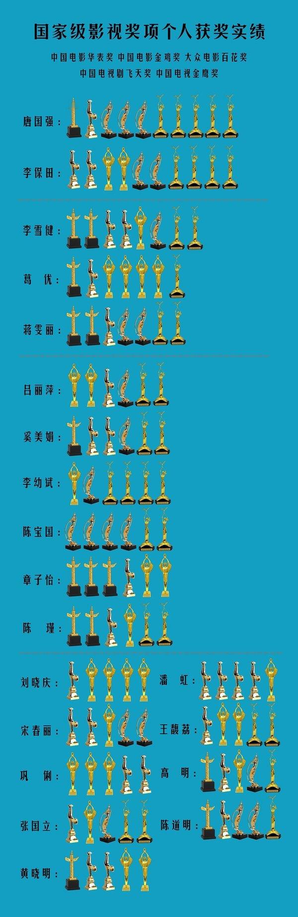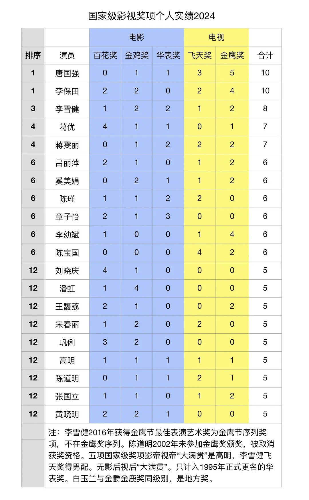 国家级影视奖项个人实绩,白玉兰是地方奖没有计入。唐国强的5个金鹰是怎么算的啊?女演员最厉害的是蒋雯丽,影剧双杀,难怪能带出马思纯黄轩张鲁一,电影电视剧资源都不缺。