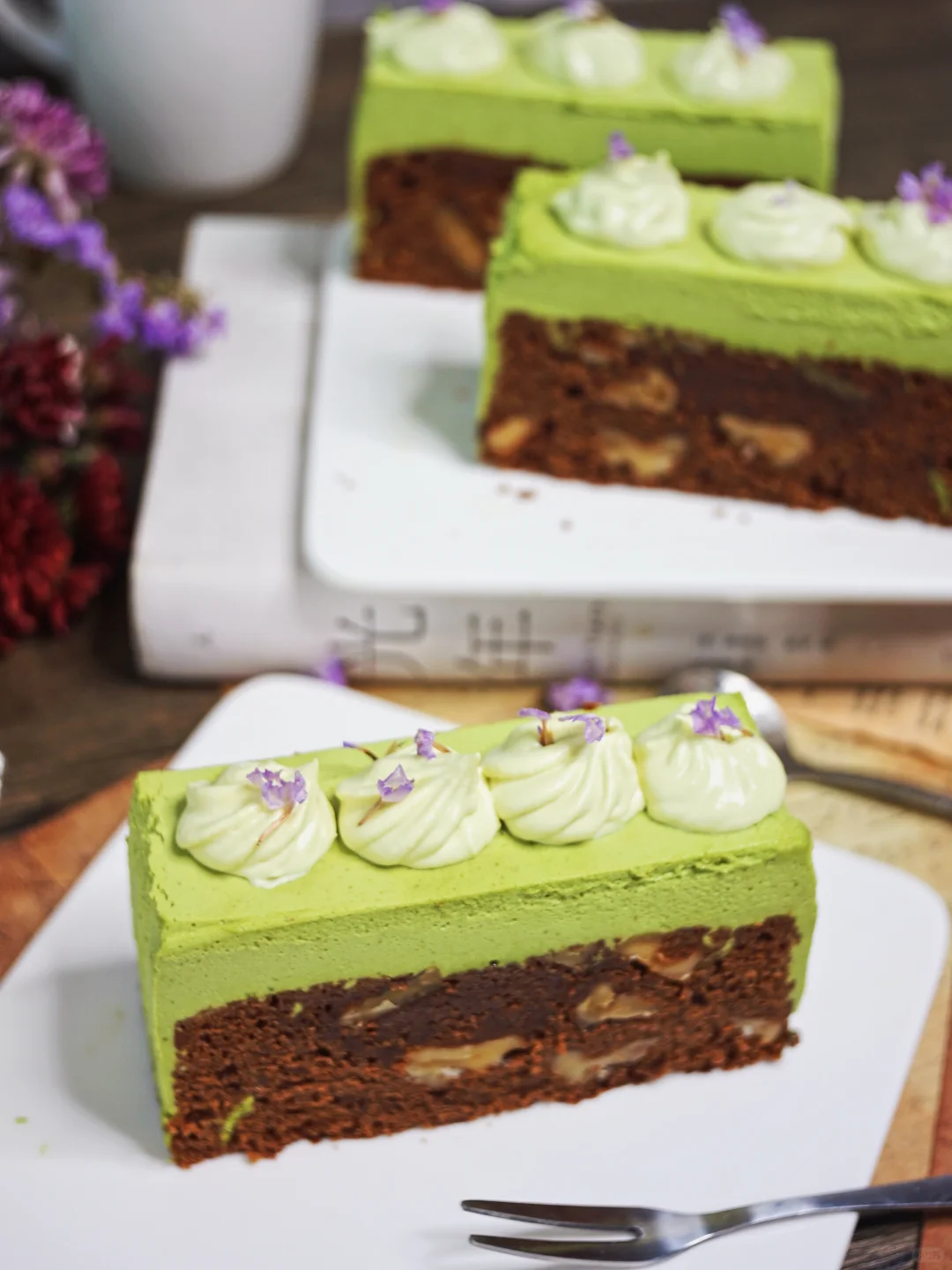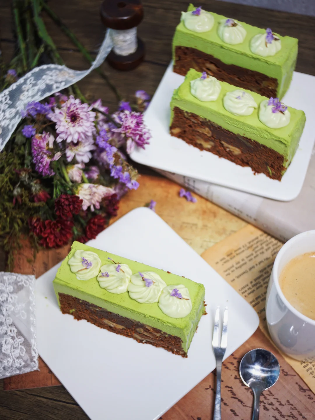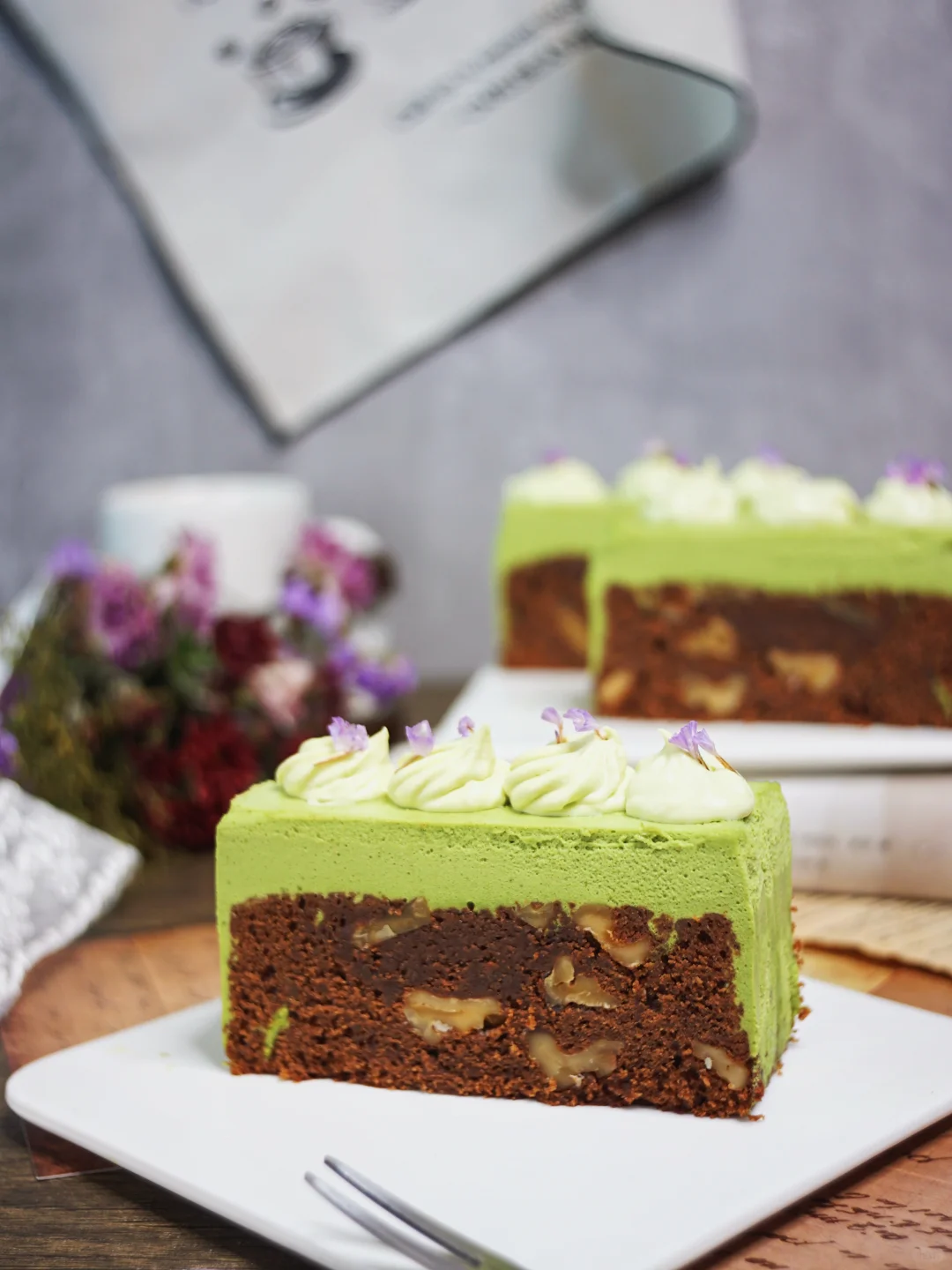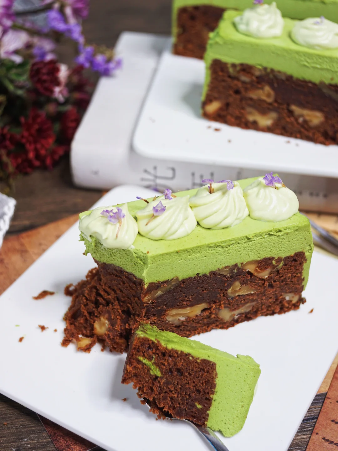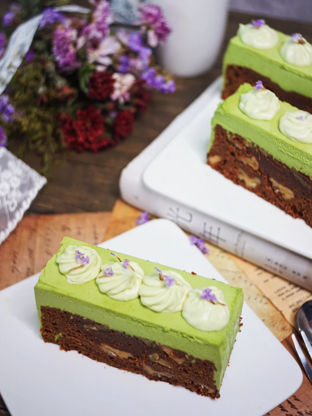 🫧没有哪个甜品脑袋可以抵抗这一份蛋糕吧。底下一层是有满满核桃仁的布朗尼,上面一层是绿意盎然,坚果香气浓郁的开心果慕斯。一块蛋糕两种口感风味🍁
