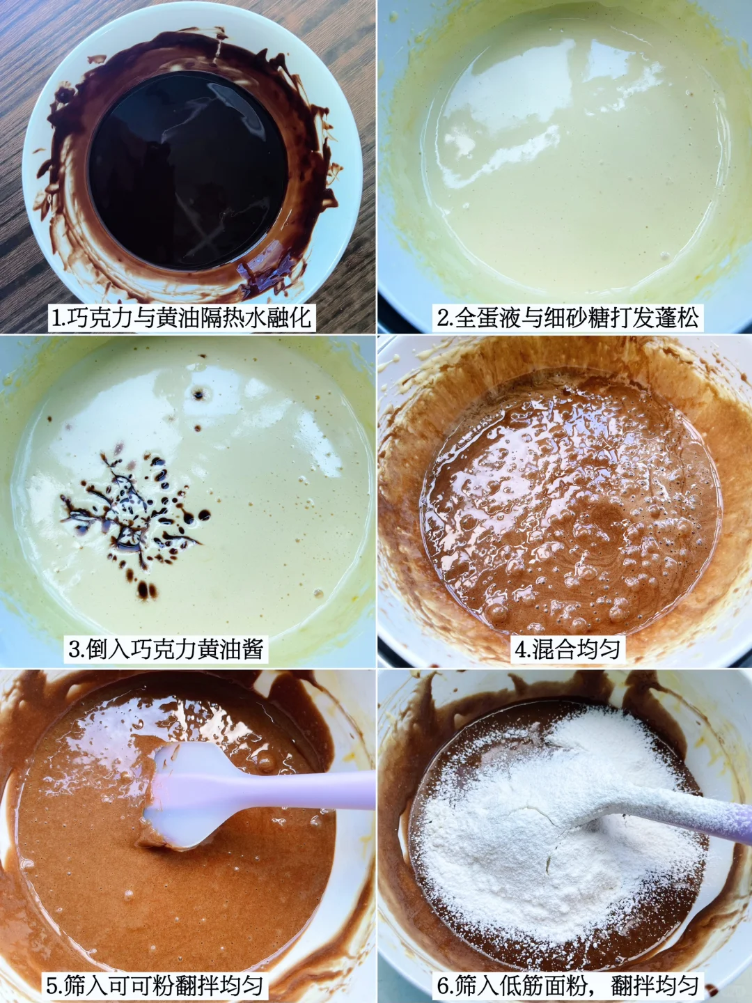 黑巧克力60g丨核桃80g丨细砂糖70g丨低筋面粉45g丨全蛋液80g丨黄油80g丨可可粉3g