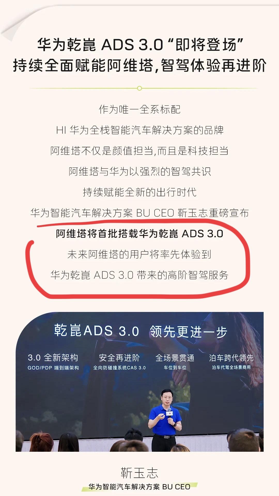 重磅消息!!阿维塔将首搭乾崑ADS3.0!黑子们你们倒是说话啊!! 1️⃣华为乾崑ADS 3.0采用GOD(通用障碍物识别)/PDP(预测决策规控)全新端到端架构,可实现车位到车位智驾领航NCA功能,且同时升级CAS 3.0全向碰撞系统,可覆盖更多速度区间的紧急刹停及横向避障。 2️⃣阿维塔泊车代驾VPD(无人代客泊车)功能全国开启内测体验,大家可以期待一下我的体验视频 3️⃣黑子们别再提什么干儿子亲儿子这种过时俗套的话术了,八月份长安和华为合资车bu官宣,深度赋能
