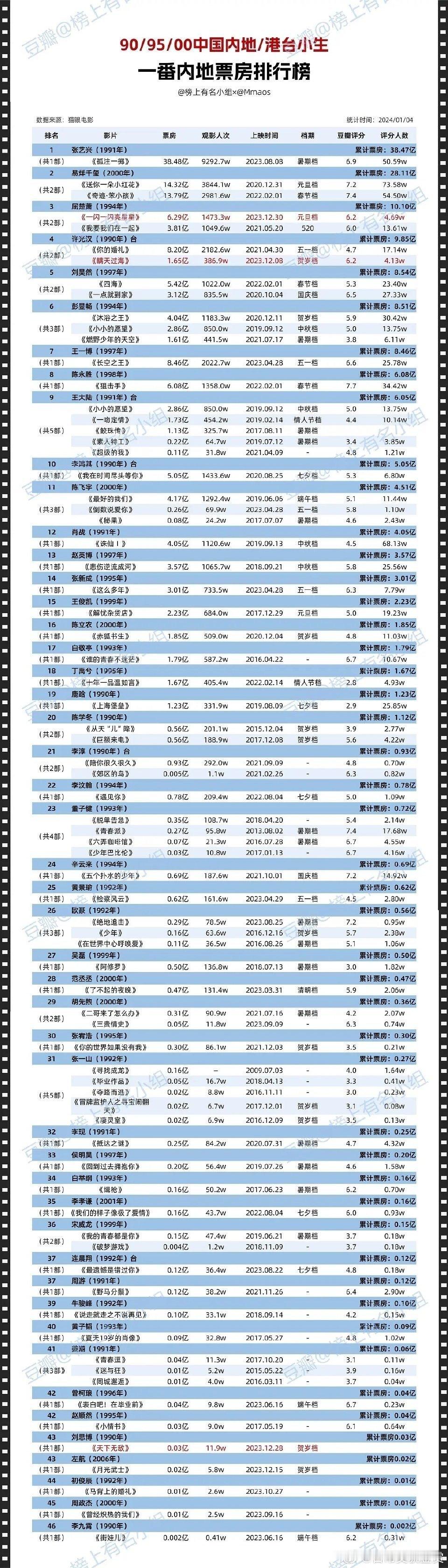90/95/00内地港台小生一番票房排行榜,前三名张艺兴易烊千玺屈楚萧,其实彭昱