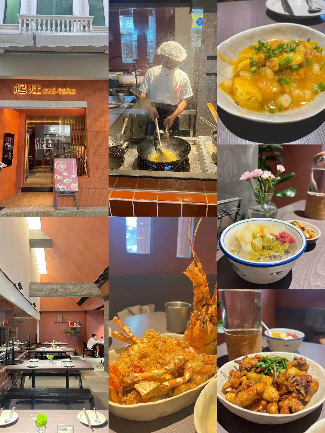 晚餐我们就选在附近的起灶,可以看着厨师烧好直接端上桌,这种方式挺不错的。虾仁干贝自制手工豆腐是餐厅的推荐菜,色香味俱全,台式三杯鸡味道很正宗,避风塘龙虾性价比很高,肉质Q弹好味,甜品来碗四果汤,满足。