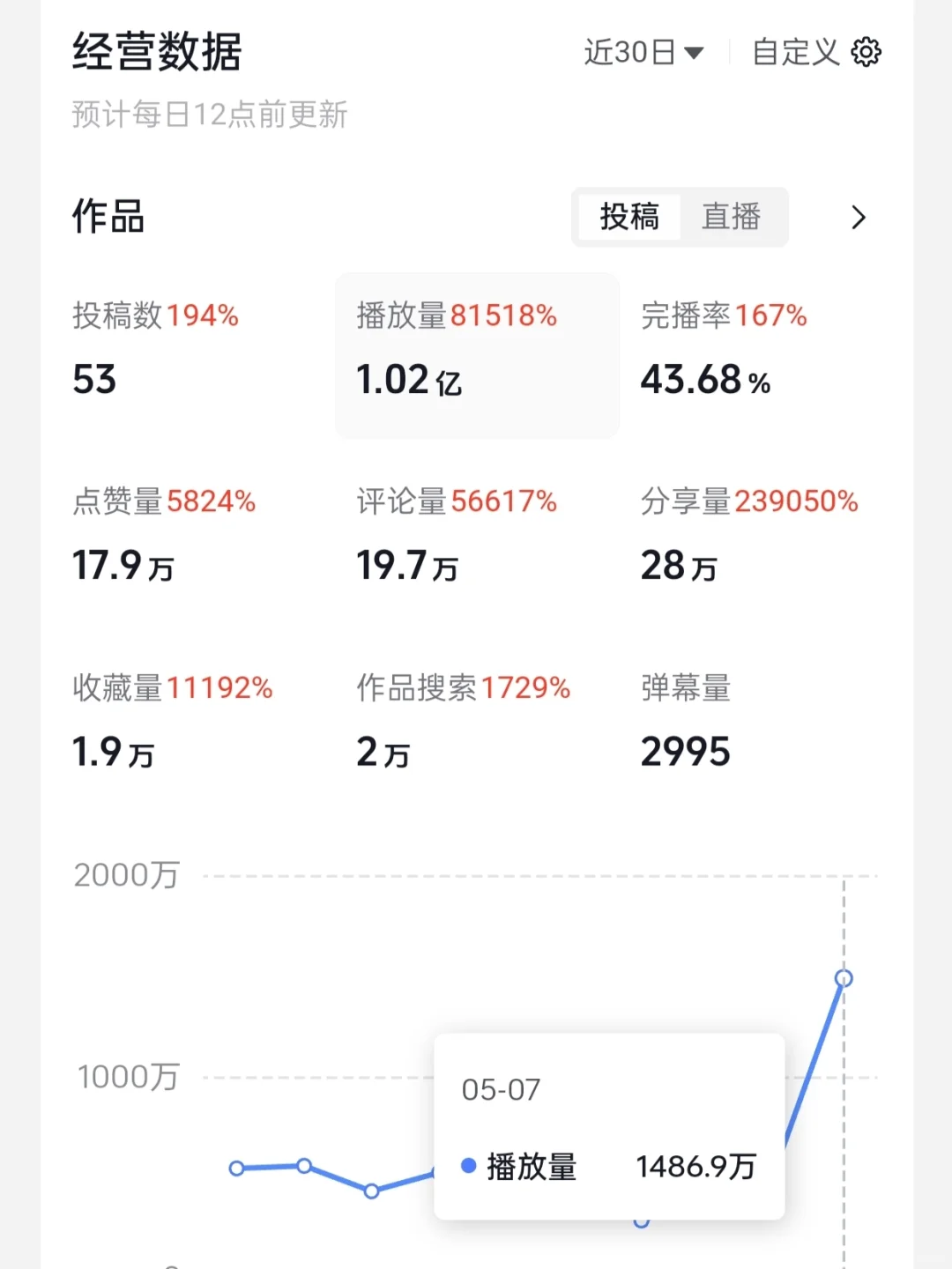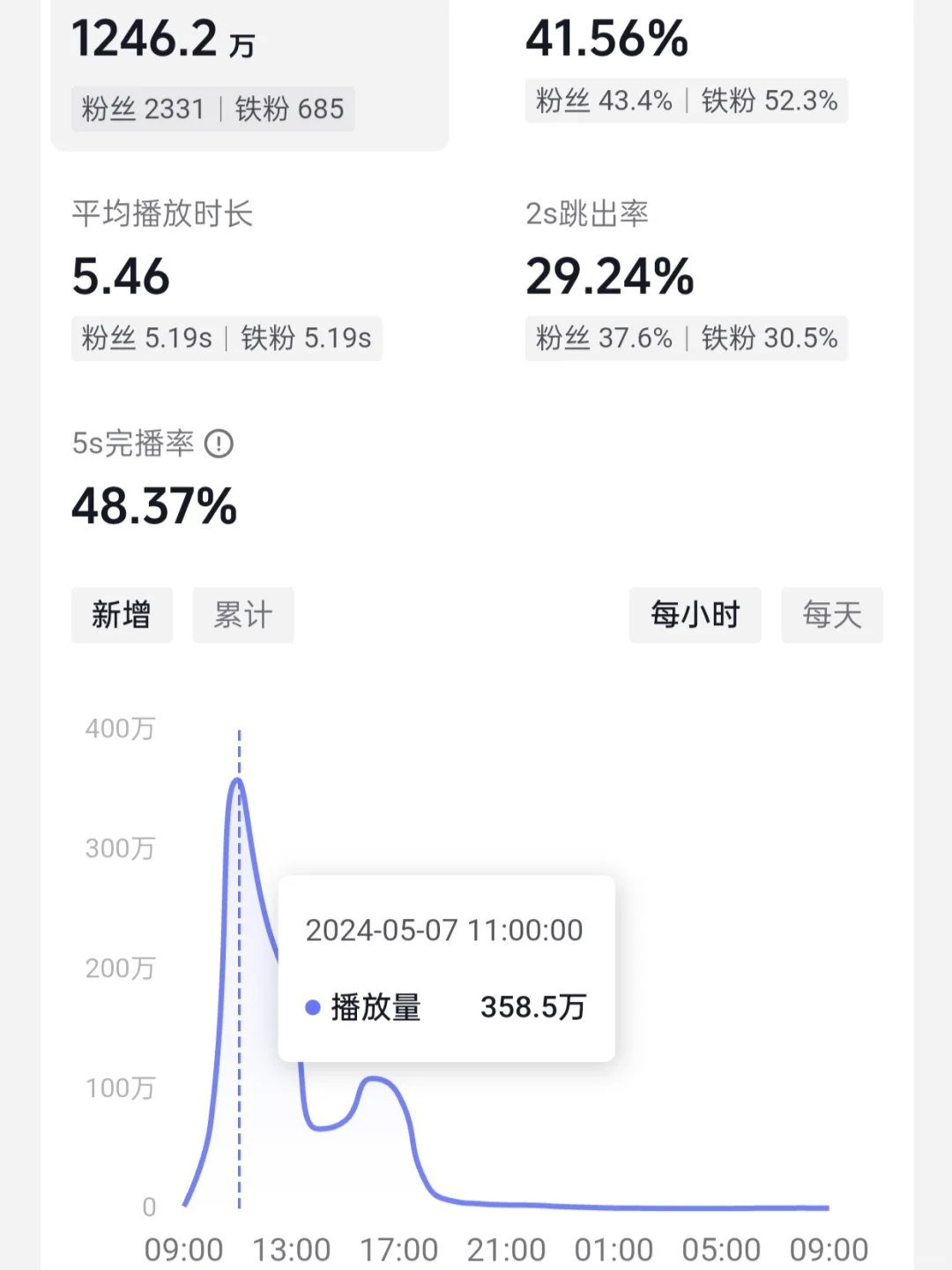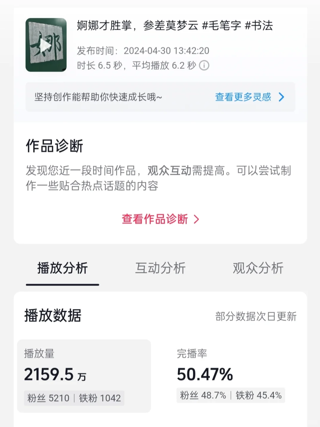 第五个阶段,24年3月25日,我有了首条破10万播放的视频,4月10日写了一个鶴字,在有了100多万浏览量,近7000赞,在小破zhan也有130万播放和2万赞,14日,某yin单条视频300万播放,18日,单日播放破千万,五一期间,单条视频破2000万,昨天,单小时播放358万,今天,单月播放破亿。由于字数限制,下条笔记接着聊。