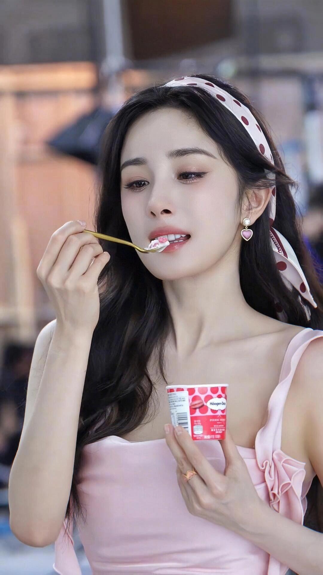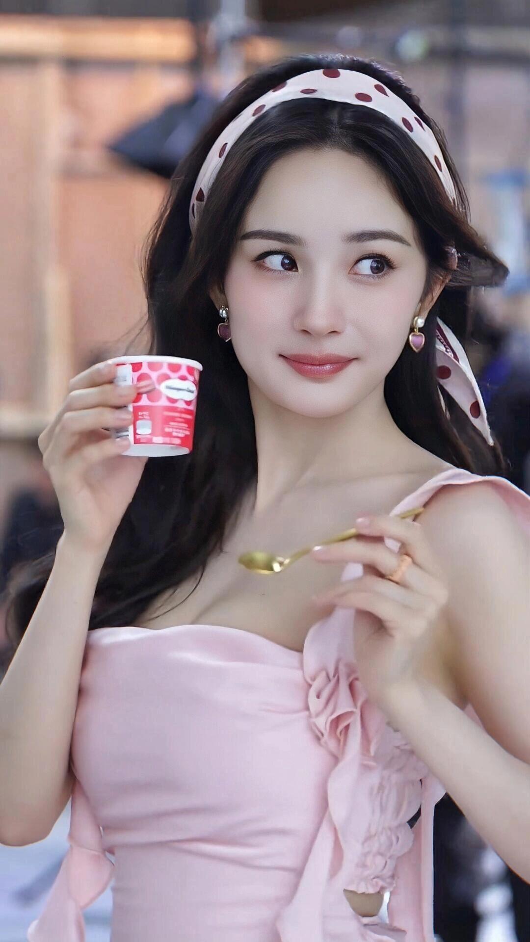 哇!杨幂侧颜杀,粉色连衣裙美翻了,夏日冰淇淋感觉太棒了!