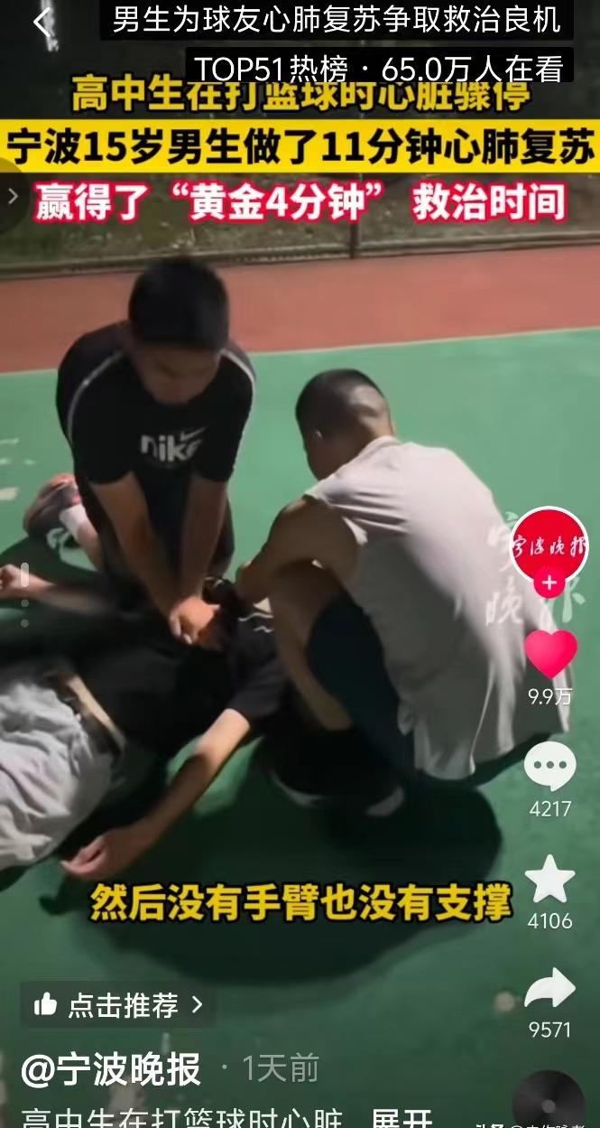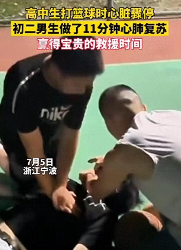 看哭了!浙江宁波,一高中生打篮球时猛地栽倒,突发心脏骤停!一位15岁初二学生立即警觉,给他连做11分钟的心肺复苏,把他从死神的手里拽回,而其他路人的反应更是让人泪目了! (来源:宁波晚报《高中生打篮球时心脏骤停,初二男生做了11分钟心肺复苏》) 没想到一名高中生竟然从死神手里抢回来一条生命,他用最佳的“黄金4分钟”为一位男孩争取了重新活一次的机会。 就在7月5日晚一名15岁的少年盛同学用他稚嫩的双手,拯救了一个即将要失去生命体征的男孩。 当时盛同学正在和朋友打篮球,没想到在中场休息的时候他发现一个男孩毫无预兆地倒在了地上。 刚开始大家都以为他是太累了便躺在地上休息,但是盛同学却觉得有点不对劲,因为这个男孩是面朝下倒地的,并不符合休息时会做的举动。 盛同学上前一看发现男孩身体在抽搐,呼吸急促且不规律,当他试图检查颈动脉时,竟然感受不到任何跳动。 在这样的紧急情况下盛同学立马跪在坚硬的水泥地上,开始为男孩进行心肺复苏。 因为盛同学的母亲是宁波红十字会的一名救护培训师,从小就带着儿子参加各种急救培训活动,所以盛同学也从中学到了很多。 盛同学冷静地表示需要周围人的帮助,他让一位大叔帮忙配合他进行人工呼吸,每当他按压30次,就让大叔进行2次人工呼吸。 同一时间周围的人也拨打了急救电话、还联系上男孩的家人,就这样在大家的配合下盛同学用所学到的知识对男孩进行救助。 在救护车来的这段时间内,盛同学没有停止过手上的动作,虽然他累的满头大汗但是他还是不间断的进行着心肺复苏。 其实能感觉到他的动作越来越吃力,因为毕竟还是一个没成年的孩子,但是不得不让人佩服的时盛同学的毅力。 因为这11分钟对于躺在地上生命垂危的男孩来说是漫长的煎熬,而对于盛同学来说,则是一场与时间赛跑的马拉松。 终于救护车赶到了把男孩交给专业的医护人员后,盛同学才如释重负地瘫坐在地上,他大口喘着气膝盖因长时间跪地而红肿发痛。 但是他的脸上却露出了笑容,因为他知道自己刚刚完成了一件了不起的事情,而这11分钟的救援不仅挽救了一个年轻的生命,也展现了“黄金4分钟”的重要性。 因为在心脏骤停的情况下,如果能在4分钟内开始有效的心肺复苏,患者的存活率将大大提高,正是因为盛同学的及时施救才赢得了这关键的4分钟。 这个事情也让人们想起不久前发生的一个悲剧,17岁的国家羽毛球队小将张志杰在比赛中倒地因为没有人进行及时的救治,导致生命就停留在了17岁。 因为我们不知道明天和意外哪个先来,所以我们更应该珍惜当下,而身边如果有需要帮助的也要尽自己的努力去帮助他人。[微风]
