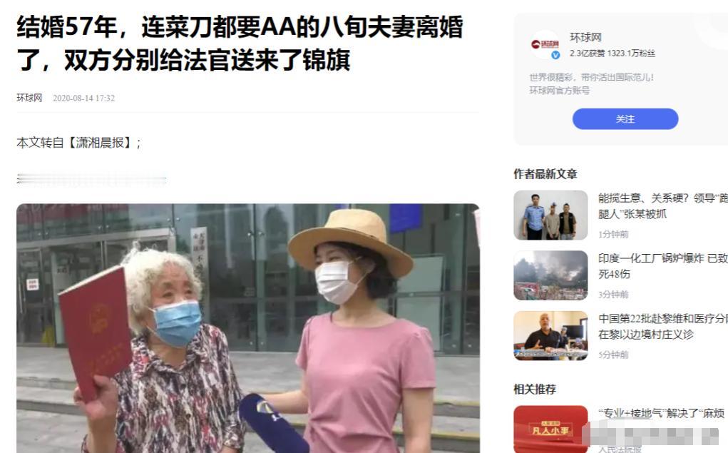 2020年,结婚57年,连买菜刀都要AA制的天津八旬老夫妻,终于离婚了。谁知刚离婚,两人就不约而同的做了同一件事情。对此,知晓此事的众人也纷纷错愕不已,都如此年龄了,还在折腾什么?法官:追求幸福都应该被支持! (信息来源:环球网 结婚57年,连菜刀都要AA的八旬夫妻离婚了,双方分别给法官送来了锦旗) 老年人也有追求幸福自由的权力,虽然现如今离婚的大多数都是小年轻,但是随着社会的发展人人平等,就算是八旬老人也想明白了渴望自由,要享受生活。 这不在天津一对结婚57年的老夫妻,终于在两人80多岁的时候选择了结束这段婚姻,在别人看来如果没有原则上的错误为什么不相互扶持走完最后的人生呢? 马奶奶和刘爷爷一个84岁一个86岁,他们刚开始结婚的时候像很多小情侣一样过着幸福又甜蜜的生活。 而慢慢的因为两人的性格差异两人的话慢慢的变少,随之而来的是矛盾不断地增加。 而彻底让他们两人之间的关系恶化的原因是马奶奶生病住院时,刘爷爷竟然没有前去探望。 当马奶奶质问他为什么不去医院看望的时候,刘爷爷说到是因为自己不会说话,怕去了惹得马奶奶更生气,对病情不好。 而马奶奶心里则是根本不相信这样的说辞,直到有一次马奶奶发现刘爷爷与旧情人走得很近,这让马奶奶对这段婚姻彻底失望透顶了。 从那时起他们虽然住在同一屋檐下,却各自过各自的,家中任何东西都被分成两份,连生活用品菜刀一类的都要分开购买,而这种“AA制”的生活方式她们持续了几十年。 其实马奶奶也想过离婚,但是因为一些传统观念的影响,担心离婚会给自己带来负面评价,也给子女造成没必要的影响,所以便选择了忍耐。 直到80多岁高龄马奶奶终于下定决心要结束这段婚姻,马奶奶想着要在房产证上加上自己的名字,这样在分割财产时才公平,而刘爷爷则不愿意。 后来闹到了法院,法官们经过多次调解最终在2020年7月27日,这对年过八旬的老人终于拿到了离婚证书。 让人没想到的时获得离婚证的那一刻,马奶奶和刘爷爷分别向法院赠送了锦旗,以表达对法官们的感谢。 真的不禁让人感慨到有时候放手也是一种解脱,离婚后马奶奶加入了社区的老年活动中心,开始了丰富多彩的晚年生活。 她积极参与各种活动唱歌、跳舞仿佛回到了自己年轻的时候,而刘爷爷则享受着独处的时光,与老友们下棋聊天。 他俩的事情然很多人都觉得追求幸福是每个人的权利,不应该受到年龄的限制,婚姻并不一定意味着幸福,有时候分开反而能让双方获得新生。 每个人对幸福的定义不同,任何人都有权利追求自己想要的生活方式,希望大家都能活出自我。[微风]