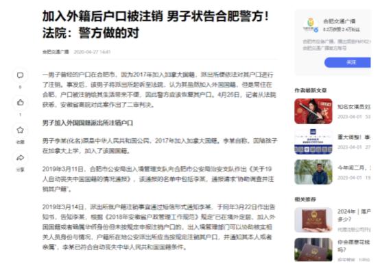 你凭什么注销我的中国国籍和户口?安徽合肥,男子因陪伴儿子在加拿大读书,两年后回国时,却被告知中国国籍和户口已被注销,男子不服,认为这侵犯了自己的合法权益,将当地派出所告上法庭…… “我要告你们去!凭什么把我的户籍信息给注销了?”一名男子在安徽合肥的某个派出所内,对着管理户籍信息的工作人员大声叫嚷着。 出国两年,回来之后国籍没了,户口也没了,这到底是怎么一回事?这名男子后续该何去何从。 (主要信源:合肥交通广播—2020.04.27《加入外籍后户口被注销 男子状告合肥警方!法院警方做得对》) 男子名叫吴大强,是合肥本地人,从小在合肥土生土长,经过几年的打拼,他在事业上也有所成就,生活条件也慢慢的好了起来。 吴大强有一个儿子小吴,小吴的学习成绩很不错,在之后选择到加拿大读书,妻子因为事业转身到了美国。 为了照顾儿子,吴大强选择也去往国外,陪儿子一块在加拿大生活,儿子该上学上学,吴大强也是该工作工作该休息休息,时不时在空闲的一天出去玩玩,在家整整烧烤啥的。 时间一晃两年过去了,吴大强感觉到在此生活的感觉还不错,于是便想着入一个加拿大国籍好了。 说干就干,没多长时间他就拿到了这一外国国籍,此时的他心里还美滋滋的,殊不知麻烦事还在后面呢。 2020年的时候,吴大强想回国一段时间,当他走下飞机的时候,一种浓烈的思乡之情充斥着他的内心,他又觉得还是自己家乡好。 而在通过闸机检查的时候,工作人员上前告知了没有中国国籍的外来人员需要的注意事项。 这些话让吴大强一时间有些懵懵的,自己土生土长的中国人,只不过是去外国了几年怎么回来就没有中国国籍了。 他带着些许的疑惑询问机场的工作人员,而工作人员则表示,国籍以及户口信息一般是不会出现变动的,除去本人已经去世,这些信息会注销外,再一个可能就是加入了外国的国籍。 而具体的情况需要到当地的派出所详细的询问,吴大强带着满脸疑惑的来到了他之前户籍所在地的派出所。 在了解到吴大强的经历之后,工作人员表示,根据相关规定,中国不允许有双重国籍的情况,而吴大强在加入外国国籍之后,便被视作是自动放弃中国国籍。 不仅国籍会失去,而且户口也会被注销,等于说是在中国没有你这个人了。 吴大强有些接受不了,那既然国籍没了,那再办个户口吧,工作人员也是愣住了,没有中国国籍,怎么能办中国户口呢?随即表示拒绝。 一些生意还在这里呢,没了户籍工作都成问题了,吴大强有些接受不了。 自己在毫不知情的情况下,国籍和户口被注销了,他认为这是侵犯了自己的权益,紧接着便出现了开头的那一幕。 法院经过审理,驳回了吴大强诉讼请求,维持了相关部门对于他的国籍以及户口处理结果,工作人员在注销前十五天,已经发去了通知,是吴大强自己没能即使注意到。 他还是不服,再次上诉,结果还是一样的,最后吴大强没有办法,只好重新加入中国国籍,但是这次的加入不仅过程非常的复杂,而且成功率没有把握。 不知吴大强是否会后悔当初的决定,关于国籍的更换,要先了解其中的相关规定,慎做打算,或许一些国家允许双重国籍的,但是在中国是不允许的。