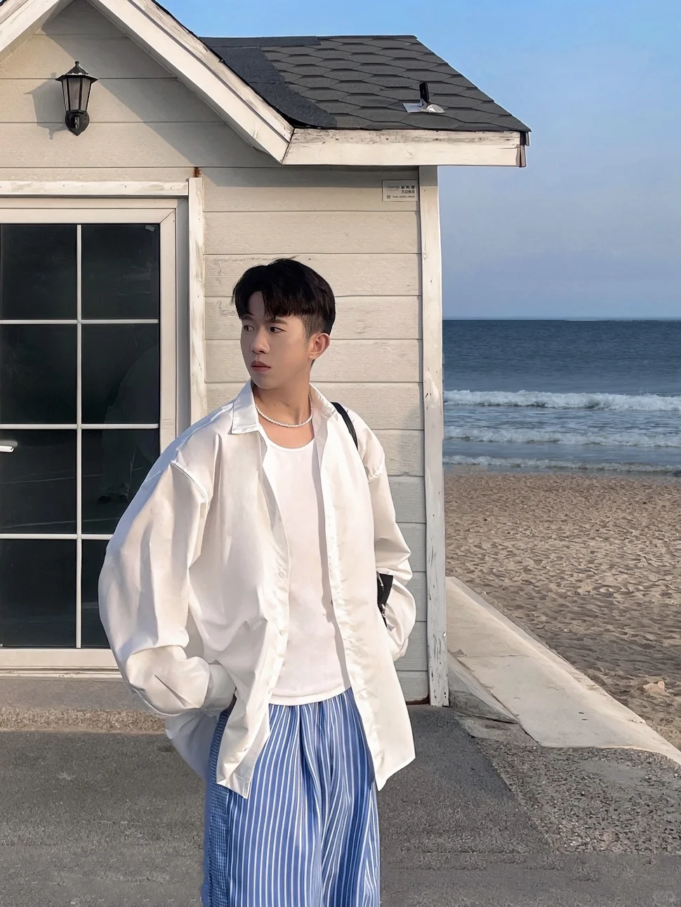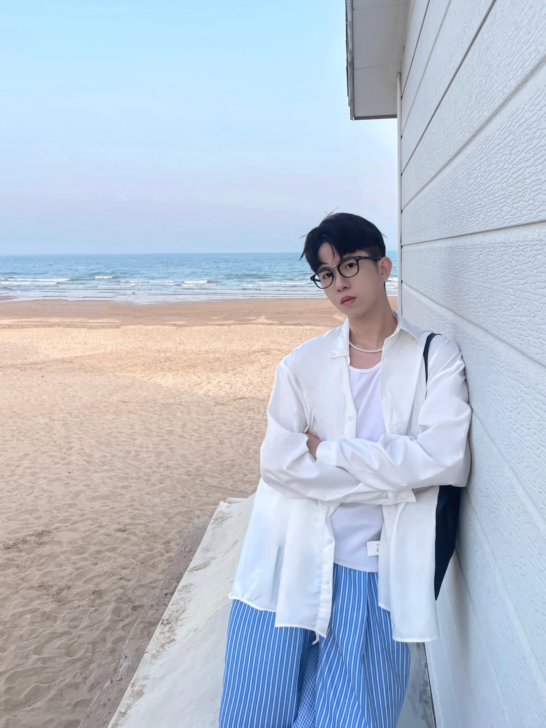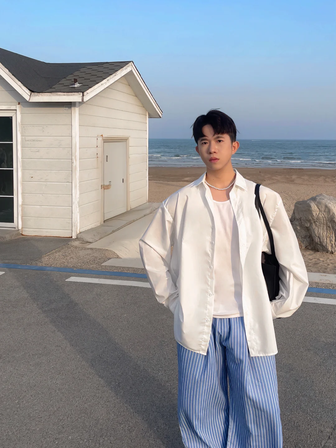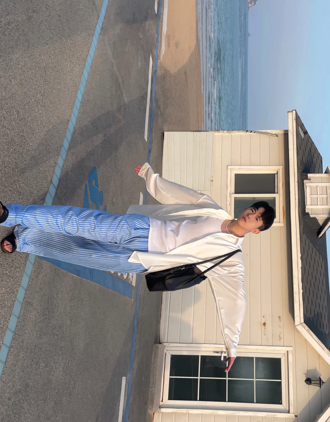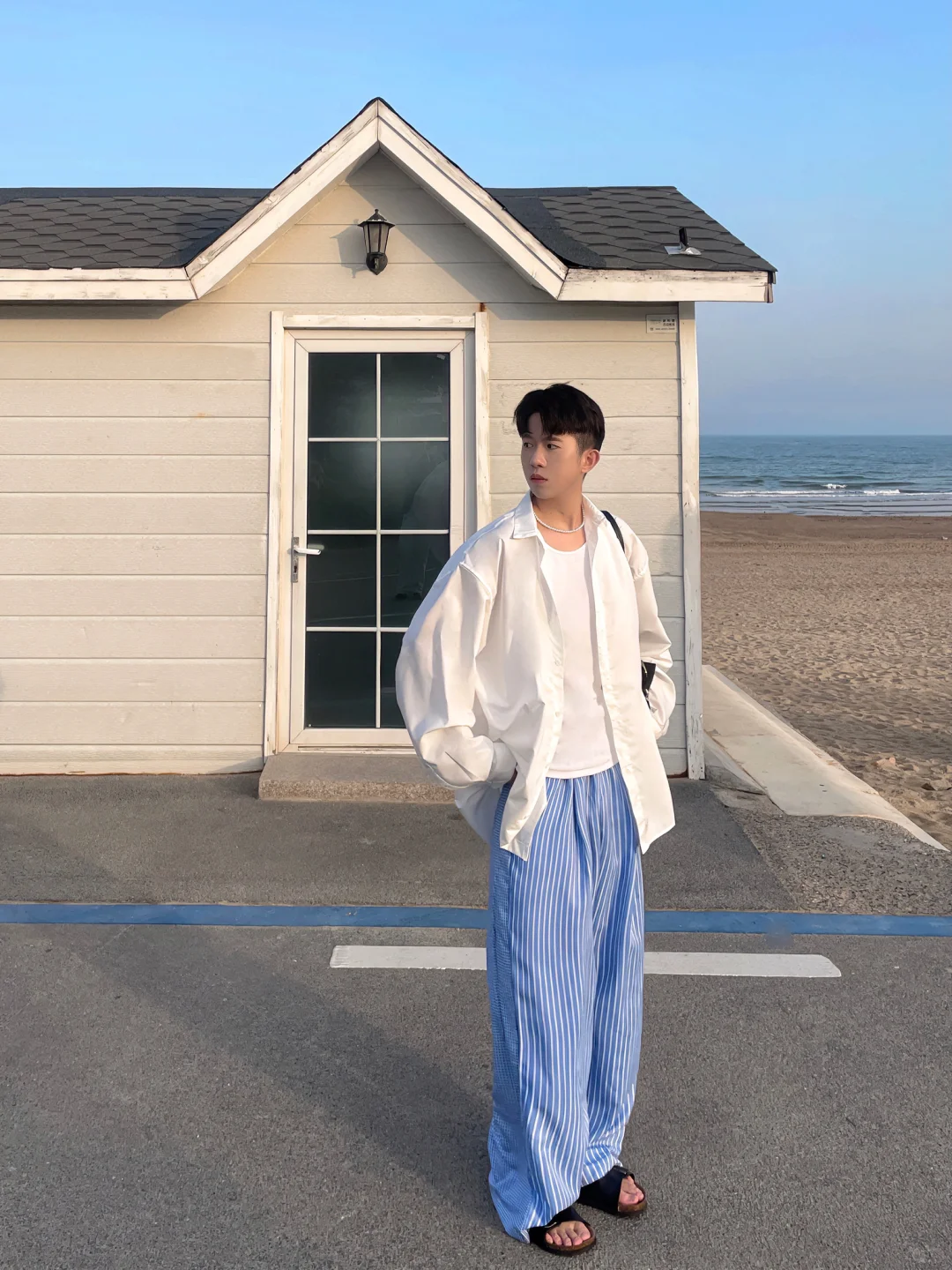 🧏🏻 淡季的青岛太美太浪漫了 从小麦岛公园走到石老人海水浴场店 不知道的以为是在济州岛 海边随便拍拍都很韩很有氛围感 . 📝穿搭建议: 白色衬衫+蓝色条纹阔腿裤+拖鞋+背心+珍珠项链 松弛感中自带慵懒 简约舒适高级感满满 度假旅游首选之一 . 记得关注我🙋🏻♂️解锁更多男生夏季的时尚潮流穿搭技巧 ——————————————————
