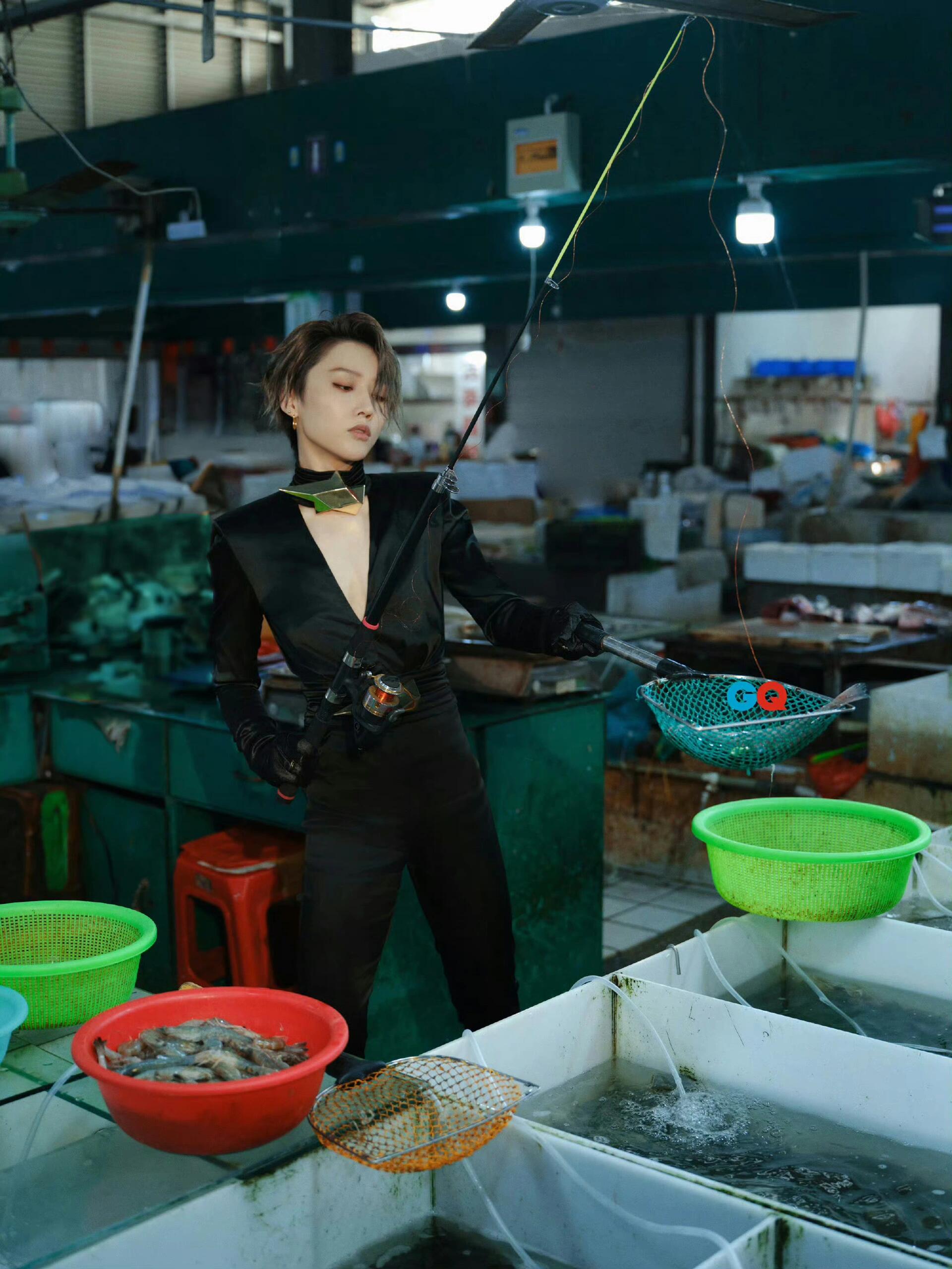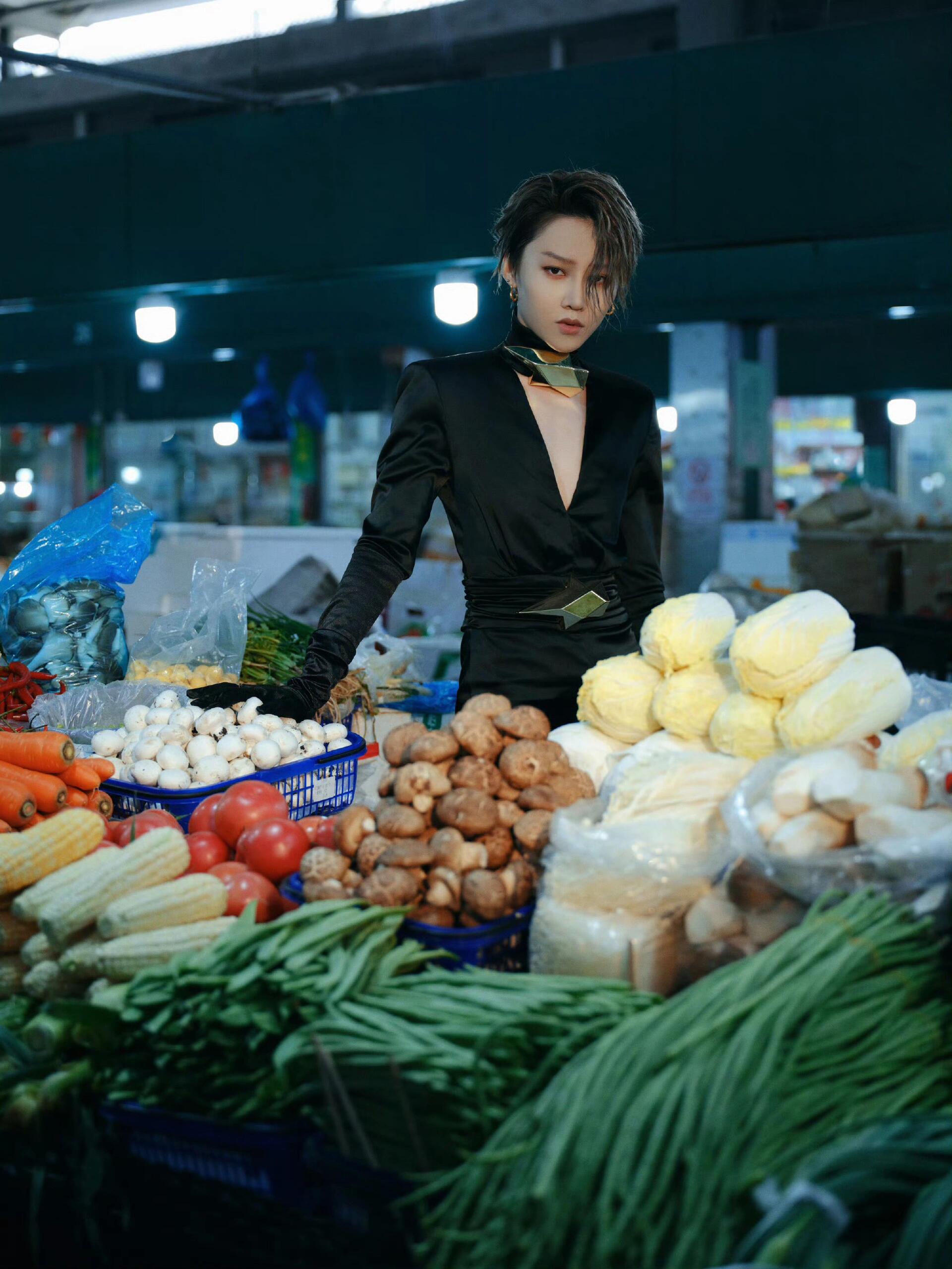 刘雨昕身穿深V连身套装,金属配饰装饰,冷冽的未来女战士现身菜市场,极具视觉冲突,时髦个性发“疯”