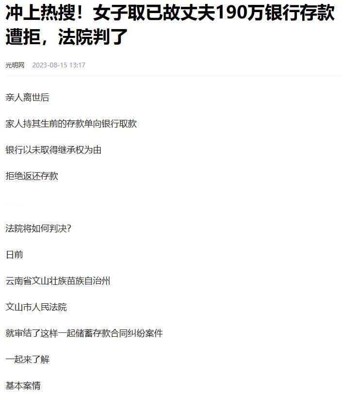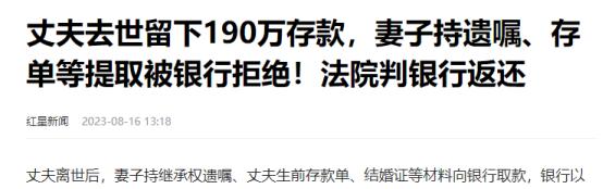 云南文山,一男子去世前,立下遗嘱,把他名下所有财产都留给妻子。可是当他去世后,妻子拿着各种证明去取他名下的190万存款时,工作人员却说她没资格继承遗产,不予取款。妻子愤怒之下,把银行告上法庭,法院判了…… “我丈夫留给我们娘俩的钱,你凭什么不给我?”银行里一名女子大声的怒斥着工作人员,而工作人员则在一旁静静的看着女子,他们的脸上写满了“规定”二字。 作为遗嘱的继承人,这名女子为何拿不到自己丈夫的遗产,而银行又是以怎样的理由拒绝了她,最后法院到底是如何判决的。 (主要信源:红星新闻—2023-08-16《丈夫去世留下190万存款,妻子持遗嘱、存单等提取被银行拒绝!法院判银行...》) 小丽和丈夫相识在几年前,两人在婚后如漆似胶,非常的恩爱,他们共同努力,终于在这座繁华城市里有了属于自己的一个小家。 两人在婚后还孕育了爱情的结晶,一家人生活的非常幸福,但是天公不作美,正当两人的生活蒸蒸日上的时候,意外出现了。 丈夫在一次体检中意外查出了癌症,并且还是晚期,这一个消息如同一个晴天霹雳一般,瞬间打碎了这个家庭对未来的一切希望。 冷静乐观的丈夫对于这件事情并没有太大的抵触情绪,也没有太多的慌张,知道自己时日无多,便有条不紊的安排着家里的一切。 小丽将丈夫的所作所为看在眼里,心疼的同时也在感叹老天的不公,丈夫将他名下的190万的存款以及其他的各种财产立了遗嘱,表示在他死后,全部归小丽所有。 做完这一切之后,他便歇息下来,明知道治疗成功的机率不高,他就干脆处理好一切,把钱留给孩子和妻子,体面地走向死亡。 一段时间过后,丈夫离世了,只剩下小丽和孩子,在处理完丈夫的后事之后,小丽拿着各种材料来到银行,希望可以取走丈夫的遗产。 没想到的时候,银行的工作人员在看完小丽提供的材料之后,表示她不能取走这些钱,需要她提供一张具有合法公证效力的继承说明书。 这让小丽十分的不解,丈夫提供的遗嘱难道不是最好的证明材料么,为什么非要有公证机构的公证书才肯放款。 接着便出现了开头的那一幕,面对小丽的质问,工作人员一再表示,这只是银行的规定,他们做不了主,刚刚经历丈夫逝去的悲痛。 此刻小丽的心情十分不好,一气之下她将银行告上了法庭。 而法院给出的意见是银行方面需要向小丽全额支付一百九十万的本金以及利息。 法官认为,遗嘱是丈夫生前的最后意愿,这里面包含着无尽的不舍和嘱托,它所具有的法律效力是至高无上的。 经过磕磕绊绊,小丽终于拿到了丈夫留给自己的遗产,虽然有这么多钱,但是她始终开心不起来,最爱她的人永远不在了。