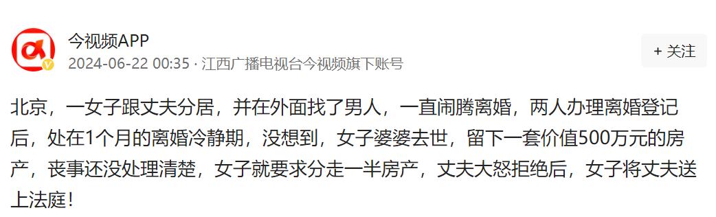 北京,一女子跟丈夫分居,并在外面找了男人。一直闹腾离婚,两人办理离婚登记后,处在1个月的离婚冷静期。没想到男子婆婆去世,留下一套价值500万元的房产,丧事还没处理清楚,女子就要求分走一半房产,丈夫大怒拒绝后,女子将丈夫送上法庭! “咱俩还在离婚冷静期,没有完全离婚,这房子理应有我一半。”一名女子怀抱双臂满怀信心的朝着面前愤怒的男人这样说道。 已经办理了离婚手续,父母的遗产对于处在离婚冷静期的二人还算得上是夫妻共同财产么?法院最后的判决又是怎样的。 (主要信源:今视频APP—2024.06.22《北京,一女子跟丈夫分居,并在外面找了男人,一直闹腾离婚,两人办理离婚登记后,处在1个月的离婚冷静期..》) 小周是在一次聚会中认识的小美,两人兴趣相投,相聊甚欢,很快便走向了婚姻的殿堂,刚开始的相处还算不错,但是慢慢的二人便发现了问题。 两人的价值观有着天差地别,也不知道当时是如何在一起的,注重丰富个人情感生活的小美时常和小周提出各种纪念日聚会什么的。 但是小周非常的传统务实,他将自己的全部精力用来创造家庭的美好未来,根本有时间和精力去满足小美各种所谓的浪漫。 两人的间隙就在这个缺口处慢慢的扩大,刚开始两人都还比较体谅彼此,但是时间一长,吵架便是两人的家常便饭,有时候小美一吵架便出门一宿,直到第二天才回来。 小周也时常在楼下,坐在车里抽着闷烟,或许他也在思考两人在当时是如何走到一起的。 当小周发现小美已经为离婚做足了打算,甚至下一家都已经找好了的时候,他明白自己的挽回都已是徒劳。 随后两人便办理了离婚手续,一个月的离婚冷静期也是民政局为了缓和夫妻关系而提供的缓冲余地,但是在之后发生的一件事,让小周不止一次的希望离婚冷静期早点结束。 小周的母亲意外离世,这让他一时间陷入了无尽的悲痛中,但是这边还要处理和小美的关系,此时的小周只好将和小美的事情先放一放,先处理母亲的后事。 这时候的他发现,母亲留下了一套价值五百万的房产,要是离婚手续完完全全办好之后,小周也没那么苦恼,可问题就出在这。 小美在知道自己婆婆离世后留下的这处房产的消息后,立即联系小周,要求婆婆的遗产也有自己的一份,这样的要求让小周怒火中烧。 自己母亲的后事还没有处理妥当,小美这会就过来要求分遗产,这是母亲给自己留的,小周当然不能与他人分享。 随后便出现了开头的一幕,看着愤怒的小周小美仿佛目的达成了一般。 但是随着时间的流逝,小美见小周始终没有动作,她也清楚小周肯定不愿意和自己分割遗产,当即便把小周告上了法庭。 经过法院的审理,认为两人还处在冷静期内,婚姻关系还没有完全结束,这也表明,小周母亲的遗产当属于夫妻共同财产,小美有权分割。 尽管小周十分的不服,但是结果应是如此,对待婚姻我们每个人都应当对其表示慎重,在结婚前的深入了解中,就要坚定对方是可以托付一生的人。