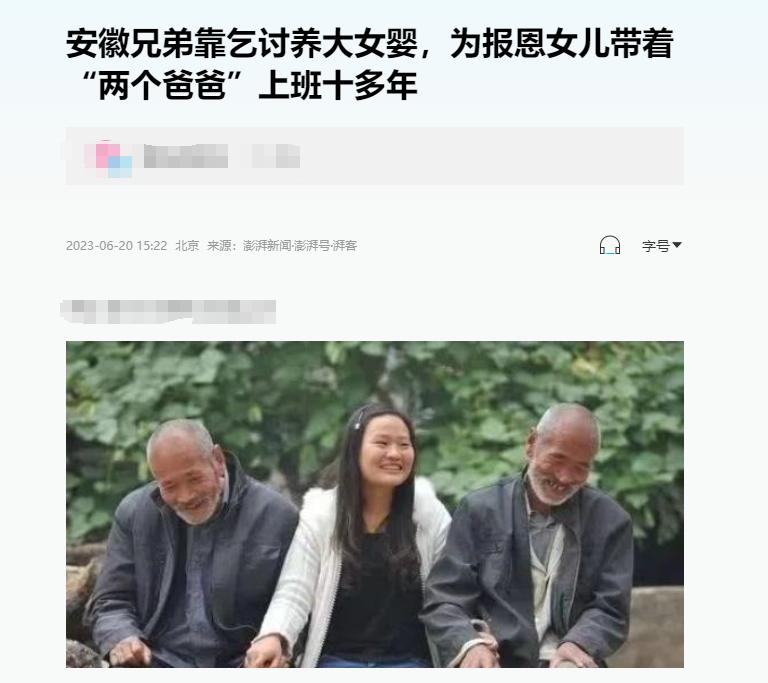 “泪目!”1988年,安徽兄弟俩在门口捡到一个刚出生女婴,没有固定收入来源的兄弟二人决定收养这个被遗弃的孩子,许多年过去之后,女婴长大成人,而她接下来的做法,使得网友们纷纷落泪。 “这是谁家孩子啊,这大冬天的怎么放这了,真可怜!”兄弟俩看着从门口抱回来的孩子面面相觑,一时间不知道该如何是好,要不就养着吧。 殊不知,兄弟俩的这个举动也是改变了他们的命运,女婴为何会被抛弃在别人家的门口,女婴在长大之后又做出了怎样的举动? 信息来源:澎湃新闻 2023-06-20 15:22《安徽兄弟靠乞讨养大女婴,为报恩女儿带着“两个爸爸”...》 那天清晨,哥哥葛保尧推开家里的大门,门口竟然放着一个不是特别大的被褥,当他抱起来的时候,赫然发现里面还有一个几个月大的女婴,随即他便叫来弟弟葛保田。 面对这个不知道从啥地方来的孩子,兄弟二人一时间拿不准主意,接着便出现了开头的一幕,虽然是决定要收养,但是家里的条件让二人不由得连连叹气。 葛家只有兄弟二人相依为命,在早些年的时候,父母就双双不在了,家境也一直不是很好,俩人也一直没有娶妻,葛保尧患有脑瘫,情况时好时坏,只有葛保田一人还能干活。 时不时的出门打些零工来补贴家用,因为哥哥的原因,葛保田也不能离家太远,他还要照顾这个家,对于这突如其来的小生命,他们也很是珍惜。 他们给小家伙取名叫葛红花,希望她可以健康的成长,像红花一样,因为年纪太小吃不了饭,兄弟二人想方设法让小红花吃上别的食物。 当时的奶粉要五块钱一袋,腰包比脸都干净的俩兄弟犯了难,最后决定葛保尧在家照看小红花,葛保田出门挣钱。 为了不让小红花受苦,葛保田什么活都干,他最喜欢的是给工地卸车,这个活是按一车多少钱给的,干得多拿的就多,有些时候,葛保田一天十几个小时卸了十几车。 虽然劳累,但是回到家看到奶呼呼的小红花的时候,他就觉得这一切都是值得的。 慢慢的小红花到了上学的年纪,苦什么都不能苦教育,这是俩兄弟这样想的,他们给小红花找了当地还算不错的小学,而小红花也非常懂事。 她知道两个爸爸希望他学习成绩好,便非常努力,每次考试都能拿一张奖状回家,俩兄弟看到后也是非常的欣慰。 意外出现在小红花上初中的时候,因为劳累,葛保田突发了脑溢血,这个消息传到小红花耳中的时候,她连课都不上了,执意要回家照顾两个爸爸。 直到葛保田身体有所好转,小红花才返回学校,尽管在家照顾爸爸们,她也没有落下课程,成绩依然是非常不错。 在考大学的时候,葛红花选择了离家较近的师范学院,一方面为了照顾老人,另一方面师范是公费的,家里不用出学费。 直到毕业以后,葛红花明明有到大城市工作的机会,但是她毫不犹豫的选择了一所山区小学,原因是校长答应她了两间宿舍,这也方便她把两个爸爸接过来照顾。 当被问到个人问题的时候,葛红花总是笑着说,要嫁就带俩爸爸嫁,自己会走到哪带到哪。 葛家兄弟在几十年前种下的善因,如今也结出了善果,希望两位老人的身体健康,葛红花用行动诠释了什么叫做“孝”。