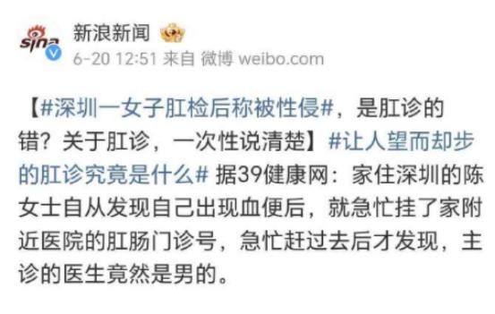 “是正规流程还是真有猫腻?”深圳一女子发现自己便血,便来到医院做肛检,不料主诊医生是男医生,在医生让其脱下裤子做完检查之后,女子越想越不对劲,感觉医生的动作不对,遂认为自己遭受到了性侵,要求医院向其赔偿二十万元的精神损失费,如何评价此案? “你就是侵犯我了,不然我裤子上的血迹你怎么解释?”一名女患者在一家医院的科室里大发雷霆,而当时给她检查的男医生站在一旁百口莫辩。 事情的经过到底是怎样的,男医生真的侵犯了这名女患者么?真相究竟是怎样的。 (主要信源:新浪新闻-2024.06.20《深圳一女子肛检后称被性侵》) 小丽是一名上班族,最近她发现自己上厕所的时候,有些便血的情况,刚开始的时候她并不在意,觉得没有太大的事情。 可是随着时间的流逝,小丽的症状逐渐变得有些严重,她便想着到医院去做个检查,这家医院的肛肠科在那天只有一个值班的男医生。 而小丽在得知这一情况后,稍稍犹豫了一下便接受了这个情况,小病不能耽搁,挂号就诊,现在这些过程还比较顺利,就在进行到指检的时候出现了一些状况。 通常指检的时候,医生需要带着橡胶手套将手指插进患者的肛门,通过手指触感来排查病情。 此时就需要患者褪去下身的衣服,这也难免将自己的私密部位暴露在医生的眼前,不过这也是不可避免的。 小丽心里挣扎了一会,这个时候男医生也看出了小丽的窘迫,并且对她进行安慰,表示医生是不分男女的。 做好心理准备的小丽趴在了检查台上,褪下了自己的裤子,男医生将所要用到的物品准备好,便开始了检查,随着手指的缓缓伸入,小丽此时尴尬的心情到达了顶峰。 好在持续的时间并不长,拿到初步的诊断结果后,小丽便离开了医院,但是回到家后她感觉到有一些不对劲,医生检查的地方有些疼痛。 当她脱下裤子的时候,发现上面还有一些血迹,这样的情况让小丽感到一丝不安,她怀疑医生在给她做检查的时候,以她不知道方式“侵犯”了她。 带着疑问,她第二天再次来到了这家医院,并且直接要求向医院的管理层反映这件事情。 而院方对于这件事情也是高度重视,立即找到当天肛肠科的值班医生进行调查,男医生对此也表示不知情,他只是按照正常的流程对小丽进行检查。 而小丽却是一口咬定,男医生就是侵犯她了,接着便出现了开头的一幕,经过医院对当天的检查过程询问,男医生也确实是按照规范的操作进行的,没有任何不良行为。 小丽当时在检查的时候也同意了这样的做法,对于医院给出的结论她并不买账,在协商无果之后,她将医院告上了法庭,要求院方对她进行20万元的精神赔偿。 小丽表示当时没有第二个医生在现场的时候,男医生就对她开始检查,这已经是违反规定了。 而男医生称当时的情况只想着如何快速地帮小丽确诊病情,没有别的他多想法,这也造成了现在这个结果。 网友们对此事的评价大多数都站在男医生的立场上,医患双方本就容易出现矛盾,应该给对方多一点信任,这样整个医疗环境才会有所改善。 也有少部分的网友表示是男医生没有考虑到对于女患者隐私的保护,应该多多的询问患者的意见。