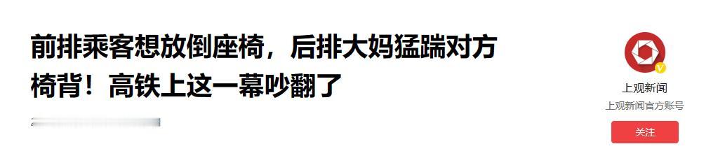 “这到底是谁有理?”在沈阳开往太原的一趟高铁列车上,一男子和后排大妈因为座椅位置吵得不可开交,期间,大妈更是拿脚往前排男子的座椅上踹,双方吵了一个多小时,最终被工作人员带走调解。 “你想放就放,挤着我了知道么!要躺着去卧铺躺去。”大妈怒气冲冲的吵得前排男子吼道,并且抬腿将前面的座椅踹了回去,从抬脚到出腿,手脚并用一气呵成。 出于公共场所的环境下,大妈的做法是否有些自私,而前排的男子是不是确确实实的侵犯后排大妈的空间。 (主要信源:上观新闻—2024.06.20 《前排乘客想放倒座椅,后排大妈猛踹对方椅背!高铁上这-幕吵翻了》) 张先生因为一些事情需要去往某地,考虑到舒适性以及性价比的因素,他没有选择乘坐绿皮火车,而买了一张高铁票,但是在车上发生的一件事情,让他感到十分的苦恼。 根据高铁站广播员的指示,张先生来到对应的车厢,找到自己的位置并坐了下来。 或许是因为这个座位上一个乘客的原因,张先生感到空间有些狭小,便想着把座椅后背往后调调,让自己舒服一点。 但是这一个举动直接惹怒了后排的大妈,对着张先生就是一顿斥责,张先生表示这是公共场所,自己有权利这么做,可是大妈就是不愿意。 张先生见状便不再理会大妈,自己强行将座椅往后调,此时的大妈还在后面喋喋不休,但是张先生不再说话。 大妈看到张先生油盐不进,嘴上脚上手上三路一起行动,便出现了开头的一幕,张先生感觉到后背有一股巨力直接将他往前推去。 受到这样的委屈,张先生也不再忍气吞声,立即站起来同后排的两个大妈理论了起来,大妈当然也不甘示弱,双方便在车厢里吵了起来。 顿时安静的车厢吵架声不断,引得其他旅客不住的看向这里,而乘务员在听到动静之后,也是急急忙忙过来劝架。 眼见公说公有理,婆说婆有理,事情有些遏制不住,严重影响了这里的公共秩序,随后又有几名乘务员来到这节车厢将双方带走进行调解。 这个事情也被同一车厢的旅客录了下来,张先生和大妈僵持了足足有一个多小时,当时的场面混乱不堪,一些旅客上前劝架,发现劝都劝不住,一点用没有。 这个视频也引发的网友们的热议。 一些网友认为大妈有些无理取闹了,明明是公共场所,你买了座人家也买了座,凭什么就你不允许你前面的乘客往后调座椅呢。 而持有另一观点的网友觉得大妈做的没有问题,座位空间就那么大,你要是往后躺,后面的乘客确实不舒服。 有些网友更是拿着自己的亲身经历来说这件事,有些时候前排的乘客仿佛根本不顾及后排乘客的死活一样,拼命的超后躺。 当然也有一些明事理的网友双方都不站,他们觉得公共场所,相互体谅,相互理解才是最正确的做法,需要向后调座位的话,和后面的乘客好好商量商量,相信不是会有错的效果。