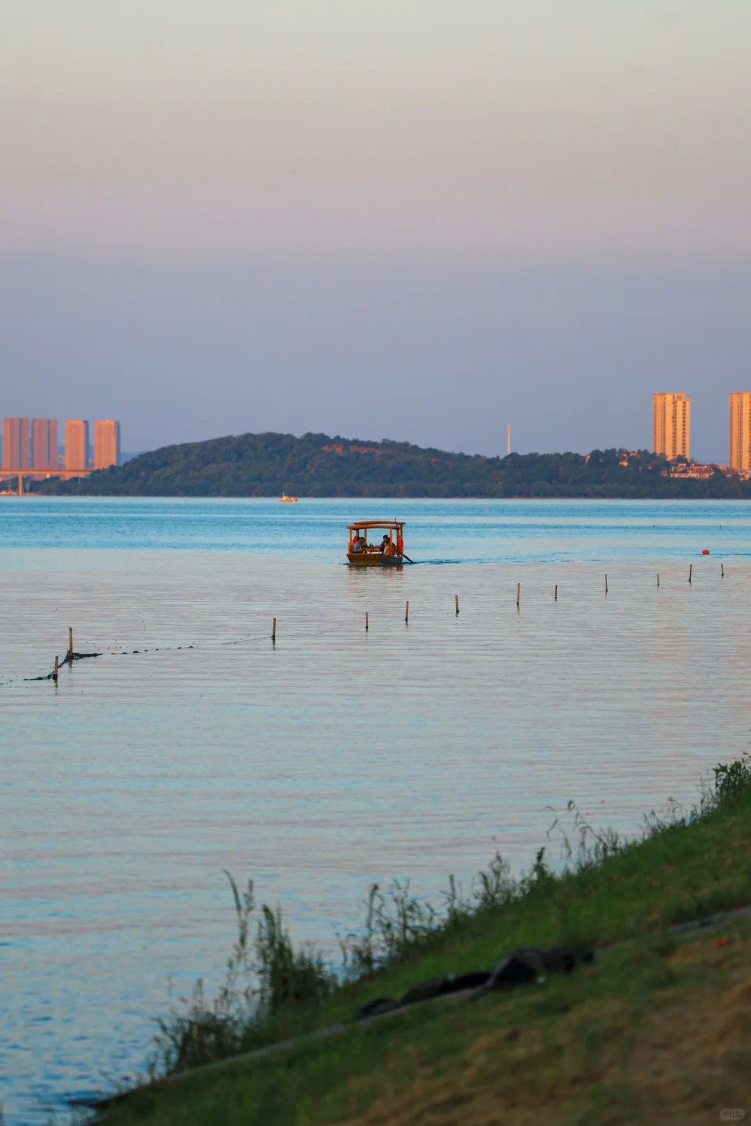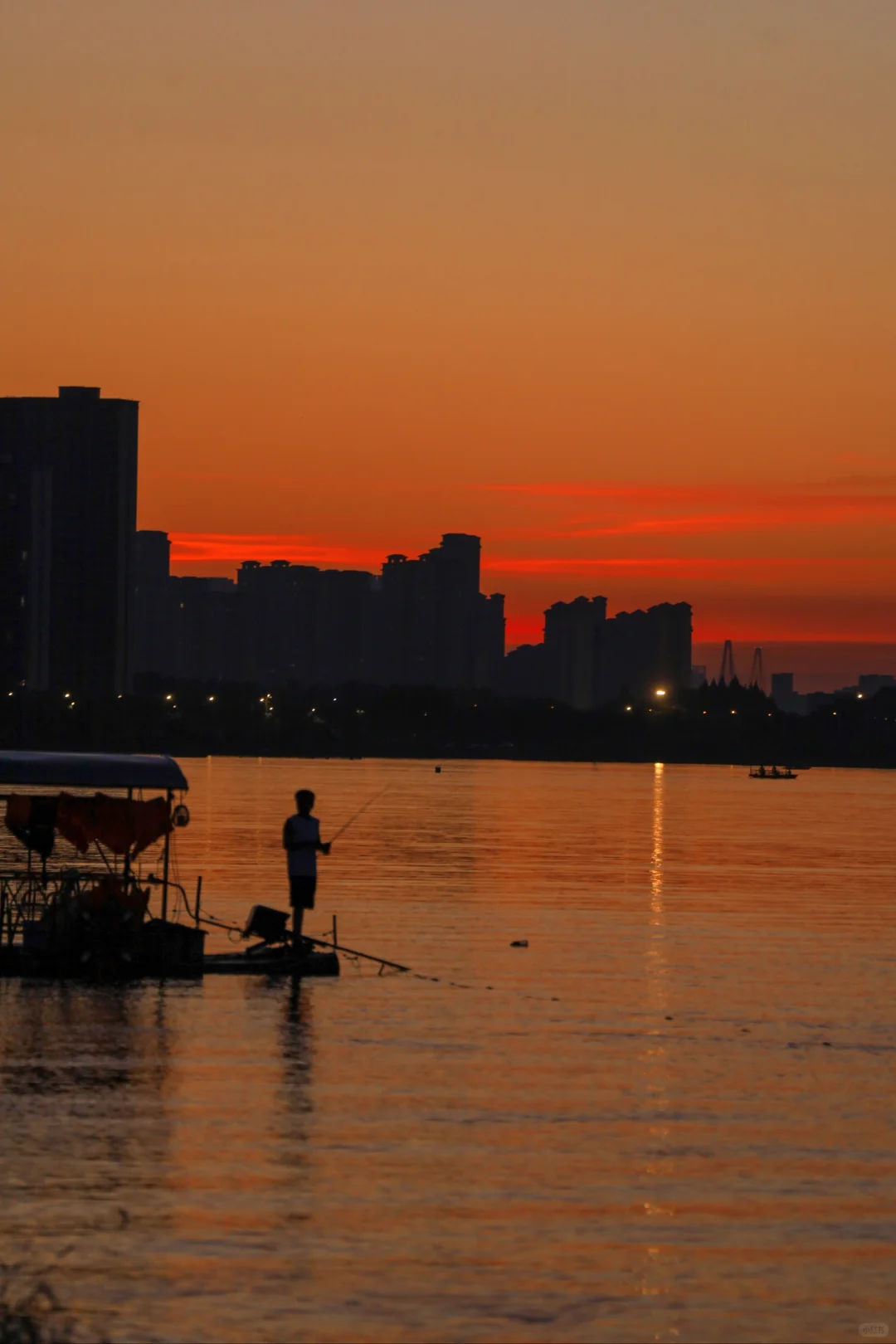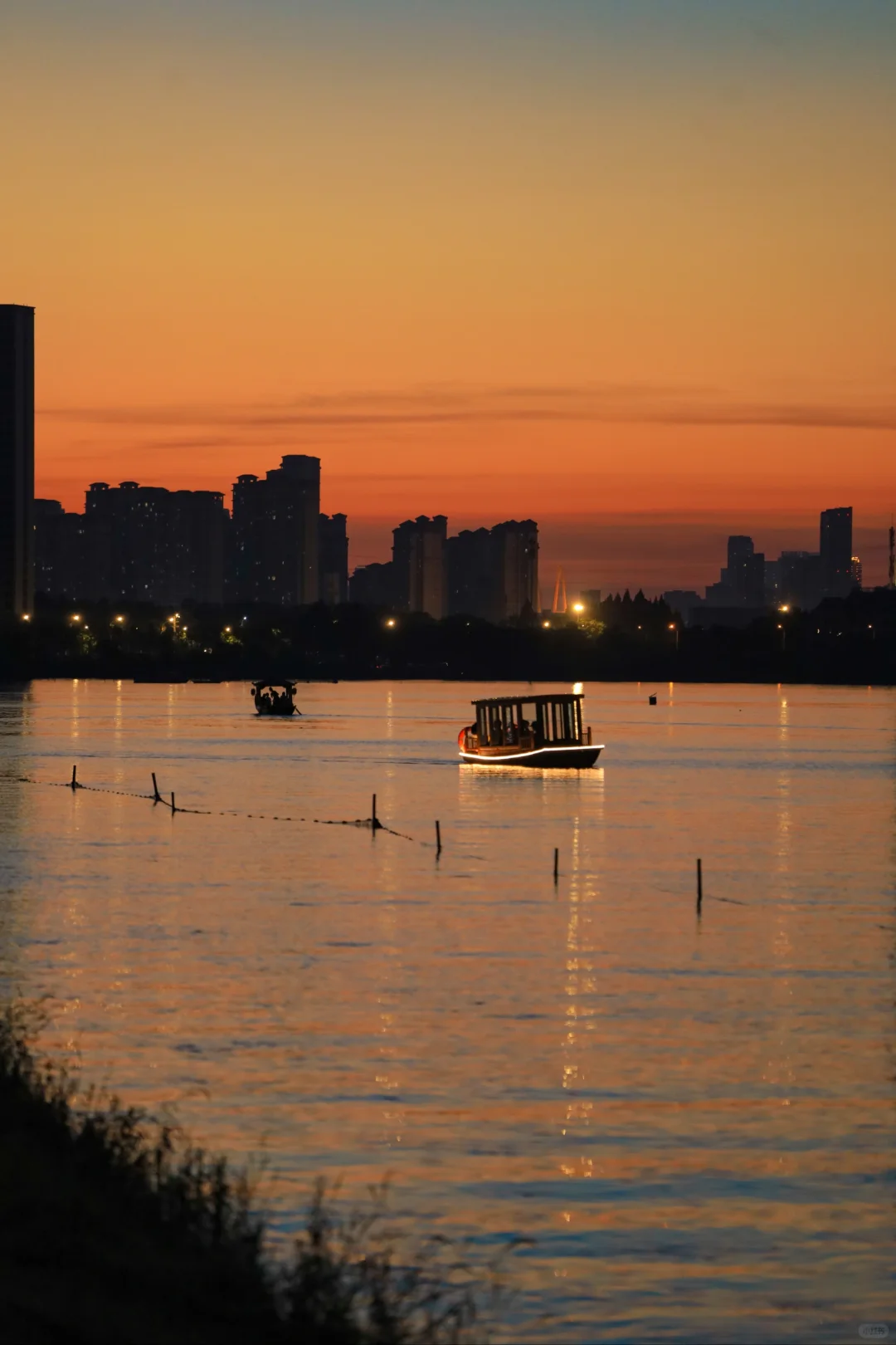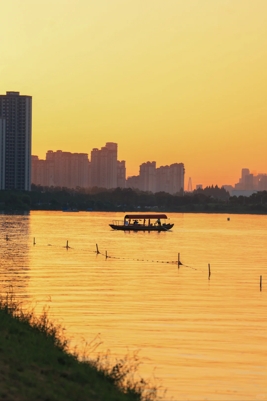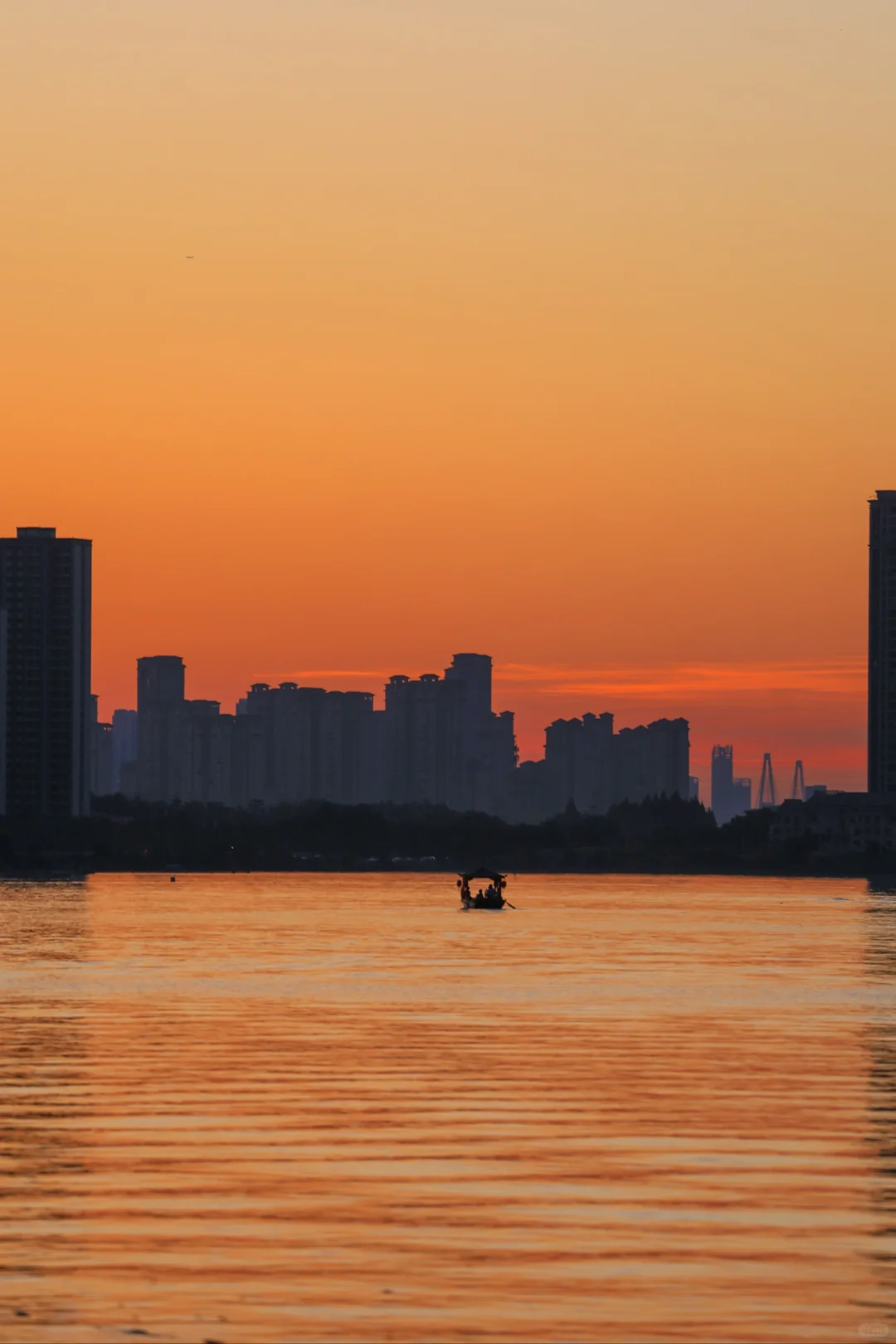 谁懂啊❗️冒着高温出门偶遇一片橘子海 渐变色的湖面和小船,氛围感拉满 蓝调时刻美的好像《爱乐之城》电影
