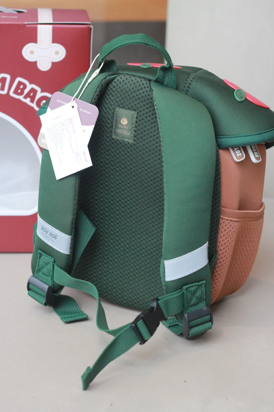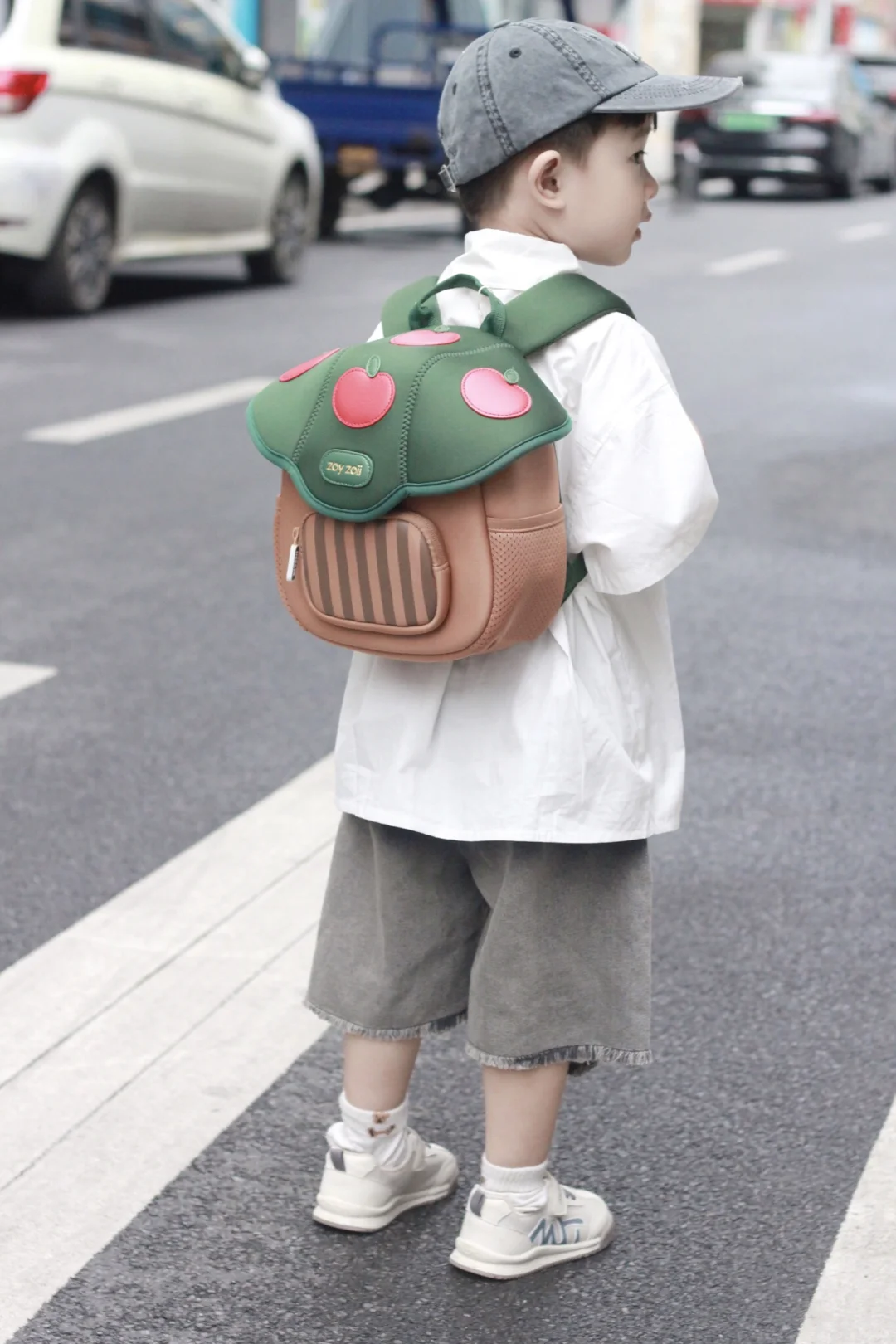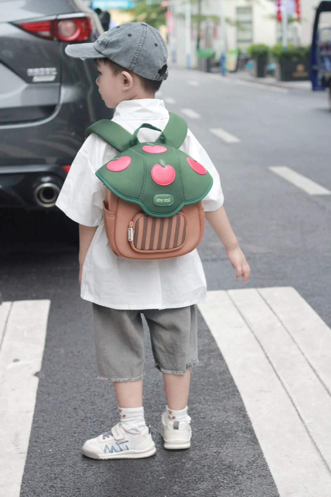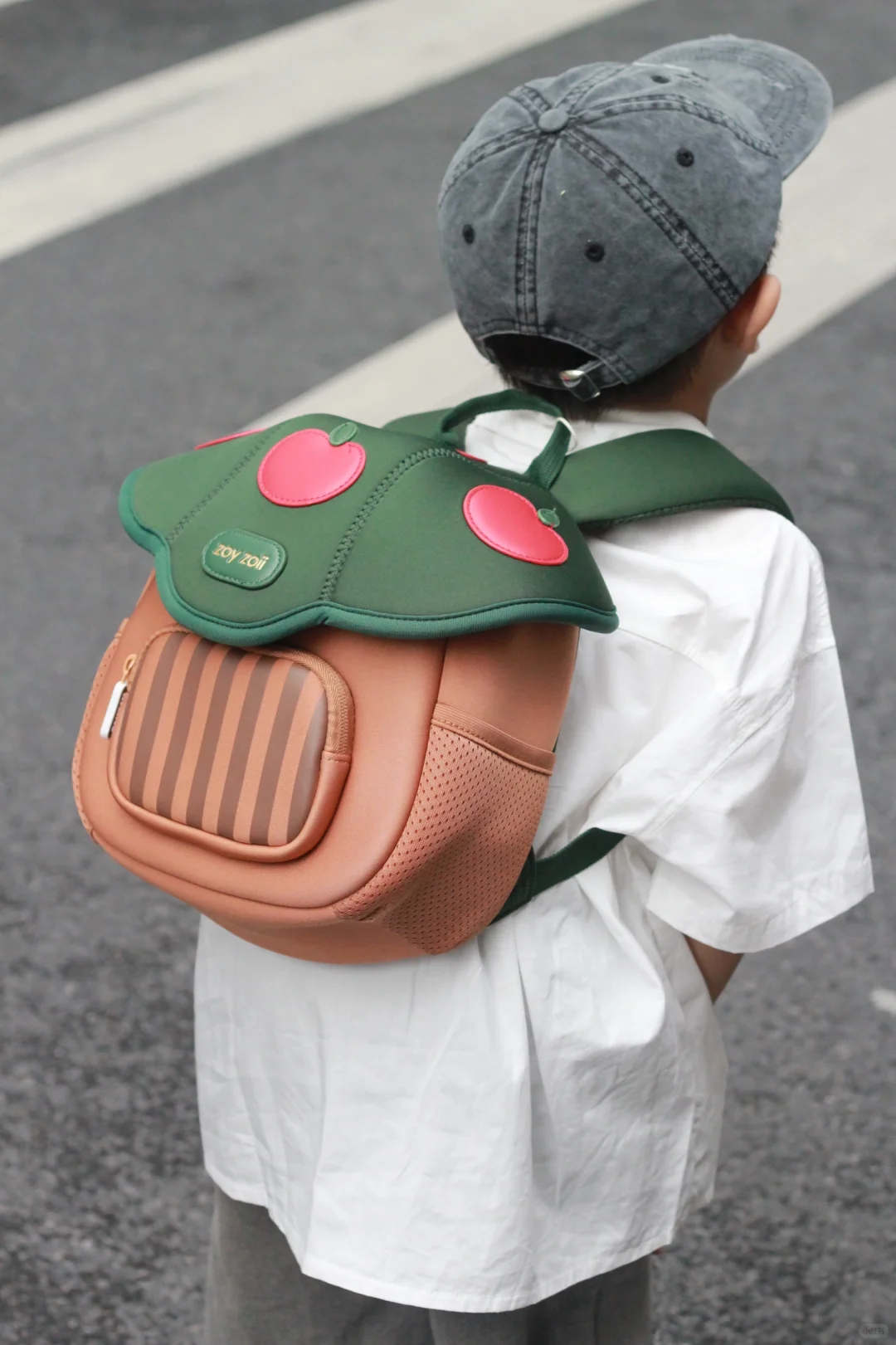 就是介个蘑菇小书包,出门走到马路上回头率超高,外观挺吸引人,不仅容量大,而且透气性好,小巧又轻便,有防滑胸扣,不容易脱落,肩带带有反光条,夜行出门也安全,有大人同款就好了,可爱又实用!!出门往包里放点小零食、水杯、纸巾、轻松就让娃背着出门~