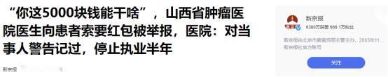 “这不是天使,这是魔鬼!”山西一老人确诊癌症,儿子找到一位有名的医生,谁知医生见面就问他能拿出多少钱,儿子给他拿了5000,他嫌太少!收下红包后,给老人开了3万元天价药,儿子发现天价药是保健品,根本不是治疗癌症的药。老人手术后,他不给开消炎止痛药,缝针也不给打麻药,老人被折磨的痛苦不堪,男子忍无可忍,找来媒体曝光,瞬间惹怒全网! “你这给的也太少了,两个领导一人2000,麻醉师1000,合着我啥也没捞着对吧?”医生当着患者的面拆开信封数了起来。 什么样的医生竟然如此猖狂,明目张胆的向患者索要红包,还嫌给的少,而这件事情的结果是如何处理的。 (主要信源:新京报—2021.07.19《“你这5000块钱能干啥”,山西省肿瘤医院医生向患者索要红包被举报,医院:....》) 张先生的父亲身体一直太好,随着时间的推移,张父的情况变得越来越恶劣,时不时地感觉头疼脑热,胸闷气短的。 张先生有些不放心,便带着父亲来到医院进行检查,不查不知道,一查吓一跳,张父患的是癌症,这一消息着实让张先生有些难以接受,好在医生表示目前癌细胞没有扩散,还有希望,张先生也没和父亲说起这件事。 而诊断的医生则表示有一家医院在这方面还是比较权威了,里面该科室的主任医师姓李,很有水平,怀着尝试的心情,张先生带着父亲来到了这家医院。 刚让李医生了解完情况之后,李医生就开口问张先生能给多少钱,张先生理解的意思是为了治好病愿意花多少,但是李医生没有多说,过了一小会张先生才反过来。 原来是李医生需要好处费啊,他当即便去拿了5000块钱递到李医生的手中,但是却被李医生嫌弃了起来,接着便出现了开头的一幕。 对于李医生的做法,张先生虽然有些尴尬,但还是赔着笑脸表示后续还会有一些别的东西,而李医生虽然嘴上嫌弃,但是手上却把这些钱收了起来。 而张父在手术缝合的时候,张先生在处方单子上没有看到消炎止痛等减缓病人疼痛的药品出现,等于说是,父亲在没有打麻药也没有消炎的情况下,直接进行了手术缝合。 而在后续李医生给父亲开治疗癌症恢复的药品时,张先生注意到价格竟然高达三万块钱,李医生表示这是“进口药”,效果比较好。 但是张先生在查询之后发现,这所谓的“进口药”只是一些普通的保健品而已,根本没有任何的治疗效果,这一发现让张先生在也忍不住心底的愤怒。 他将自己拍摄的视频发布在了网上,而网友在看到之后,群情激愤,这样只想着捞好处的“奸医”受到了网友的痛骂。 而经过网络的发酵,这家医院也表示会尽快调查,经过核实,李医生却是存在有违医德的违规行为。 院方立即回应了关于李医生处罚的结果,给予了党内以及院内的处分,并且还有半年的停业处罚,取消了相关的评选资格。 这时候网友们才发现,这个李医生竟然还是个党员,纷纷表示这样的“老鼠屎”不配受到人民群众的拥戴。 相信这家医院的医疗环境会有所改善,为人民群众提供优质的医疗服务。