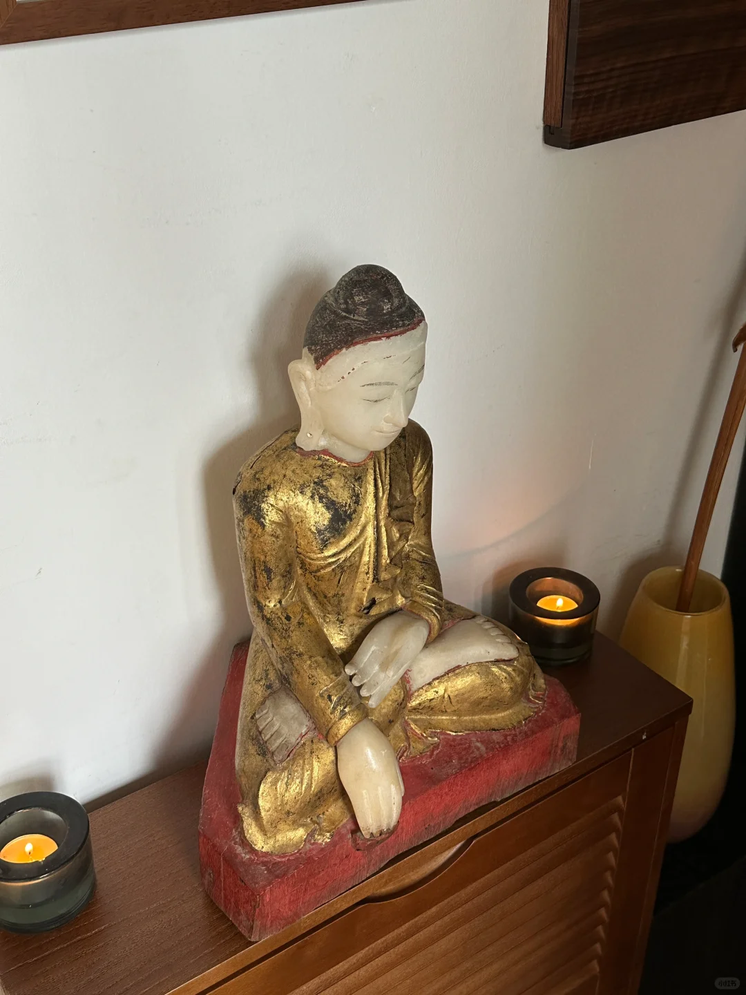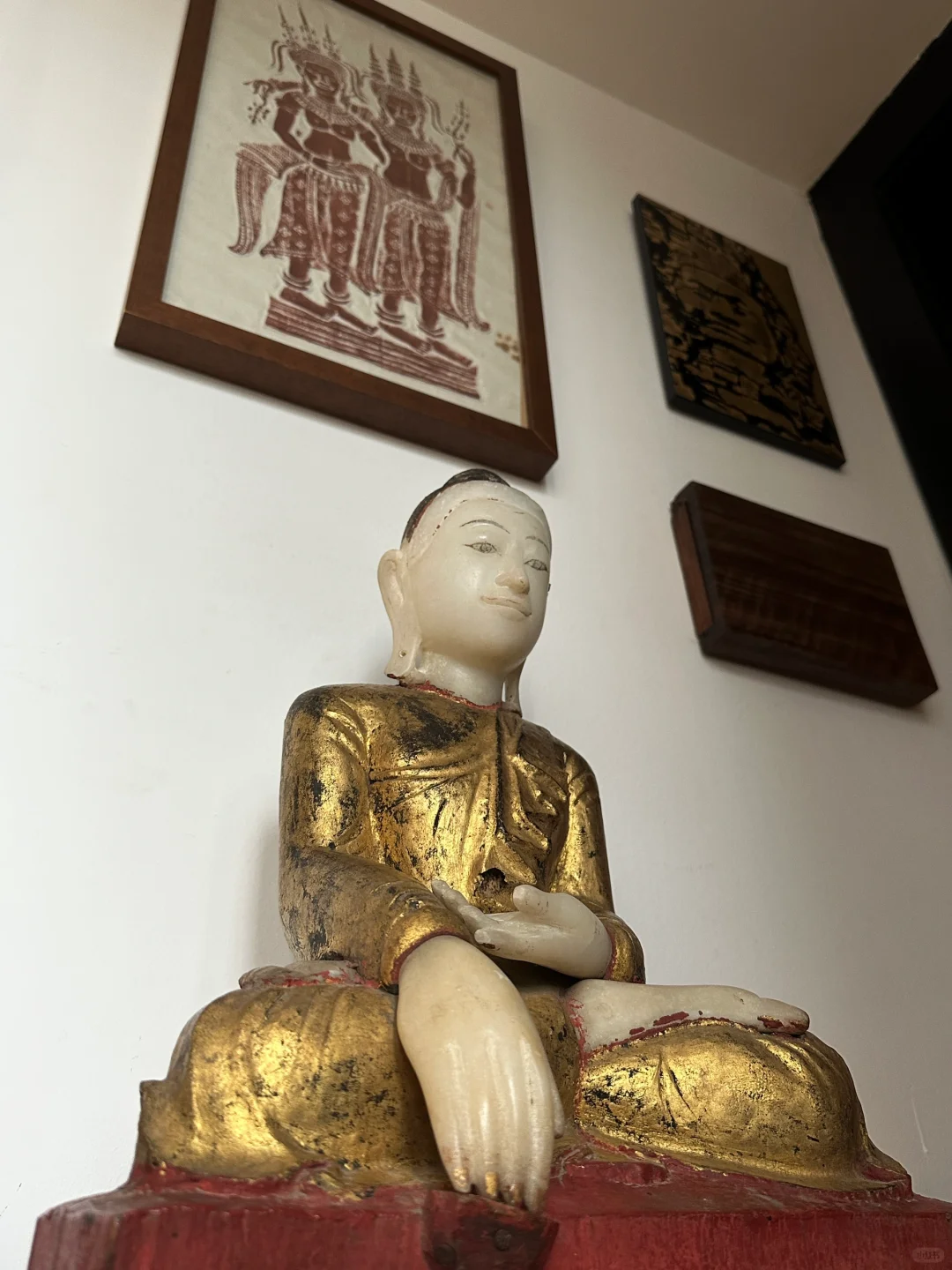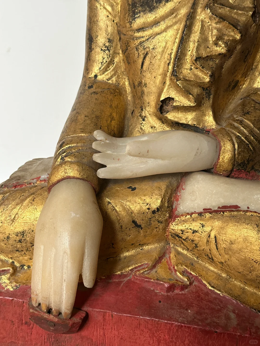 缅甸19世纪Mandalay 曼德勒风格 汉白玉释伽牟尼成道像 南传造像 佛首以及佛手足为汉白玉,佛身以及底座为木雕漆金。开脸和睦,汉白玉温润包浆自然老熟,供奉收藏都是非常不错的选择。 尺寸:高42cm、宽31cm、深21cm