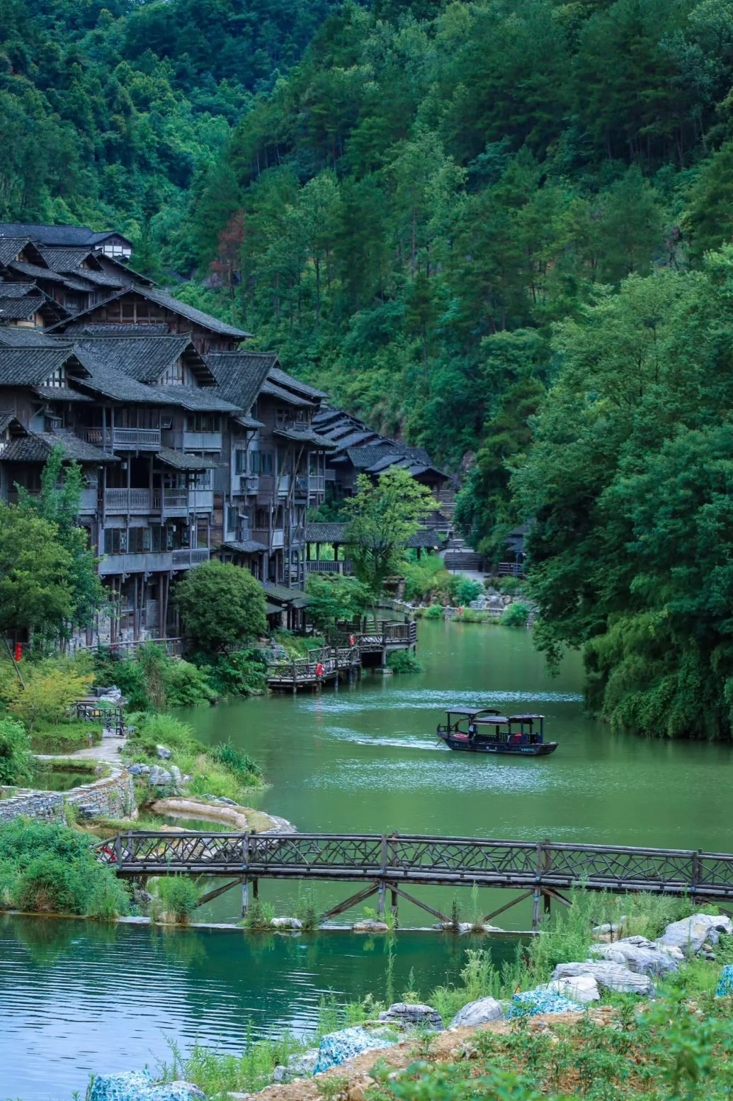 浓厚黔北民俗氛围、恬静的山水自然风光美景、小桥流水人家的静谧安逸。在这能观赏到非遗独竹漂表演,音乐水舞秀,还能体验到乘坐摇橹船、宋韵点茶、竹制作香囊、竹编、花灯、花草纸、通草堆画……