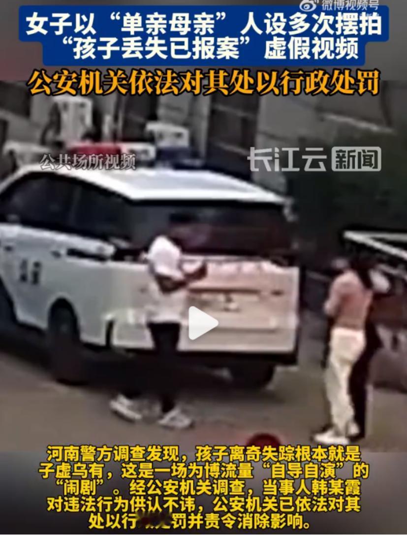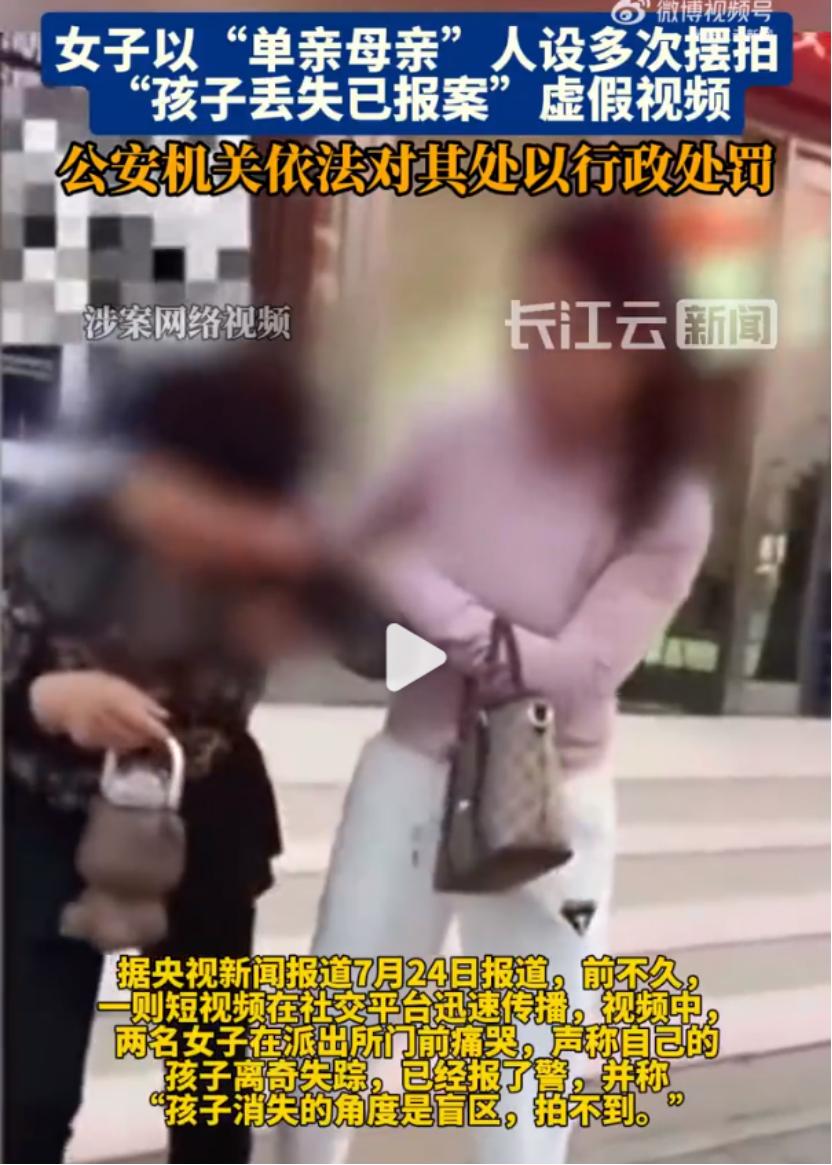 不信谣不传谣!不久前一则短视频在社交平台迅速传播,视频中的两名女子在派出所门前痛哭,声称自己的孩子离奇失踪,河南警方调查发现,孩子的离奇失踪另有隐情,网友们了解之后:应该狠狠的处理! “我的孩子丢了,目前已经报案,但是孩子丢失的地方是监控盲区....”视频的描述是这样的,而背景也是当地的一个派出所门口。 视频博主称孩子丢失的视频被警方调查之后,发现端倪,而这视频的隐情究竟是怎样的。 (主要信源:长江云新闻—2024.07.24《据央视新闻报道7月24日报道,前不久,一则短视频在社交平台迅速传播...》) 小霞是一位视频博主,近期她发布的一条视频引起了网友们的广泛关注。 画面里,小霞和她的母亲两人正在某地的一处警察局门口,母亲坐在门口的台阶上用手抹着眼泪,而小霞正搀扶着母亲,并进行安慰,她的眼神里也尽是悲伤。 这条视频本来没什么问题,情况就出在小霞视频的标题上。 小霞描写到,母亲那天晚上带孩子下楼玩耍,中途母亲让孩子在楼下待一会,自己上楼拿水杯,不到五分钟下楼之后,孩子就不见了。 并表示自己已经给帽子叔叔报过案了,可惜孩子是自己跑到监控盲区的,再后来就消失不见了。 这条消息的发出让无数的网友跟着揪心,时不时的询问小霞有没有新的进展,而小霞也在评论区对大家的关心表示感谢,称已经报过警,但是因为监控盲区的关系,孩子并没有找到。 面对网友们的支持与鼓励,小霞也是非常感激他们的关注与担心。 但是当地警方在看到这个视频之后,迅速调取了当时小霞称已经报过案的派出所的报警记录,结果发现了不对的地方。 查询结果显示,小霞并没有到派出所进行报警,也没有查到她家人的报警记录,随着小霞所拍摄的派出所提供的监控视频的证据,事情的真相也在慢慢的拨开它的真面目。 监控视频中显示,小霞一行人确实来到了派出所,但是她和母亲并没有走进派出所的办事大厅,只是在门口拍摄起了视频中的内容。 足足拍了两次他们才离开,面对警方提出的质疑,小霞也承认了这件事情是自己自导自演的虚假故事,而她的孩子也h只是让丈夫带走了而已。 她这么做的目的是为了什么呢,原来小霞是为了涨粉丝涨流量才这么做的,为的就是博取网友们的同情心,借此来让自己出名。 网友们在听到事情的真相后,恨得咬牙切齿,表示这种行为必须重判、严判。 而警方也对小霞进行了了行政上的处罚,并且对其批评教育,令她消除这件事情的影响。 在如今短视频流量疯涨的时代,消息的传播速度也不是一般的快,造成的影响短时间内就会扩大,造成社会公共资源的浪费。 这类事件在如今的社交平台上非常的多,虚假摆拍毫无底线,著名的“猫一杯”事件就是典型的例子,自导自演了一场中国小孩国外丢失作业的虚假事情。 这也导致当时社会公共资源被大量的浪费,最后的结局就是博主出面向公众道歉,并且她的高粉丝账号也被平台永久封禁。 打击虚假宣传也是为了维护社会的安定,以及公共资源不会被非法滥用,不然时间一长,公众对于这些事情麻木了,那么“狼来了”就会是最后的结局。