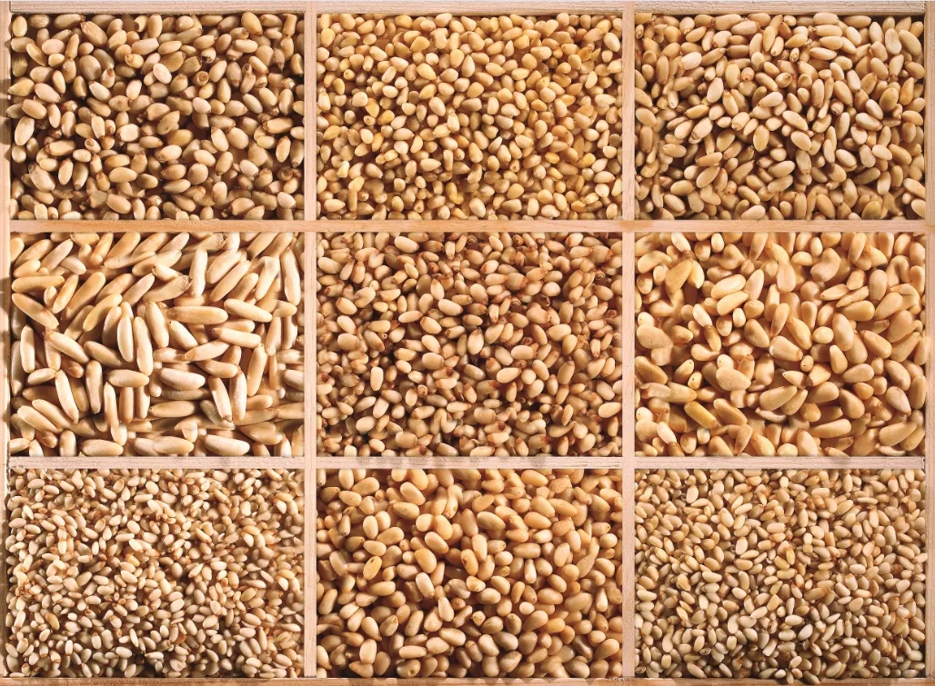 一个九宫格里整齐码了这么多种黄色果仁,长的、扁的、圆的,这些居然都是松子?什么地方可以集齐这么多种松子?有一座会聚了来自全世界松子的东北小城——吉林省通化市的梅河口市。油松、华山松、红松、马尾松,不同松树的松子样子很不一样。全世界各种各样的松子都在梅河口进行加工,最后又从这里销往世界各地。可以说梅河口市是“松子贸易帝国”。果仁巧克力、坚果蛋糕……西餐桌上可少不了吉林松子。