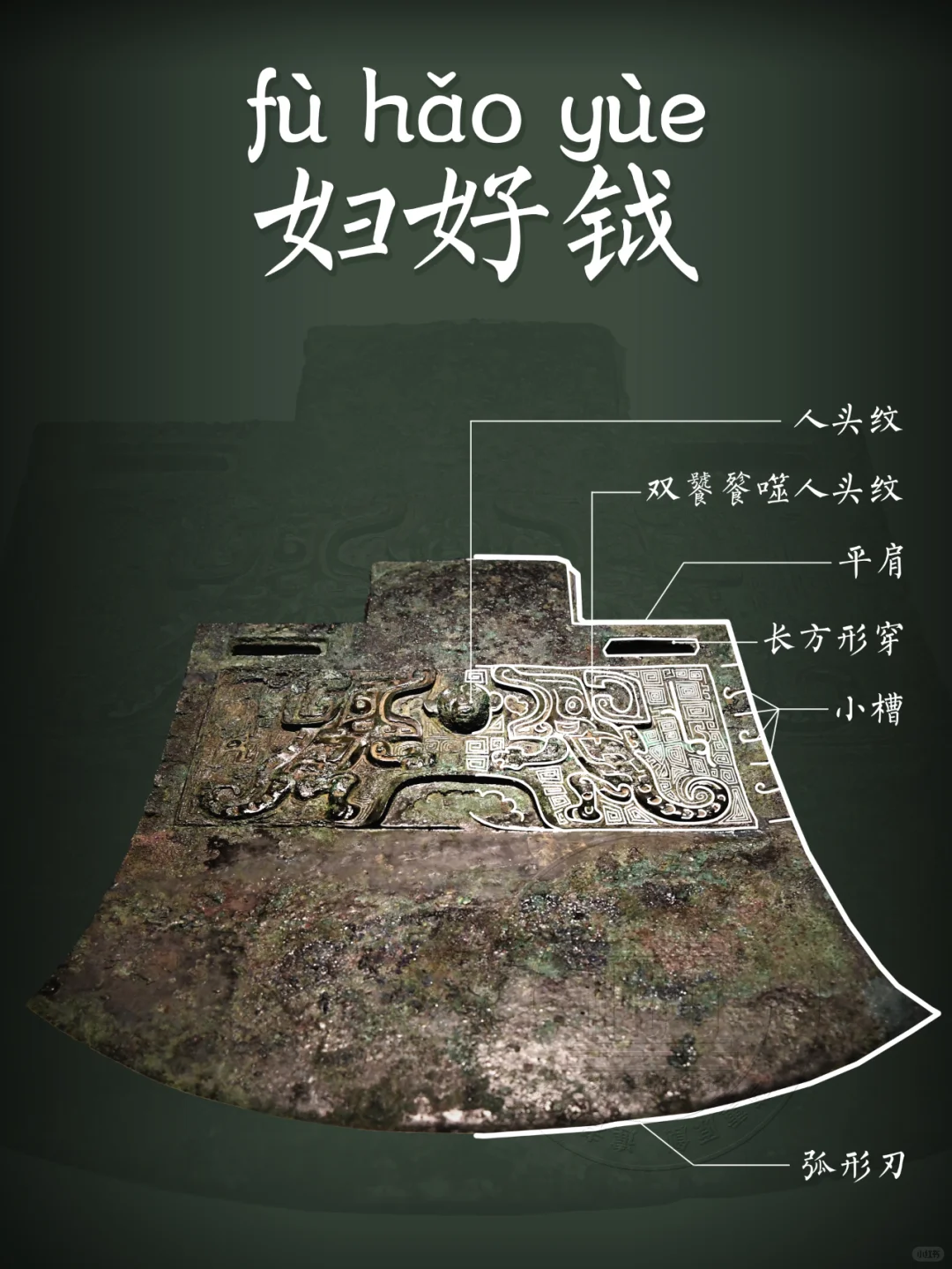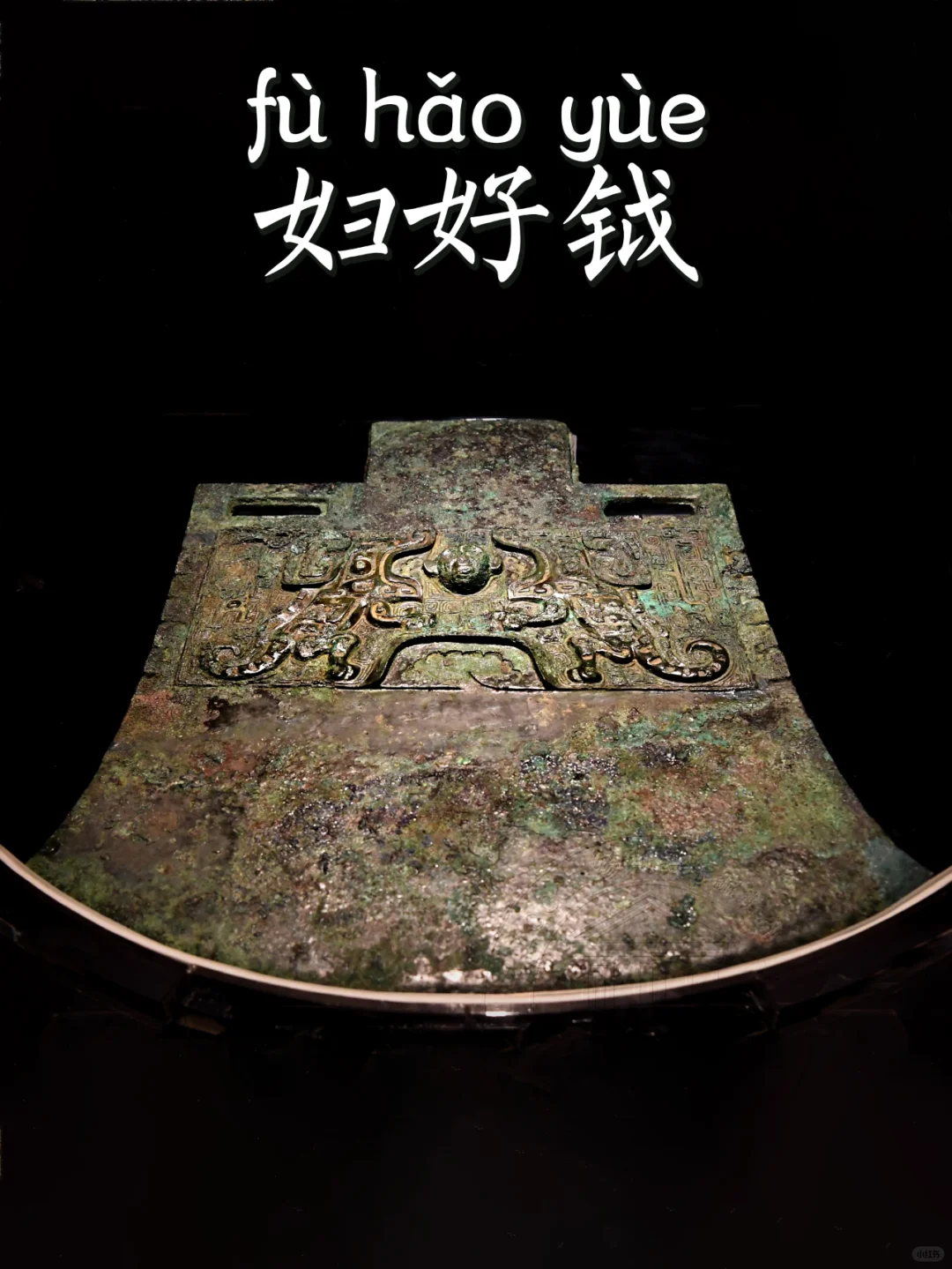 📍实际上,妇好墓出土的青铜钺共有四把,其中两大两小,大钺正是上图的青铜钺,这两把青铜大钺分别重9千克和8.5千克,如果再加上木柲,其重量都在10千克以上,是目前发现商代体型最大,纹饰最为复杂的青铜钺。加之,其上有“妇好”二字铭文,通常被认为是妇好所用之器,而闻名于世。