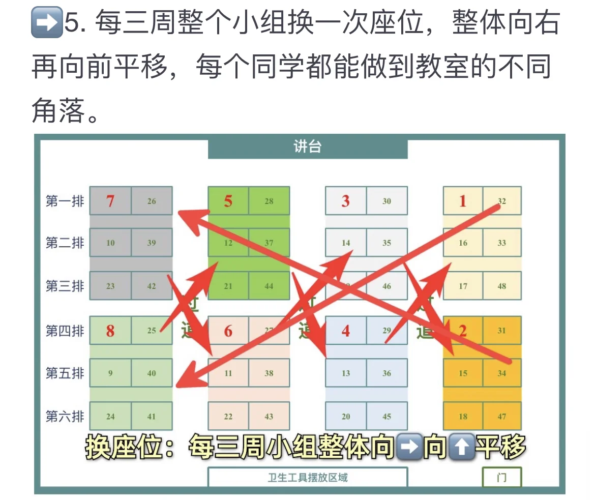 ➡️5. 每三周整个小组换一次座位,整体向右再向前平移,每个同学都能做到教室的不同角落。