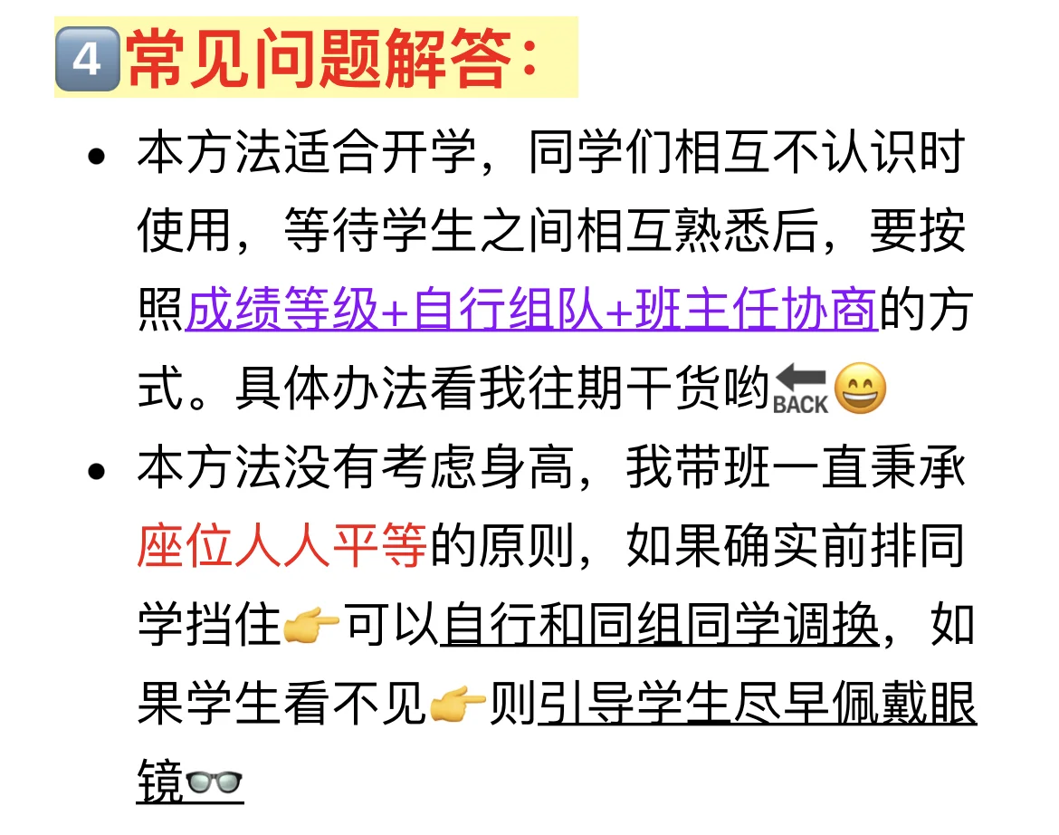🍃本方法没有考虑身高,我带班一直秉承座位人人平等的原则,如果确实前排同学挡住👉可以自行和同组同学调换,如果学生看不见👉则引导学生尽早佩戴眼镜👓