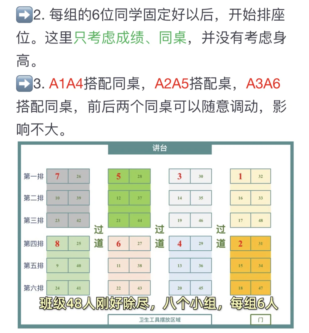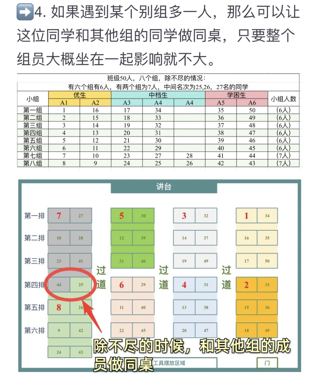 ➡️4. 如果遇到某个别组多一人,那么可以让这位同学和其他组的同学做同桌,只要整个组员大概坐在一起影响就不大。