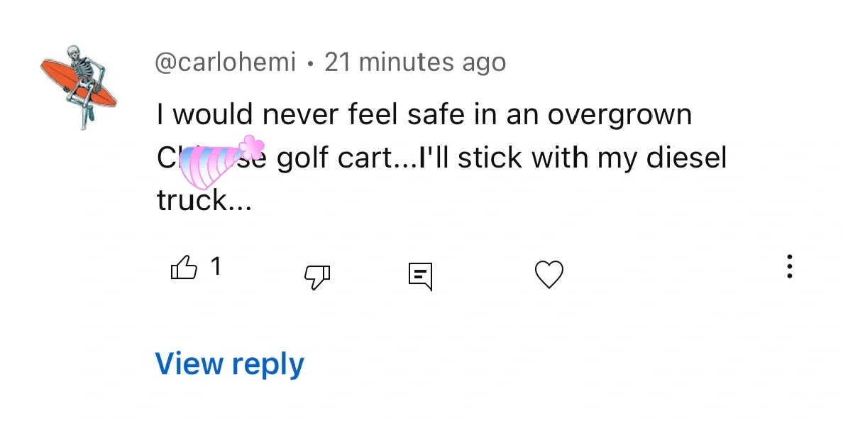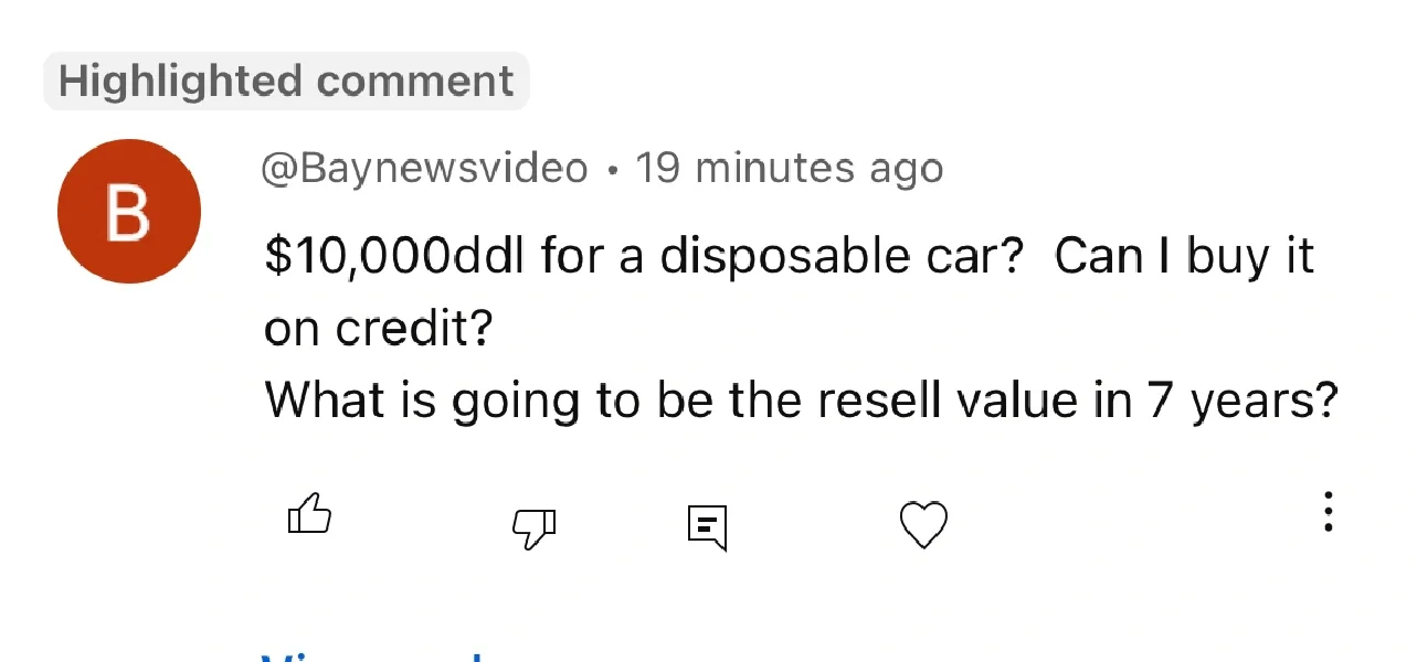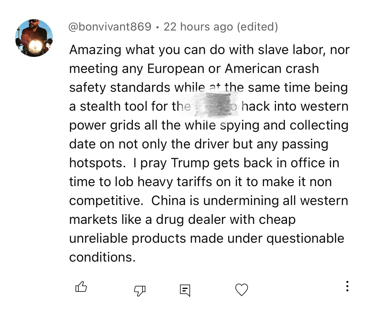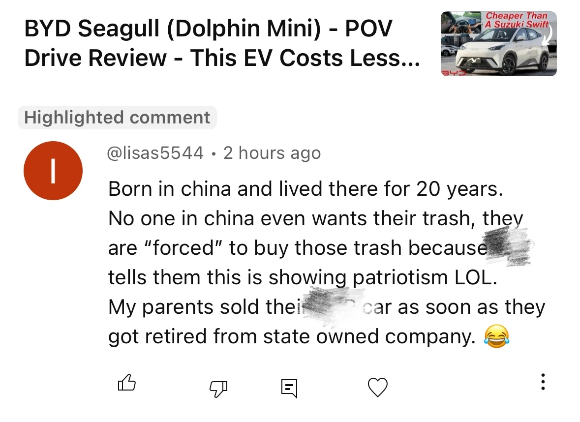 编辑:现在视频已经到30k观看,对于我的小频道算很大的流量了。➕又加了一些最新的评论的图片,大家图一乐就好,是国外媒体一个针对BYD Seagull的公关新闻引来了各位大哥评论,他们普通民众肯定是很反对国产电动小车的,当然,他们也只是了解了最基础的比亚迪海鸥就破防,那我真不知道他们看了极氪、理想、方程豹、仰望一众会如何反应?
