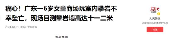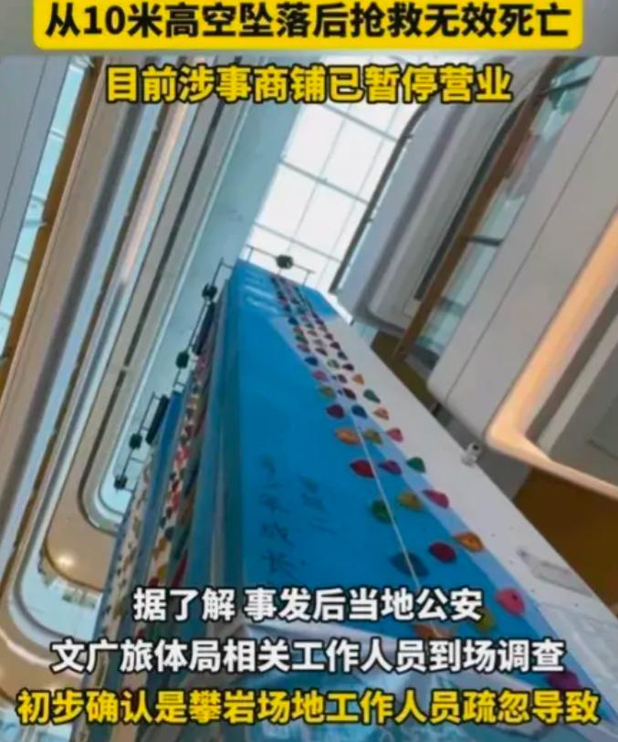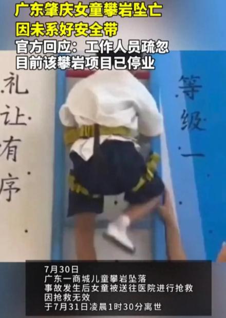 广东肇庆,女子带着女儿到商场参加攀岩活动时,工作人员竟然因疏忽大意,仅为女童戴了安全帽,没有为其系安全带。女童最后坠落,导致死亡,当地主管部门关停了该项目。网友们气愤的表示,太不负责任了!必须要追究刑事责任! 7月30日李女士(化名)永远的失去了自己的只有6岁的女儿,而且她还是亲眼看到自己的女儿是怎么从高空掉落的,尽管自己再着急,也是无能为力。 当时在场的所有人,看着这个小女孩躺在地上流了一滩血,身体还不自主的抽搐着,但是都不知道应该怎么办,站在原地也不敢碰,等着救护车的到来。 (信息来源:大风新闻2024-08-01《痛心!广东一6岁女童商场玩室内攀岩不幸坠亡,现场目测攀岩墙高达十一二米》) 在当天因为李女士带着女儿去逛商场,女儿刚开始是不乐意的,但是她突然想到商场有自己最喜欢玩的攀岩,所以母女俩就高高兴兴的去了商场。 到了攀岩的地方后,女儿在工作人员的陪同下,熟练的穿上攀岩的装备,因为这个地方她已经来了好几次,而且妈妈还给她在这里办了卡,所以对一切的流程都很熟悉。 但是没想到这一次看似平常的攀岩,竟然让女儿丢了性命。 当时女儿因为工作人员的疏忽,只佩戴了安全帽就进行了攀岩,最重要的安全带工作人员并没有给她进行佩戴。 因为女儿多次在这个地方进行攀岩,所以整个过程都是轻车熟路的,等到了最高点的时候,因为没有安全带导致跌落下来,直直的摔在了硬地板上。 送往医院的时候人已经不行了,不管李女士再怎么后悔,事情都已经没办法挽回了,他只能选择接受这个结果。 这件事一发生后很多人都表示,这里的工作人员也太不负责任了,高空项目安全带这种最重要的东西竟然都能忘记,他们是不是只是打暑假工的,根本对这件事就没有上心。 后来当地的有关部门介入,他们对场地的设备进行了检查,发现这些设备并没有任何问题,就是因为工作人员的疏忽,导致的这场悲剧的发生。 官方回应目前此项攀岩项目已经停止营业,同时有很多网友在说这个妈妈当时为什么没有发现,是不是眼睛里只有手机了。 还有的网友认为举办方是跑不了的,但是家长让孩子参加这么危险的运动还不看好,作为监护人肯定也要为女儿的去世负责。 确实像攀岩、蹦极、跳伞这一类的高空危险运动,本身就应该在开始前做好充分的准备,保护措施是需要检查再检查的,毕竟一个微小的细节就可能造成无法挽回的结果。 特别是小朋友玩一些危险的项目是,作为家长更应该把注意力放在孩子身上,时刻关注孩子的一举一动,不要等到出事了开始后悔。 对于这样的事情各位有什么看法呢?