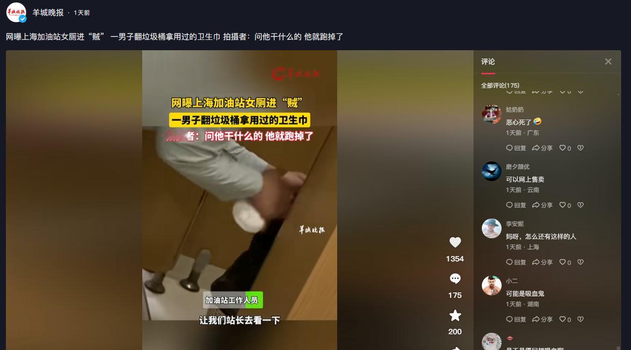 “太变态了!”上海,一女子到加油站加油,顺便去上厕所,没想到刚走进女厕,就发现个鬼鬼祟祟的男人,正在垃圾桶翻找带血的卫生巾!她立马偷偷拍下证据,随后说道:你干什么的?男子被吓一跳,低头逃走!女子没能追上,随后将此事告诉了加油站,工作人员直呼:有点变态了…… “你在干什么,要不要这么变态呀”,王女士(化名)在厕所里对着一位男人说道,男人听到声音后明显被吓了一跳,反应过来后低着头往外跑去。 王女士也是一脸懵的站在原地不知道要干嘛了,在7月30号的时候,王女士开车去办事,发现油不多了,便想着拐到加油站去加个油。 (信息来源:羊城晚报2024-07-30《网曝上海加油站女厕进“贼” 一男子翻垃圾桶拿用过的卫生巾 拍摄者:问他干什么的 他就跑掉了》) 这时候一切都是正常的,加完油后,王女士准备在加油站上个厕所,没想到就遇到了极其奇葩的事情。 当时王女士进到女厕后,发现一个背影正在厕所的隔间那里不知道干什么,刚开始王女士以为是保洁阿姨,所以就没当回事。 谁知道就在她准备进入其中一个隔间时,才发现这个人是个男的,王女士吓了一跳,以为自己走错了,但是确认之后发现自己并没走错。 更让王女士大跌眼镜的是,这个男人竟然在翻厕所的垃圾桶,而且手上还拿着带血的卫生巾,不知道他要干什么。 王女士偷偷拿出手机将这一幕录了下来当成证据,然后就出声说你在干什么,这时女卫生间你翻垃圾桶该干嘛。 这个男人听到后一下子就低着头撞开王女士跑了出去,等王女士追出去的时候人也不见了。 王女士便将自己拍到的证据和事情的经过,跟加油站的工作人员说了,所有人都很不理解他这样的行为。 甚至觉得一阵恶心,工作人员表示会向领导反映,看怎么处理这件事情。 现如今为什么变态越来越多,在7月29日的时候刚出现过一个男子跑到别人家的门口,对着人家的鞋又是闻又是舔的。 当时的女子还以为自己的鞋子莫名其妙的不见,谁知道看了监控之后,简直把自己给惊呆了,这人到底是什么癖好,如此的奇葩。 还有之前的各种偷女士内衣内裤的变态,也是频频的出现,这些人的癖好都是如此的“清新脱俗”。 这件事在网上传开后,还有网友表示可能人家只是正在打扫卫生间,认为王女士是在炒作。 但是有人觉得这种人是最可怕的,如果哪天他们受到了刺激,肯定会那个做出让人意想不到的事情。 有的网友还说真的不明白为什么这位男生会喜欢这个,之前那些变态偷的东西还能说有点用处,但是这个是在想不出要用在那里,简直就是实打实的变态。 对于这样的事情各位有什么想要说的吗?