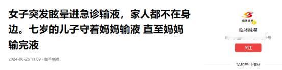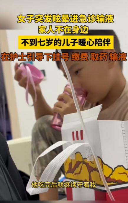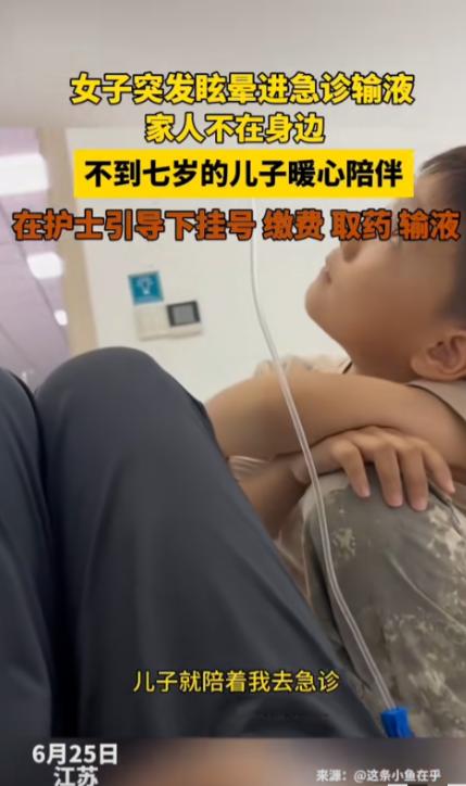 “妈妈的小英雄!”江苏扬州一女子突然犯眩晕症,自己的丈夫又常年不在家,只能带着一个不到7岁的儿子,去医院挂急诊,没想到儿子不仅没添乱,还在这件事上成为了妈妈的小英雄! 6月23号医院一位还不到7岁的小男孩,在跑前跑后的,又是挂号又是缴费的,这些事很多大人第一次做都会晕头转向的,但这个不到7岁的孩子,却做得有条不紊的。 而这个小男孩跑前跑后的是在给自己的妈妈挂号看病,张女士因为在家里打扫卫生的时候感到一阵眩晕。 (信息来源:临沭融媒 2024-06-26 女子突发眩晕进急诊输液,家人都不在身边。七岁的儿子守着妈妈输液直至妈妈输完液) 当时张女士以为是自己长时间的蹲下,猛地站起来有点低血糖造成的,可是自己休息了一会发现并没有好转,反而头更晕了,她便觉得事情不对劲了。 便打了急救电话,因为她的丈夫长年的在外打工,家里也只有她和孩子天天(化名)两个人,张女士就嘱咐孩子一定要跟好自己。 本来张女士还很担心自己生病,孩子没人管会放飞自我,没想到天天不仅听话还帮助了她不少。 到了医院后张女士被带去急诊输液,在这过程中张女士还必须得先去办手续,但是因为实在是太晕了,浑身都没力气有些力不从心。 这个时候天天说这些都交给他吧,让妈妈好好的休息一下,本来妈妈还有点不放心,但是天天说自己会找护士姐姐帮忙的,让妈妈放心。 随后天天真的在护士姐姐的帮助下,把一切手续都办好了,然后他就待在了妈妈的床边陪着妈妈输液。 在整个过程中天天始终抬头盯着输液瓶,生怕里面没有了自己没及时叫护士,张女士看到这样的一幕,突然很感慨说自己的孩子长大了。 之前天天总是一副很调皮贪玩的样子,这是第一次看到他竟然这么的能干,张女士觉得自己反而还有点对不起他,让他小小年纪就陪着自己在医院吃苦。 输完液后的张女士好了很多,她给天天点了汉堡还有好多好吃的,当他问道天天一个人办手续的时候害怕不,天天说她害怕妈妈生病,想让妈妈的病赶快好。 后来张女士把这件事放到网上,一时间网友们都是夸孩子懂事的,纷纷表示其实小孩子比大人们认为的要成熟的多,他们在平常是很调皮,但是真的有事他们也知道自己应该怎么做。 这时候就会有网友想到,当初一位妈妈在餐桌旁晕倒在地,而她的三个孩子竟然都没有一个人去扶她的。 孩子们依然自顾自的坐在餐桌上吃着饭,屁股都不带动一下的,自己的母亲就躺在餐桌旁根本没有人管,网友们看到这样的一幕都表示真的很让人心寒。 自己全心全的的对待他们,没想到确是养了一群白眼狼,对于这样的事情各位有什么看法呢?