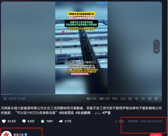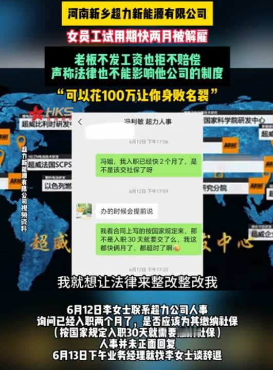 “太狂妄了!”河南新乡,一女员工称试用期快两个月被解雇,老板不发工资也拒不赔偿,表示法律也不能影响到公司的制度,甚至还扬言:“对公司不好的人我花100万让他身败名裂,就想让法律整改整改!” “你还没过试用期,我想啥时候辞退就辞退,有什么问题吗?”王某对着眼前的小姑娘不屑的说道。 这位小姑娘受不了了,在8月3日的时候在网上发声,说自己的前公司欠着自己的工资不给,还无缘无故的开除自己。 (信息来源:香港卫视 2024-08-04 河南新乡超力新能源有限公司女员工试用期快两月被解雇,老板不发工资也拒不赔偿 声称法律也不能影响他公司的制度,“可以花100万让你身败名裂”) 当时李女士(化名)因为想要离家近一点,便在心想的一家大公司面试,本来李女士感觉有点悬,毕竟这家公司很大,现在优秀的人还那么多,生怕过不了。 没想到第二天就通知她过了可以去上班了,李女士自然是高兴极了,可是在她刚上班没几天,就有一个同事回家休产假了,所以她就被迫的一个人干了两个月的活。 李女士刚开始是有点不舒服的,但好在这些活她还是干起来很得心应手,她心里还想着毕竟这个公司也不好进,办公室氛围也挺轻松的,所以也就没说什么。 好不容易等到第一次发工资的日子了,别人的工资都陆续到账了,她的却迟迟没有消息,李女士只好去找财务问到底怎么回事。 没想到财务给她说,她自己还没上满一个月,所以这个月的工资不能发,等到下个月才可以,李女士心想这不就是明摆着要压一个月工资吗。 但是她还是忍啦,毕竟自己确实没上满一个月,但是接下来的事情让她更无语,好不容易等到了第二个月发工资的时间,她的工资竟然还没到账。 这李女士可坐不住了,就向财务问怎么回事,财务则是吞吞吐吐的糊弄过去了,但是李女士没放过她,则是追问当时合同上写的是满一个月交社保,她的社保啥时候交。 这时候对方只是说了一句办的时候会提前说就没下文了,到了第二天李女士就被公司给开除了。 这一切都是很莫名其妙的,最重要的是工资还没给李女士结,他一个人干着两个人的活,拼死拼活的两个月,竟然没拿到一分钱的工资。 等到李女士去跟老板要工资的时候,没想到老板竟然会说出自己可以花一百万让对方身败名列的话,还表示李女士随便去告,就想让法律整顿自己。 真的没想到这种无赖竟然能当上大企业的老板,究竟是用了什么手段,就像前段时间,郑州某公司出现的,几名女员工去讨薪,最终被高大的男子扔出门外的事情。 如今真的是什么人都能开公司了,连最基本的诚信都没有,竟然还想要当高高在上的大老板,不知道这些人是怎么想的。 对于这样的事情各位有什么看法?