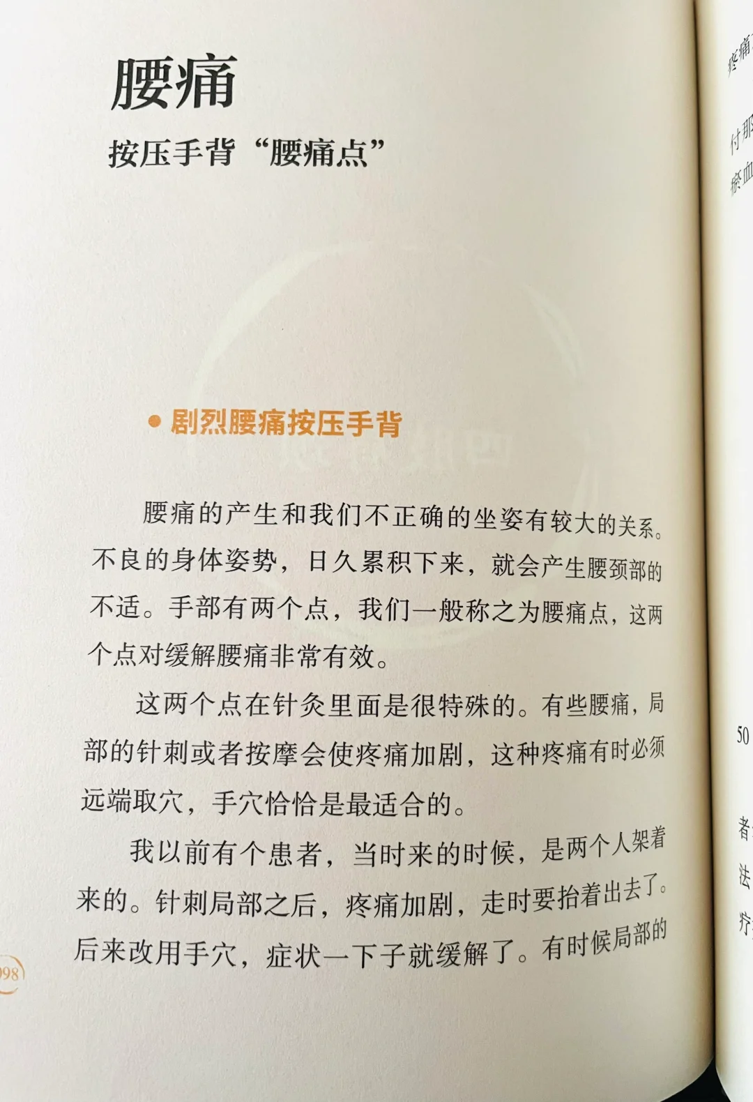 张宝旬老师出的书,很实用。(书名看评论,总被优化。)很久之前就关注他的微博。腰痛按手背那个绝了,亲历按完就能缓解[点赞R] 从头到脚、从里到外的常见病症多有涉及,中老年人、女性到小儿皆可受益。操作方法以按压手穴为主,简单易行、实用有效。