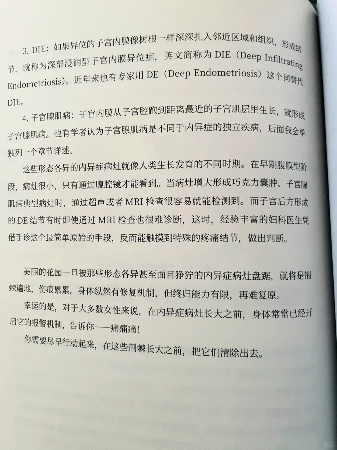 在疾病的早期,病灶尚小的阶段,最有希望将内异症消灭在萌芽状态,这是打胜仗的良机。如果你已持续痛经多年,那是机体向你发出的强烈的警示信号,早诊早治,更多地靠你自己。