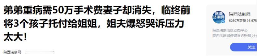 刀子嘴豆腐心!湖南一男子临终前,将3个儿子托付给姐姐,姐姐含泪答应。不料,姐夫却黑着脸冲姐姐怒吼:你有什么能耐养3个孩子?你要是养我们就分开!然而,姐夫最后的做法却让所有人泪目。 “你不看看咱们自己现在是什么样的情况,还要帮他们?咱自己的日子还过不过了!”姐夫在病房外冲着姐姐大声的怒吼道,释放着自己身上这许久以来的压力。 孩子的母亲到哪里去了,妻子的娘家人对自己的亲外孙就这样不管不顾么,而姐夫最后对妻弟的三个孩子又是怎样安置的。 (主要信源:陕西法制网—2021.11.22《弟弟重病需50万手术费妻子却消失,临终前将3个孩子托费给姐姐,姐夫暴怒哭诉压力太大!》) 病床的小新眼神中透露着绝望,他的肝脏处于一个几乎衰竭的状态,已经不具备正常功能了,而且唯一治疗的手段就是肝脏移植,可是去寻找的一份合适肝脏的几率太小了。 因为肝脏功能缺失,小新体内的黄疸素一直居高不下,不仅皮肤偏黄,就连眼球的眼白部分都蒙上了一层黄色。 而小新的妻子,孩子的母亲又去了哪里,据小新的姐姐表示,小新的妻子阿花早在孩子出生之后便离开了家,从此再也没有消息,小新也一直联系不上。 直到小新身体病重,阿花也迟迟未见踪影,小新的姐姐也将小新生病的消息告诉了阿花的家人,至于他们有没有转告阿花就不得而知了。 而根据阿花母亲的说法,阿华的离开不是临时起意的,而是早有想法,因为夫妻两人双胞胎的出生,让原本条件不错的家庭压力骤增。 关于阿花的离开,小新认为阿花是嫌弃家里穷,为了逃避抚养三个孩子责任,这才离开了家,而阿花的母亲转述阿花的意思是,离开是因为小新整日游手好闲,不考虑家庭压力。 双方的说法暂时无法分辨真假,可是眼下最真实的情况却是孩子未来的抚养问题。 小新的身体已经是这个样子了,对于治疗他已经不抱任何希望了,继续治下去只会增加家庭的负担,可是孩子的爷爷奶奶已经不在了,阿花的娘家人因为一些原因也不愿意抚养。 身边再无助力的小新只好将目光看向了一直照顾自己的姐姐,他希望自己的姐姐能在自己离开后照顾自己的三个孩子,并表示不用多管,照顾到成年就好,如果走歪了就不用管了。 听到这里,姐夫有些忍不住了,当即便把姐姐叫出了病房,在病房外,便发生了开头的一幕,因为自从小新生病之后,他们夫妻俩忙前忙后,又出钱又出力。 姐夫自己家的生活过的也有些困难,之前已经不遗余力的帮忙了,而现在的情况实在是有些遭不住了。 而姐夫在几天之后,竟然答应了小新的托付,原来姐夫也是个热心肠,只是人都有情绪,一通发泄过后,该怎么做就是怎么做。 姐夫表示,就算是带着三个孩子去要饭也会将他们都带大,而小新也是已在叮嘱三个孩子,一定要听姑姑和姑父的话,哥哥懂事一点,两个弟弟也要听哥哥给的。 事情发展到这样的情况,当地相关部门不仅会给小新解决低保问题,并且还对三个孩子有一定的政策帮助,这个世界破破烂烂,总有人想把它好好的缝一缝。