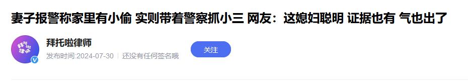 “这个原配太猛了!”上海,女子报警说自己家里进贼了,小偷正在偷东西,可当民警破门而入时直接傻眼了,他们这才知道,女子报警不是让他们抓小偷,而是抓小三。结局笑喷了!网友:没错,抓偷人的小偷! “你好,我们家进小偷了你们能来看看吗?”林某拨通报警电话说明情况后,自己一个人又躲在小区的角落里等着警察的到来。 在这段时间了她想了好多种等会会发生的情景,是眼前的两个人正在亲热呢,还是正在抱在一起说着腻人的情话。 (信息来源:拜托啦律师 2024-07-30 《妻子报警称家里有小偷 实则带着警察抓小三 网友:这媳妇聪明 证据也有 气也出了》) 当初林某和自己的丈夫是在大学的时候认识的,两人经过几年的爱情长跑终于步入了婚姻的殿堂。 结婚后的两人生活的更是有滋有味,甚至周边的亲朋好友都是羡慕她们两位的,觉得两位简直就是模范夫妻。 后来两人也有了孩子,刚开始还都是一如往常的没什么变化,但是随着孩子慢慢的长大,林某发现自己的丈夫好像开始对自己变得冷淡了起来。 她发现自己的丈夫时不时的盯着手机笑,自己问笑什么的时候,丈夫很紧张的吞吞吐吐,而且不管去干什么手机都要带在身边,之前手机都是随便扔的。 女人的第六感告诉她这其中一定有事情,所以他便开始留意了起来,偶然间她发现自己的丈夫躲在房间里给一个女人打电话,说着肉麻的情话打情骂俏的。 真的是对于某些结过婚的人来说,野花永远都比家花香,就是忍不住想去外面寻找刺激感,虽然自己的家庭其实过的也很幸福,但是就是忍不住偷吃。 而林某也不打没准备的仗,她为了找到丈夫出轨的实质性证据,就谎称说自己要出差一段时间,让丈夫一个人在家要照顾好自己。 而且为了给丈夫独处的机会,林某还将孩子送到了父母那里,说害怕丈夫照顾不了,这刚好让丈夫能够跟小三单独相处。 当天林某带上自己的行李出门,丈夫还假惺惺的表现出一副依依不舍的样子,可是等到林某上车后,转眼就和自己的情人联系。 林某上车没多久就下车回到了小区躲起来了,后来她就看到丈夫搂着一个女子进了自己家。 她本来想自己再等一会就冲进去捉奸在床,但是她转念一想,万一对方做出过激的行为,吃亏的还是自己,所以便想着报警说家里进小偷了,让警察来这样自己就不怕被伤害了。 后来警察破门而入发现一男一女在床上翻云覆雨的景象,这时候警察才知道根本不是抓小偷,而是在抓小三。 本来婚姻就应该两个人相互经营,不应该因为时间长了双方腻了,就要背叛婚姻,如果觉得没有感情了,可以好好谈谈,真的到来没办法挽回的地步离婚也不是不可以。 但是不能在婚姻中出轨,做出这样违背道德的事情,对于这样的事情各位有什么看法呢?