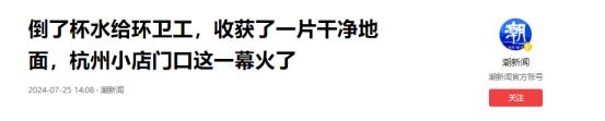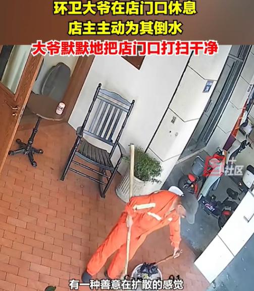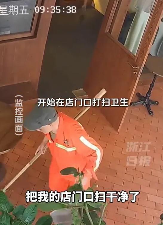 “看哭了!”浙江杭州,女子早上去开店门,发现门口坐着一位环卫大爷,她好心给大爷倒了一杯水喝,没想到,大爷却转身就走!竟然拿来了自己的杯子接水,女子没有说什么,而是将大爷水杯灌满,然而,大爷随后的举动,却让女子感动哭了! 7月初的时候王女士像往常一样去到自己开的小店开始上班,但是今天不同的是小店的门口多了一位素不相识的人。 王女士远远的就看见小店门口的摇椅上,坐着一位穿着橘色衣服的大爷,等到王女士走到门口自己还没开口的时候,大爷就先说了话。 (信息来源:潮新闻2024-07-25 倒了杯水给环卫工,收获了一片干净地面,杭州小店门口这一幕火了) 这位大爷是一位环卫工人,他见王女士过来连忙站起身来,解释说自己只是在这里休息一下,等会就走,说着还用手拍拍椅子上的灰,生怕会被嫌弃的样子。 王女士则是连忙摆摆手说没关系,还让大爷坐,为了缓解大爷的不适感,还主动问他要不要喝水,大爷一边说谢谢,一边拿出来自己的水杯。 然后王女士就进店给大爷的水杯里加满了水递给了大爷,让大爷放心的在这里休息,之后就去忙自己的事情了。 等王女士忙完再次出来的时候已经不见大爷的身影了,她也没想太多后来一次偶然的机会,她看到店门口的监控才发现,这位环卫工大爷自己默默的做了这么多的事情。 王女士从监控中看到环卫工大爷喝完一口水后,拿起来自己的清洁工具,将王女士家的店门前打扫的干干净净,就连王女士店门前的盆栽也清理了一遍,把枯萎的叶子都清理掉了。 然后打扫完一切之后,这位环卫工大爷才默默的离开,王女士觉得自己只是给大爷倒了杯水,竟然得到了大爷如此大的回报,认为自己真的有点受宠若惊。 后来王女士还告诉记者说这样的事情其实还有很多,有时候这些环卫工阿姨和叔叔路过这里的时候,都会顺手帮自己的店门前给清理一下。 而且有一次自己店门前不知道被那个小狗狗给拉了一坨粑粑,自己清理了很久都没有将粑粑的印子清理干净,有一个环卫工阿姨看到后,主动帮自己。 阿姨也是费了九牛二虎之力才将它完全清理干净,还说到这些要是不清理干净的话,以后狗狗还会在这里拉的。 这些事情王女士都记在心里,有网友说王女士肯定是一个很好很好的姑娘,因为人和人之间都是相互的。 一个人对你好说明不了什么,但是所有人都对你好,那就说明这个人本身就是很好的人,他对身边的人都是这样,才能得到身边人同样的回馈。 所以说只要每个人都献出一点点爱心,可能就会收到意想不到的温暖,再平常生活中做一个温暖的人,传播温暖是一件幸福的事。 对于这样的事情各位怎么看呢?