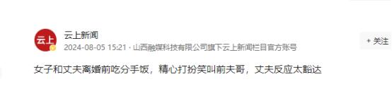 湖南,一女子与丈夫离婚当天,精心打扮,丈夫尊重她的选择,西装革履体面分手。视频中,两人“和平离婚”,办事前,俩人还去吃了一顿分手饭,走在前往民政局路上时,女子笑着对丈夫说“你马上就要成为我前夫哥了”。 一对精心打扮的夫妻来到了饭店吃饭,女生则是画了精致的妆容,做了美美的头发,穿上了精心挑选的衣服,而旁边的男子也是穿上了衬衣,整个人精致利索的。 不知道的人还会以为这对夫妻是出来约会的,但其实他们吃的这一顿是分手饭,吃完之后他们就要去离婚了。 (信息来源:云上新闻 2024-08-05 《女子和丈夫离婚前吃分手饭,精心打扮笑叫前夫哥,丈夫反应太豁达》) 王女士(化名)和自己的丈夫结婚来十几年,刚结婚的时候他们也像热恋中的小情侣一样,每天黏在一起,过的很是幸福甜蜜。 但是慢慢的成了老夫老妻以后,同样也跟大多数的夫妻一样有吵不完的架,但是原则上的错误也没有,就是一些鸡毛蒜皮的小事情。 这些事情搞得两个人都是心力交瘁的,觉得两个人在一起后好像没有了快乐,只剩下了各种伤心。 所以王女士思考再三后跟自己的丈夫提出了离婚,而丈夫也同意了,他们都认为可能分开之后对两个人都有好处。 后来约定去办理离婚的当天,王女士把自己打扮的美美的去接自己的丈夫,她没想到丈夫竟然也将自己收拾了一番。 后来在车上王女士看车开车的丈夫,说到咱去吃一顿分手饭呗,就这样两个人到了餐厅,吃饭的时候整个氛围都是有说有笑的。 他们并没有像大多数离婚的夫妻一样,闹得撕破脸皮,老死不相往来,反而是非常冷静满怀笑意的再好好告别。 王女士还对自己相处了十几年的丈夫说,没想到你也是我的过客,从今天过后我就要叫你前夫哥了。 丈夫听后也只是笑笑没有说什么,两个人吃完饭后也是笑着去领了离婚证,从此之后真的就成为了最熟悉的陌生人。 王女士还是非常感谢丈夫陪伴的这十几年,两个人没有恶语相向,而是体面的办完离婚,潇洒的退出彼此的生活。 有网友说到自己当初离婚也是没吵没闹,好聚好散的和平分手,当时两个人都故作坚强,有说有笑的,但是毕竟有十年的感情,后来在一个人的时候还是哭的跟个孩子一样。 还有网友表示婚姻不可能一帆风顺的,不管和谁在一起到最后其实都已经没有了情,都变成了一家人亲人的感觉,也就是搭伙过日子。 所以时间久了就没办法再去追求情爱了,只要不愁吃不愁穿就行了。 其实结婚是为了幸福生活,现在离婚也是为了更好的生活,拿得起放的下就是对自己最好的证明,不论怎样的选择只要自己过的舒心都是最好的。 对于这样的事情各位有什么看法呢?