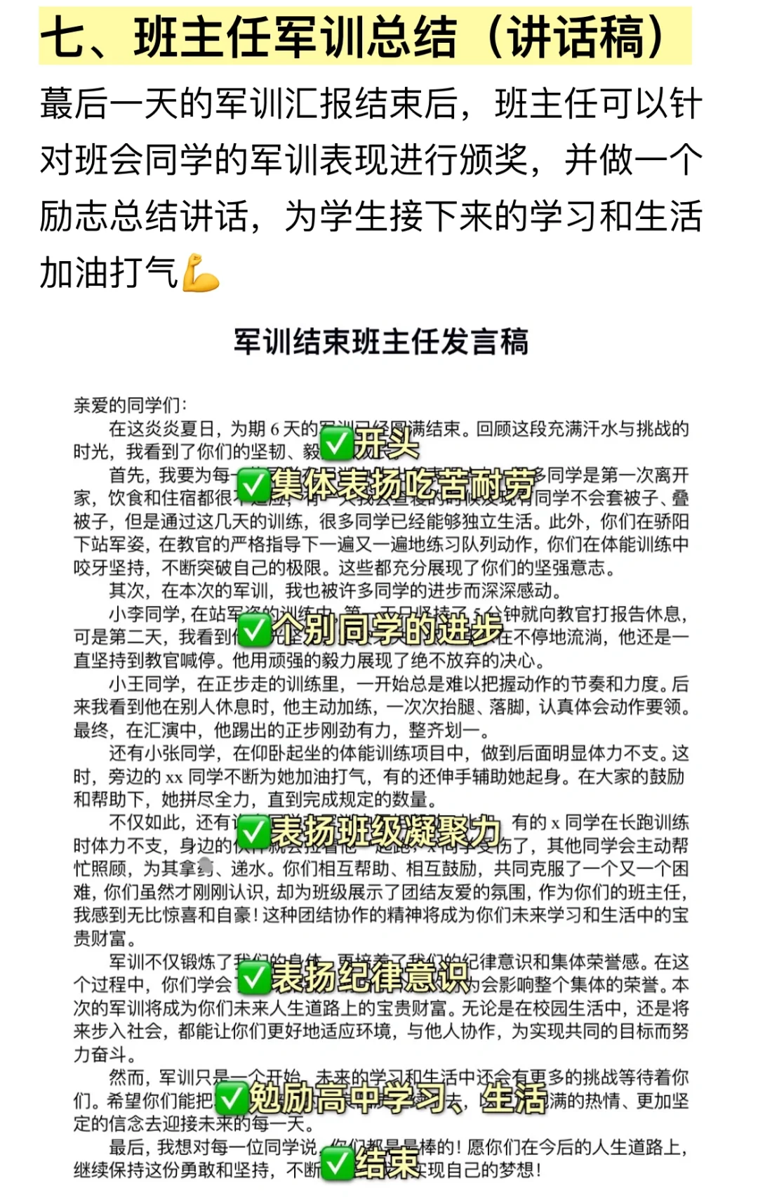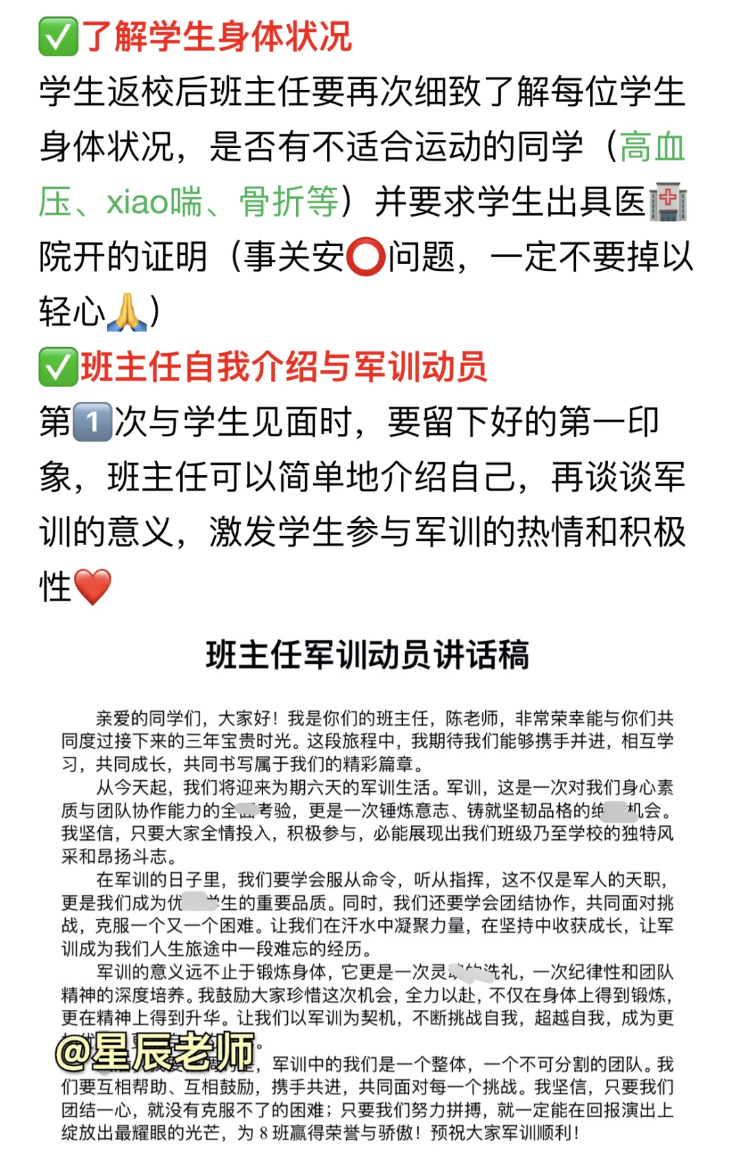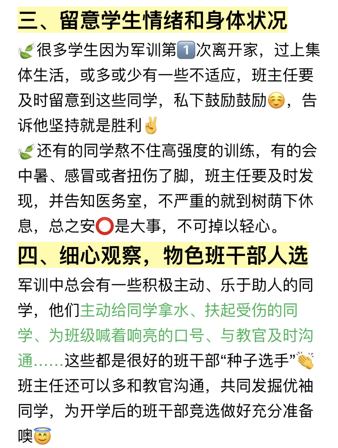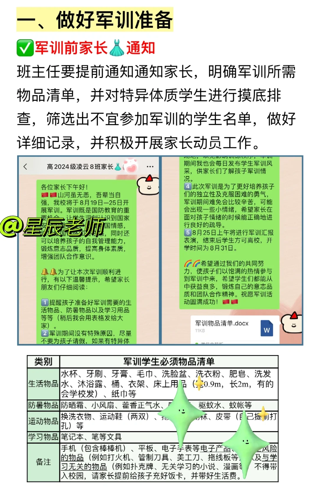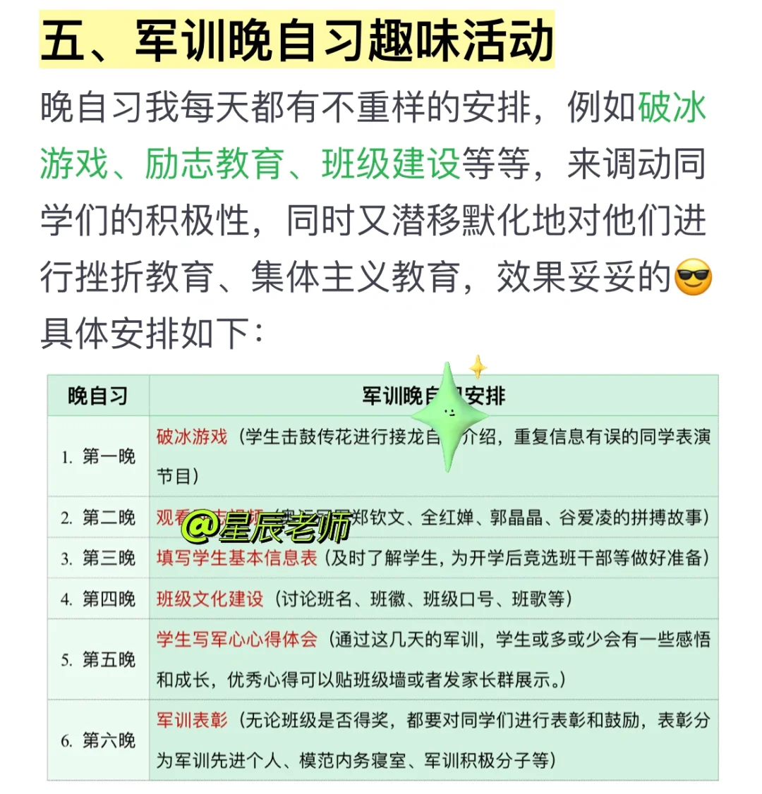🙈即将开学了,连夜码字介绍自己多次带新生军训的经验,希望各位班主任看完后不再迷茫😎 内容包含: ✅军训准备一览表 ✅立规矩话术 ✅留意学生情绪和身体状况 ✅观察物色班干部人选 ✅晚自习趣味活动 ✅每日家校沟通话术 ✅班主任军训总结(讲话稿) 后期还会更新更多班主任干货、新手老师教程,不见不散啦[黄金薯R]