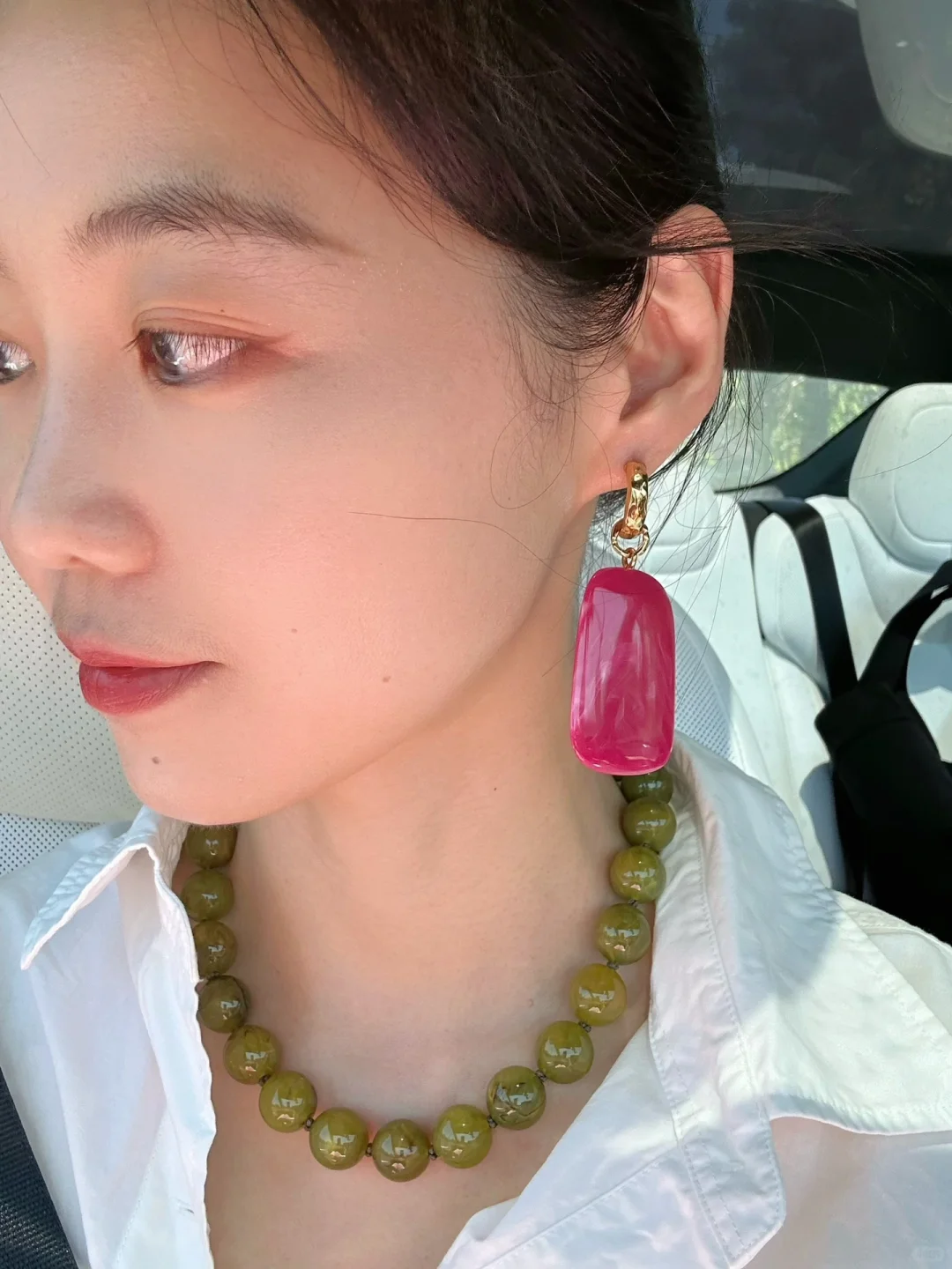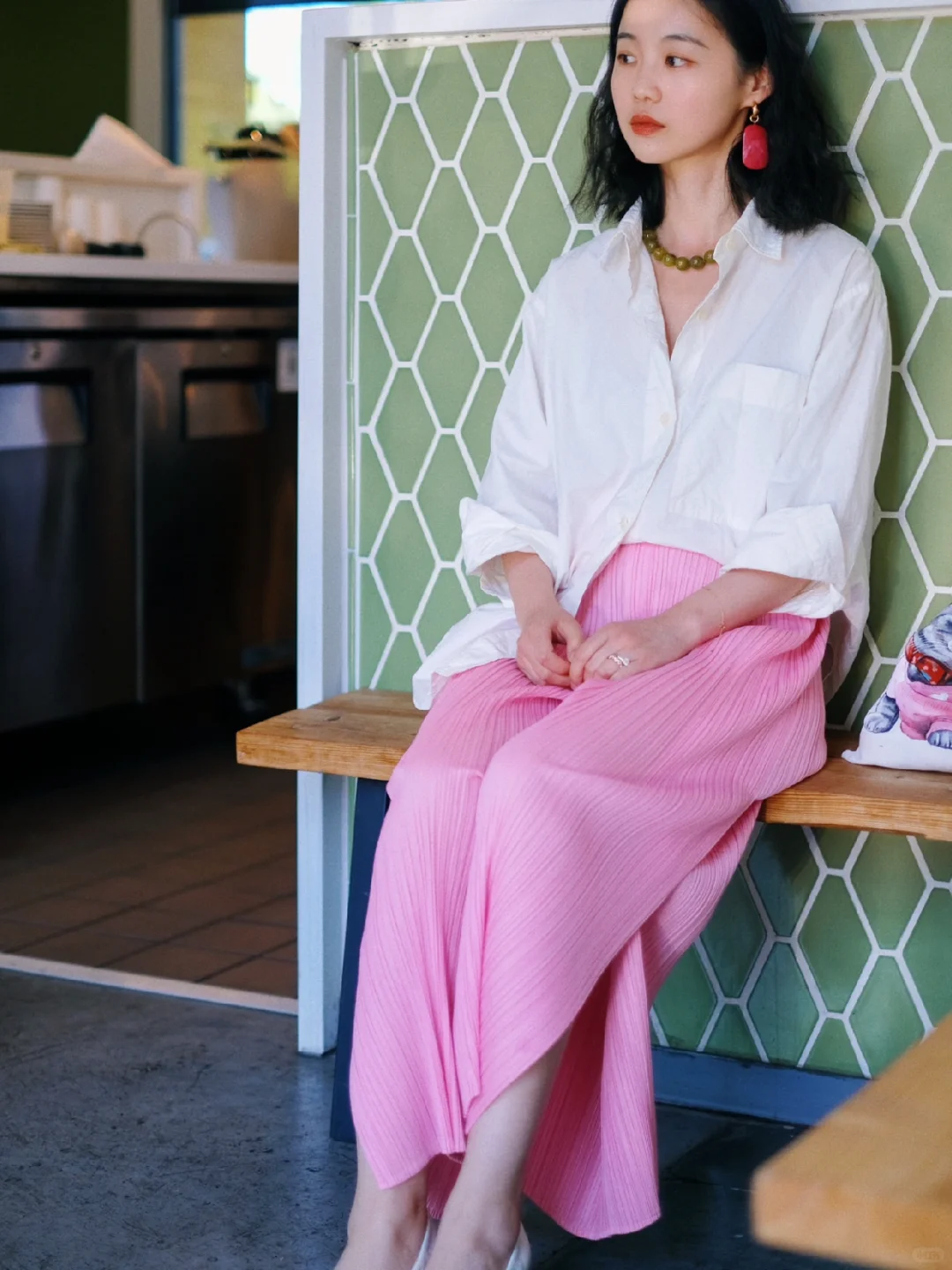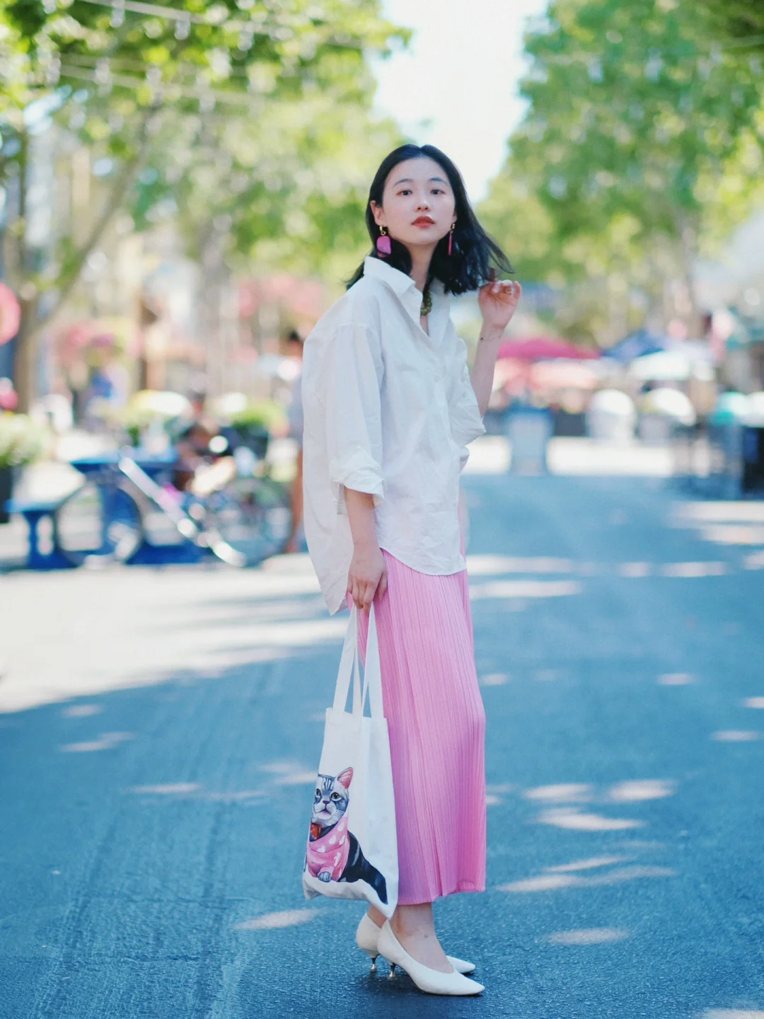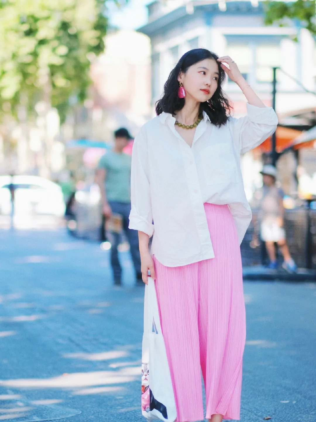 · 前两年挖宝的三宅一生Plests Please“芭比粉”, 搭配基础款MHL白衬衫, 将童年阴影“水粉色”提升到了 成年人“ootd高兴大赏”的地位~ · 此次镇衣之宝依旧是朋友送的“牙牙包”, 粉萌翘楚,对其喜爱程度 在家中“百万帆布袋”中已是断层领先。 · 除此之外,第一次尝试在Sezane家入配饰, 一眼看中绿色珠串项链+正玫红耳饰。 项链最妙的是长度(不差分毫的刚好!) 与大珠吸睛的“体积感”。 耳饰自重9克,是我的极限, 然而无法割舍对于几何+玫红的偏爱, 戴了一天,居然能hold住(属于你无法忽视, 即便穿个白衬衫佩戴都好看的神仙配饰) · PS. 这段时间全都沉浸在看奥运的快乐里, 越来越能体会一个竞技菜鸟 对于竞技体育的迷恋(比如我一个 只能狗爬🏊‍♀️的人竟然超级喜欢看游泳), 彻底get到某种非常喜欢的人生新状态: · 人菜瘾还大! · 希望自己在“人菜瘾大”的状态上不断精进, 与大家共勉[彩虹R][偷笑R] ·