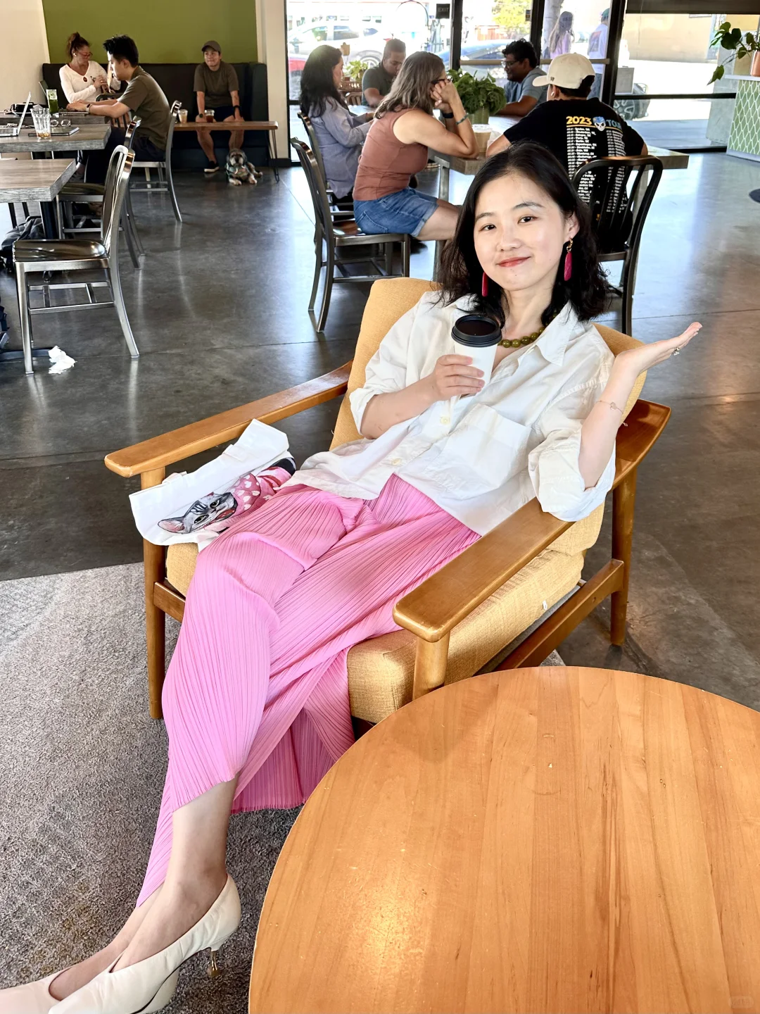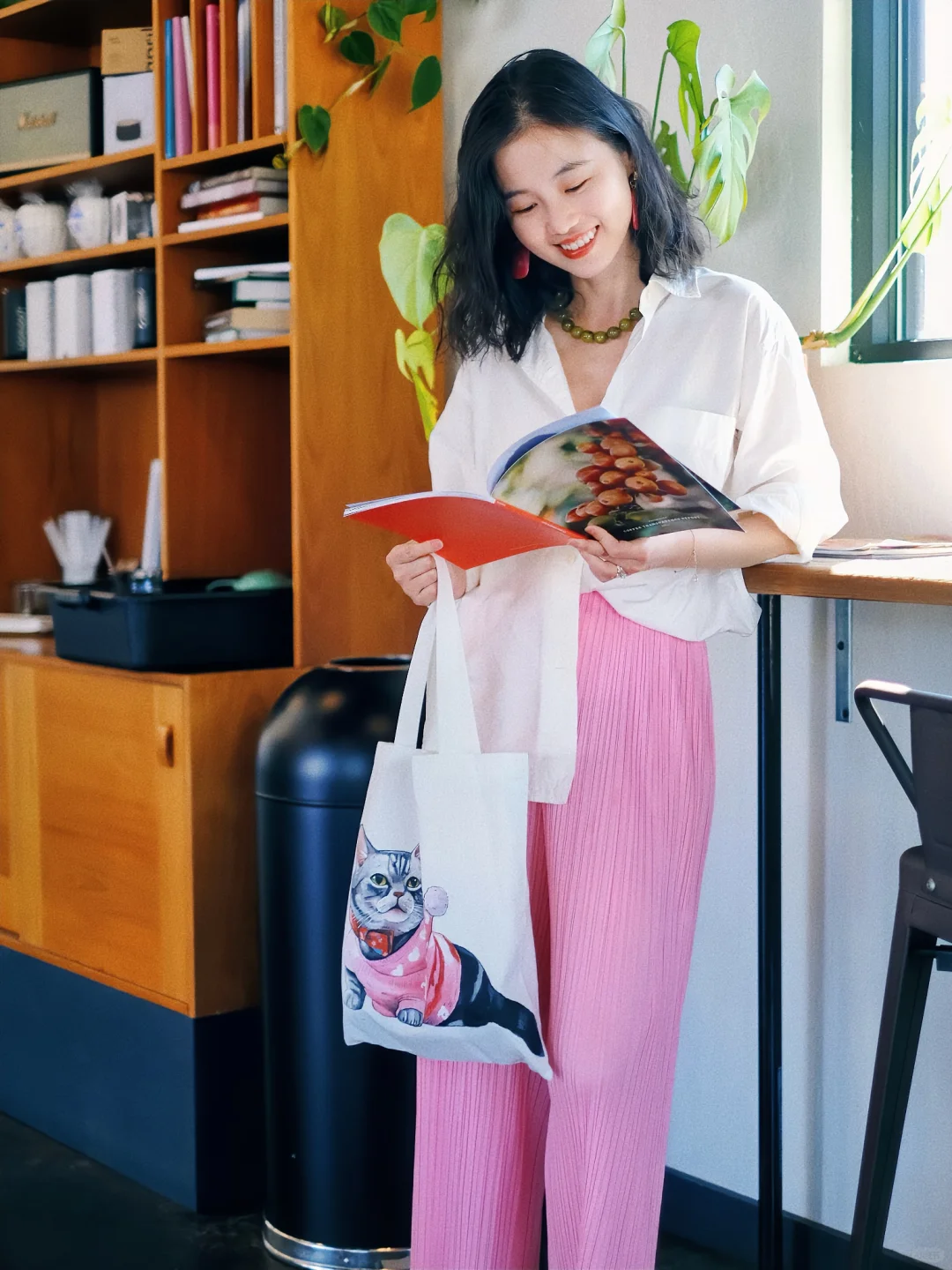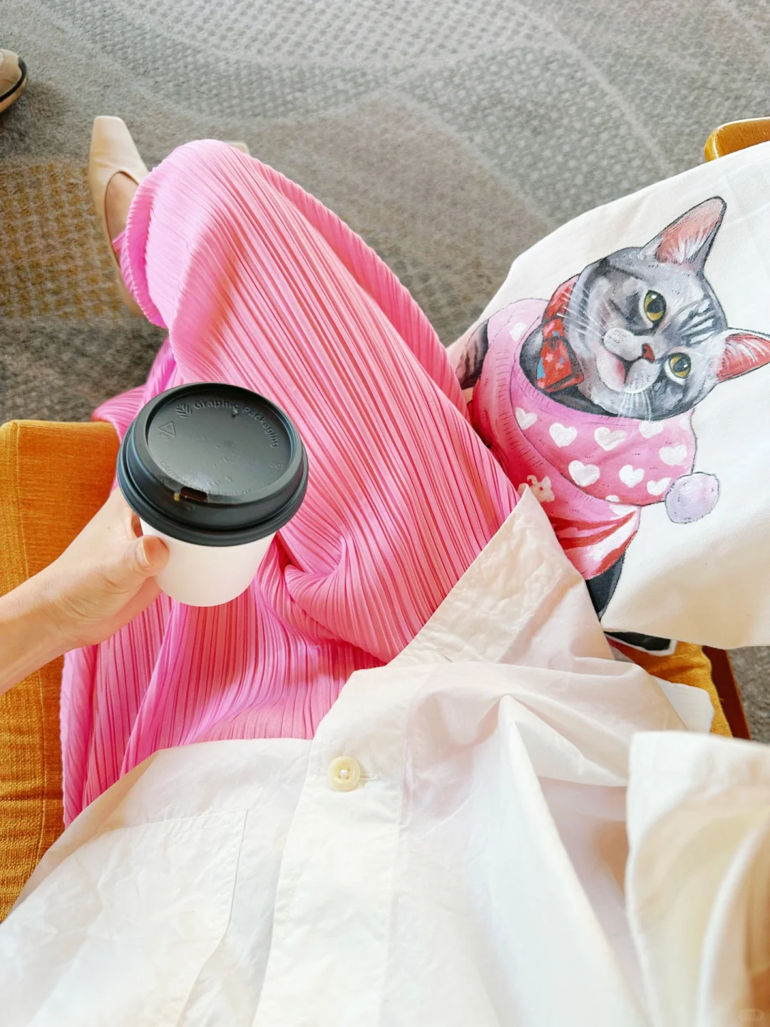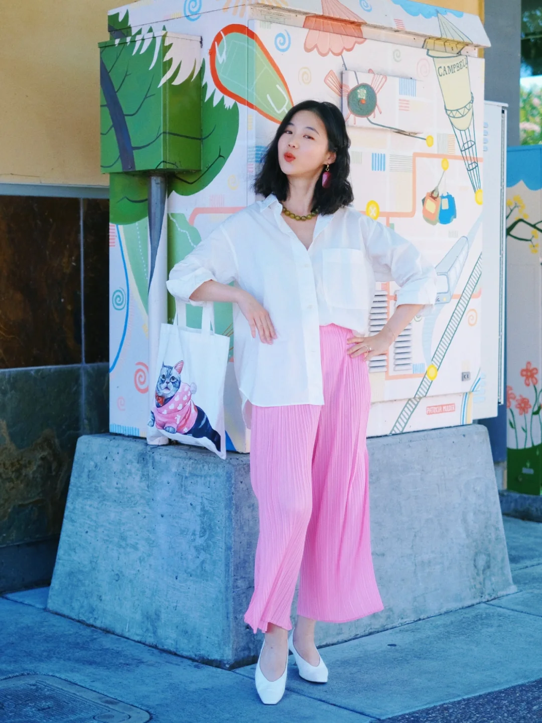 · 前两年挖宝的三宅一生Plests Please“芭比粉”, 搭配基础款MHL白衬衫, 将童年阴影“水粉色”提升到了 成年人“ootd高兴大赏”的地位~ · 此次镇衣之宝依旧是朋友送的“牙牙包”, 粉萌翘楚,对其喜爱程度 在家中“百万帆布袋”中已是断层领先。 · 除此之外,第一次尝试在Sezane家入配饰, 一眼看中绿色珠串项链+正玫红耳饰。 项链最妙的是长度(不差分毫的刚好!) 与大珠吸睛的“体积感”。 耳饰自重9克,是我的极限, 然而无法割舍对于几何+玫红的偏爱, 戴了一天,居然能hold住(属于你无法忽视, 即便穿个白衬衫佩戴都好看的神仙配饰) · PS. 这段时间全都沉浸在看奥运的快乐里, 越来越能体会一个竞技菜鸟 对于竞技体育的迷恋(比如我一个 只能狗爬🏊‍♀️的人竟然超级喜欢看游泳), 彻底get到某种非常喜欢的人生新状态: · 人菜瘾还大! · 希望自己在“人菜瘾大”的状态上不断精进, 与大家共勉[彩虹R][偷笑R] ·