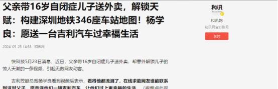 深圳一父亲带16岁自闭症儿子送外卖,因找不到地址怕超时配送干着急时,谁知儿子突然开口:“跟我来!”,父亲大惊:你竟然还有这种天赋! 黄同学在两岁的时候就被确准尉自闭症儿童,而他的爸爸妈妈也一直在帮孩子走出来,虽然他们不能强迫孩子跟别人交流,但是他们会试图引导孩子。 在这期间他们找了好多的医院,也用了很多的方法也没能让黄同学好起来,但是自闭症的情况会稍微缓和一点。 (信息来源:和讯网 2024-05-23《父亲带16岁自闭症儿子送外卖,解锁天赋:构建深圳地铁346座车站地图!杨学良:愿送一台吉利汽车过幸福生活》) 黄同学刚开始还能去学校上学,虽然也总是自己一个人不跟别人交流,但是最起码愿意去学校。 但是随着年龄的增长,黄同学的自闭症越发的严重,他开始排斥上学,无奈之下只好给他办理了休学。 后来黄同学经常将自己关起来,也不愿意跟任何人说话,只是沉浸在自己的世界里,尽管父母再怎么开导他都没有什么太大的效果。 黄同学的爸爸觉得再这样下去肯定不行,孩子必须要学会自己照顾自己,这样将自己关闭起来,不去接受适应外界的生活,等他们老了没有能力照顾了,孩子自己该怎么办。 在经过仔细地思考,爸爸黄先生决定带着黄同学送外卖,他觉得这样自己可以照顾孩子,也能教孩子与人接触。 所以在2017年的时候,黄先生每次送外卖都会带着孩子,刚开始黄同学很抗拒,不愿意和父亲出去,但是黄先生自己是狠下心来,就要教孩子走出自己的世界。 所以不管黄同学怎么抗拒,自己还是连拖带拽的带着他,就这样黄先生一边送外卖,一边给孩子讲着应该怎样给别人相处。 慢慢的黄先生发现孩子还想变的有一点点的可以接受外出了,而且他还发现了孩子的一个天赋。 再送外卖的过程中,黄先生经常走错路导致送餐超时,但是自从带着黄同学跑了几次后,他发现只要自己一走错,黄同学就能指出来。 甚至有时候接到订单后,黄同学就能指出最佳的路线,即能快速的找到位置,路上所用的时间也大大缩短。 而且如果又较远的大单的话,黄先生在路上迷方向后,还是黄同学站出来说跟着自己走肯定不会超时的。 而且再送外卖的这段时间黄同学也变得会尝试跟别人接触了,后来黄先生放手让他自己去接单送单,黄同学也能独立的完成了。 后来从父亲带着孩子送外卖,变成了孩子为父亲指路,然后到最后孩子可以独立完成,这也是让一个自闭症患者慢慢的打开了自己。 就是因为父母的不放弃,父亲一步一步的引导孩子,让孩子愿意跟别人交流,在这期间父亲也没有过放弃的念头,最终才让孩子喜欢和适应了这个世界。 对于这件事情各位有什么想说的吗?
