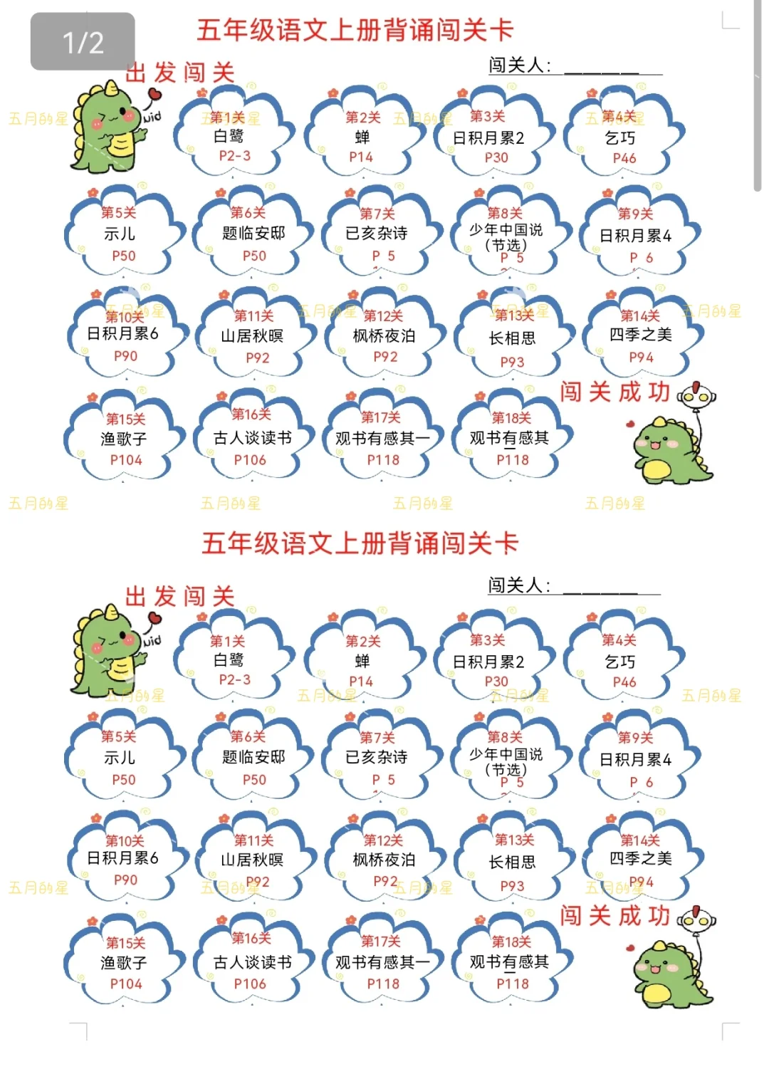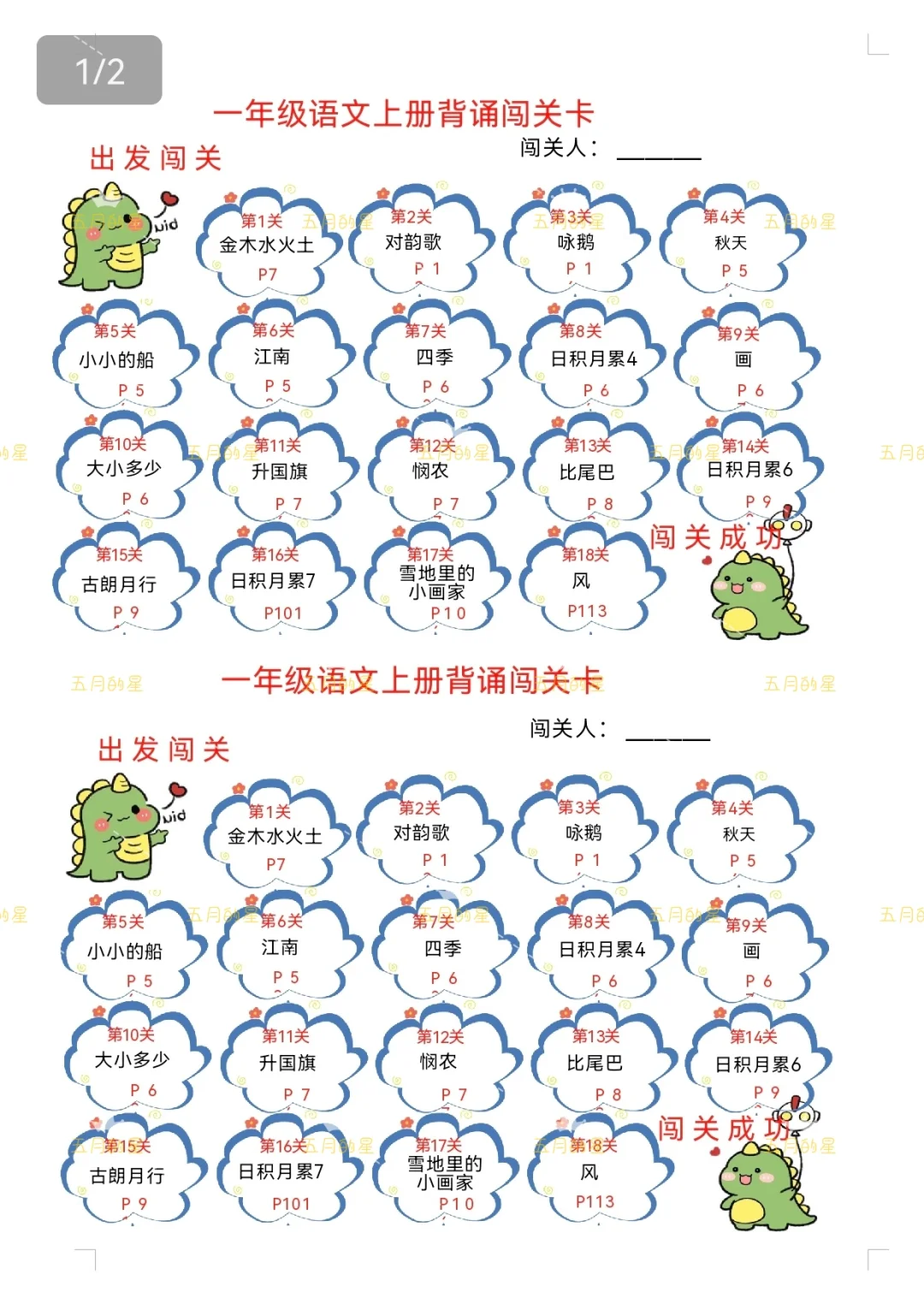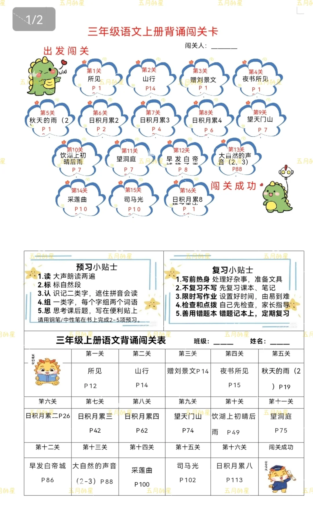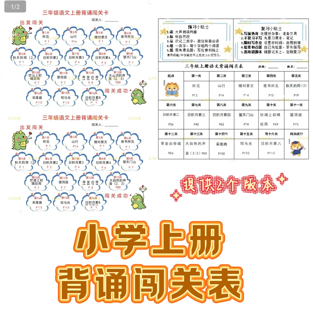 利用暑期的尾巴,做好小学6个年级上册的背诵闯关表,一共提供2个版,第一版一份可以打两张,第二版比较长加了预习复习提示。 制作难度不大,但是费时费眼[笑哭R]背诵内容还是按照希望教材,给大家直接发的word版,如果新学期有变动,请自行修改哦[飞吻R]