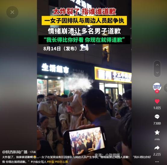 比我长得好看,我就要道歉?上海,一女子在某商业街区因为排队问题,与周围几人发生争执,随即便大闹起来,表示自己比别人好看,为什么不能让别人道歉,黑衣小伙受不了,当即便向女子道歉,谁曾想,女子更加变本加厉,又指向旁边一个看热闹的白衣男子,竟然让他也道歉,警察来了之后结局亮了。 “我长得这么好看,我需要让么?!”女子带着怒气向周围的人群大声的吼道,这一刻自信占了上风,她觉得似乎所有人都要围着她转。 事情的起因究竟是怎样的,而这名女子又是如何一步一步变得歇斯底里,对着人群“无差别轰炸”,在警察叔叔来了之后,情况又会又怎样的不同。 (主要信源:陕西新闻广播—2024.08.14《太炸裂了,指谁谁道歉...一女子在某商业街区因排队与周边人员产生争执,情绪崩溃让周围人道歉:“我长得比你好看 你现在就得道歉”》) 事情发生在一名网红博主的煎饼摊前,因为这个网红人气较高,以及夜市性质的原因,这块区域放眼望去尽是围观的人,虽然人数有点多,但是大多数都非常的遵守秩序。 刚开始并没有出现骚乱的情况,人们都在排着队,突然一名女子企图向前插队,这样的情况顿时引来其他顾客的不满,都在排着队,凭什么你不遵守秩序。 其中几名顾客当即便出声制止,没想到的是,女子非但没有感觉到不好意思,反而和这几名顾客争了起来,女子对一名黑衣男子表示让他给自己购买。 黑衣男子立刻回怼了过去,称凭什么要帮女子购买,女子仿佛来了兴致,表示自己长得这么好看,不想排队。 此话一出立刻引爆了全场,在场的顾客们对着女子嘘声一片,不知道赞叹她的自信,还是嘲笑她的自负,而女子在之后表示黑衣男子给自己的面子造成了损失,要求其进行道歉。 黑衣男子也是有理不在声高,反问为什么要给她道歉,凭什么道歉。而女子的情绪慢慢的红温,说出了那句让人脑子宕机一秒钟的话:“我长得比你好看,你现在就要道歉。” 黑衣男子也是不出意料的愣了一下,称自己不会道歉,这下彻底点燃了女子的怒火,疯狂的对着男子进行口头上的侮辱,甚至称男子一听说话就是从穷窝里出来的。 眼见女子情绪变得有些不可控,该区域的负责人赶到现场,希望能够调解这一矛盾,可是女子这会已经上头了,任由负责人怎样劝说,都无济于事。 黑衣男子见状,为了不让情况在继续恶化下去,主动站了出出来,对女子进行道歉,女子则是得理不饶人,一而再再而三的让男子态度诚恳一些,不断地让其低下身子。 黑衣男子还是秉着息事宁人的态度按照女子的要求道了歉,谁曾想,就在大家以为事情结束的时候,女子已经杀红了眼,扭头对着旁边的一名白衣男子吼了起来。 并且也要求让他道歉,给出的理由依然是“我比你漂亮”,而白衣男子却没有惯着这名女子,当即便和她吵了起来,据说直到警察叔叔感到才得以平息。 通过网友发布的视频,该女子在事后被警察给带走了,相信这次的经历会让她对自己有一个新的认知。 自觉排队是每个公民应当遵守的不成文规定,这也是高素质的体现,对于那名情绪激动的女子的做法,属实有失风度,在公共场合遵守规矩,或许也就没有这么多事情了。