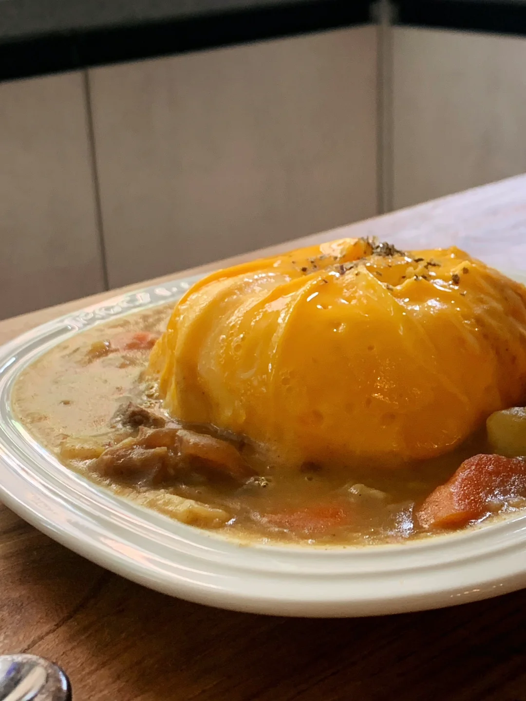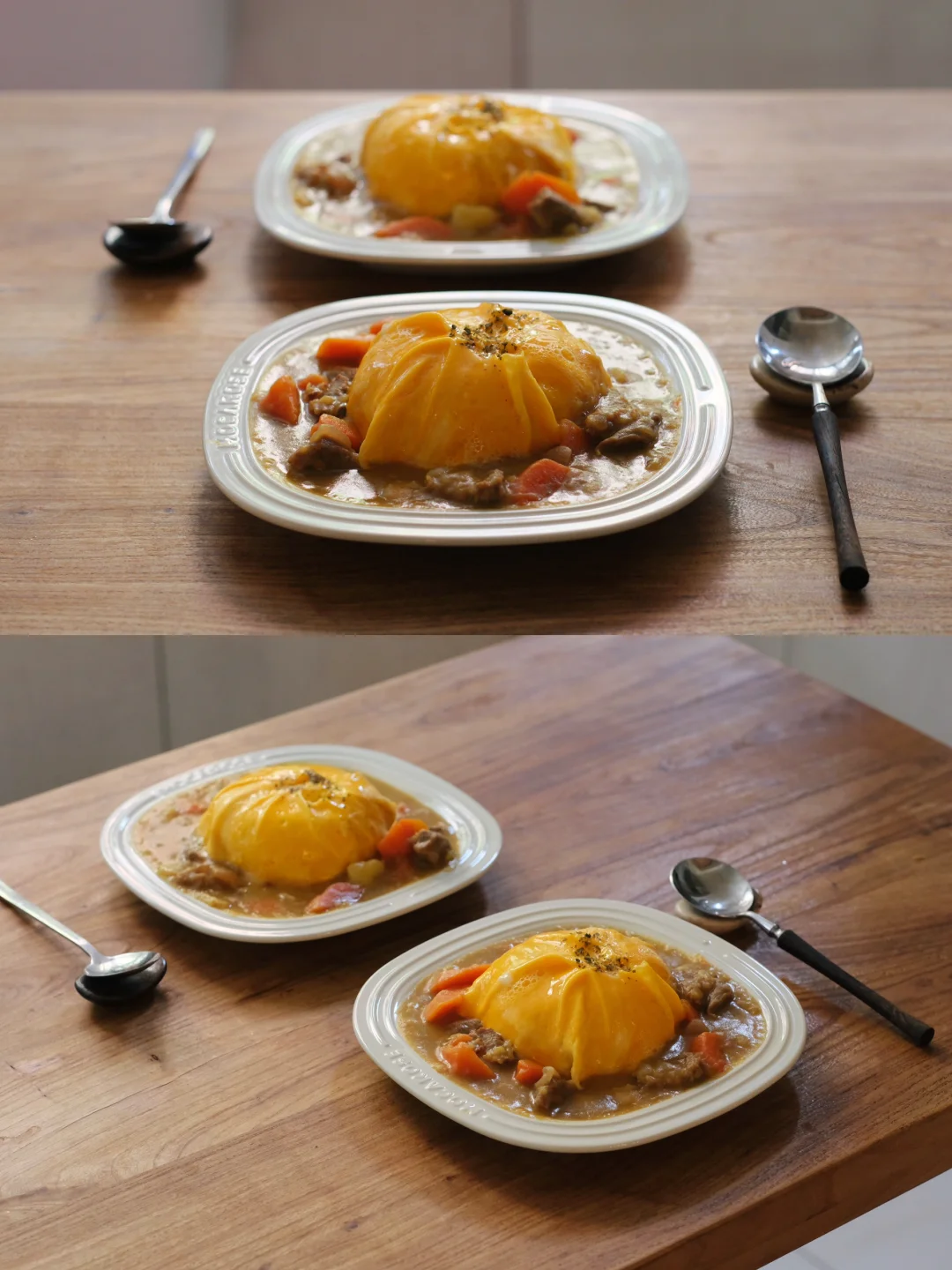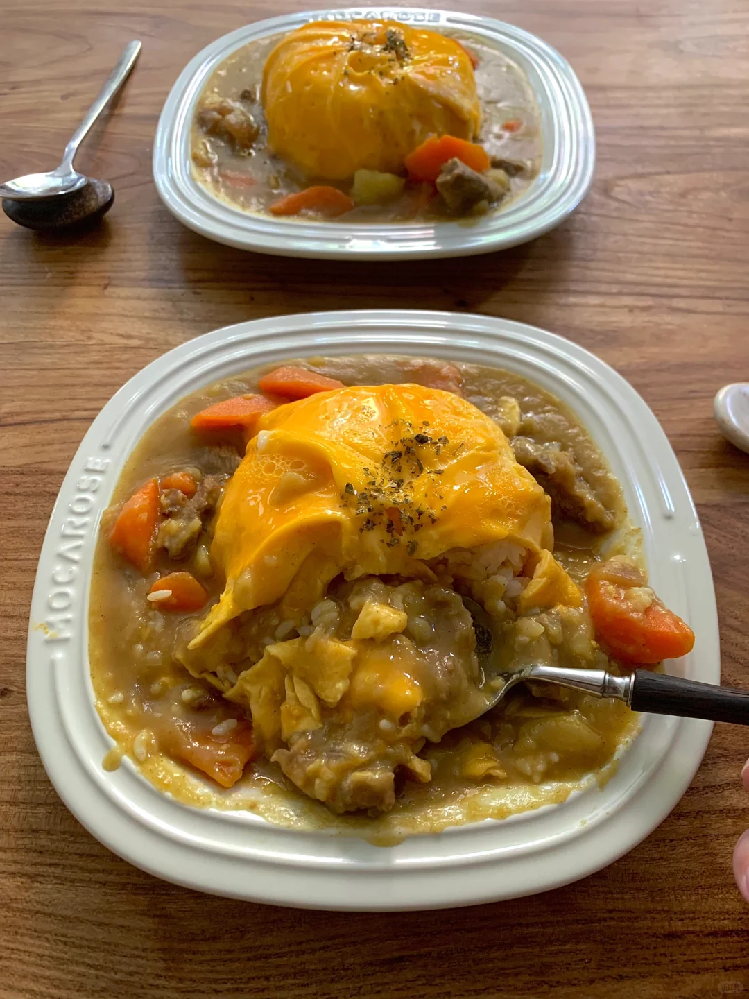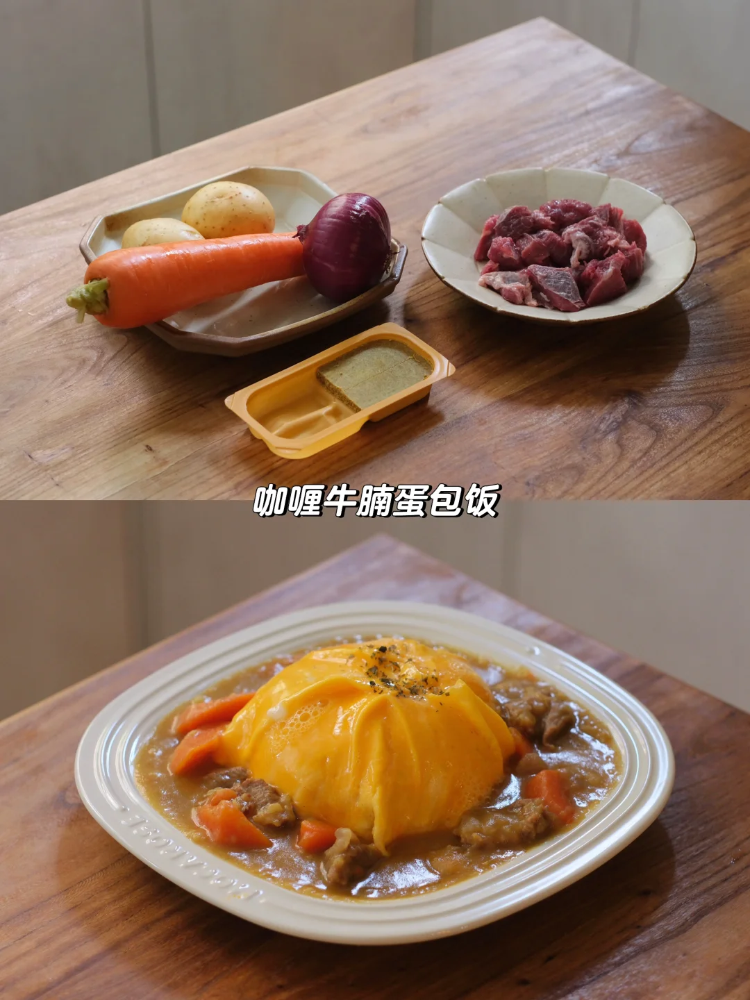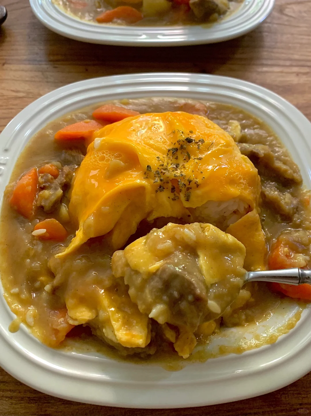咖喱牛腩蛋包饭,绝了!蛋皮练到出神入化才是真功夫,我那份咖喱块总是加不准,要么淡要么浓,得多练练手了