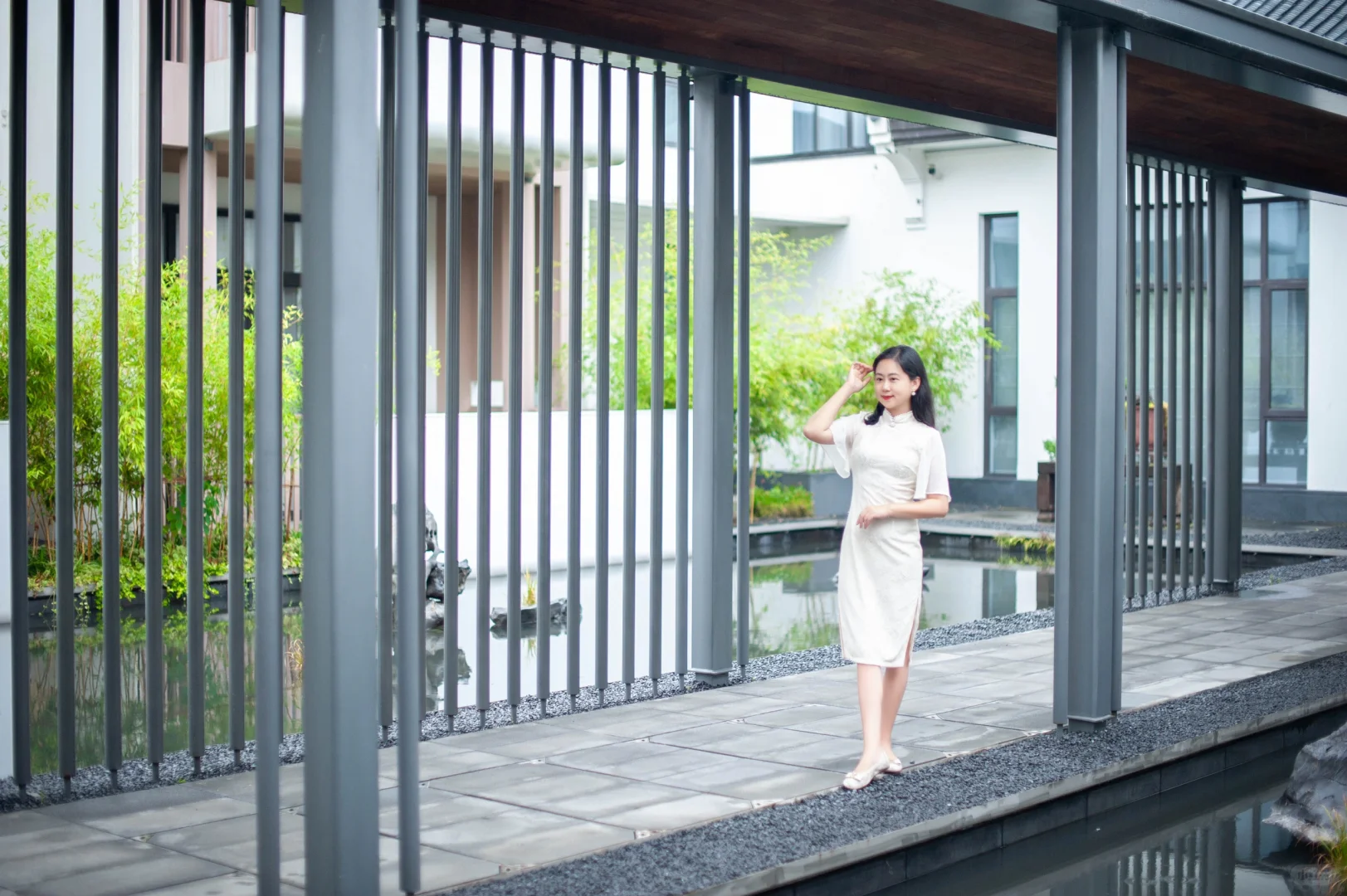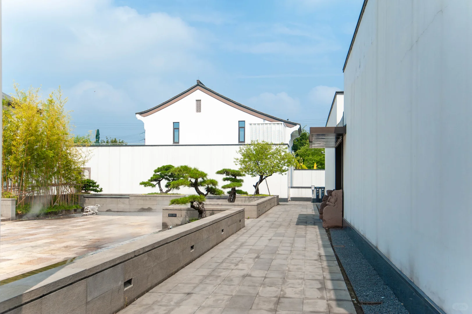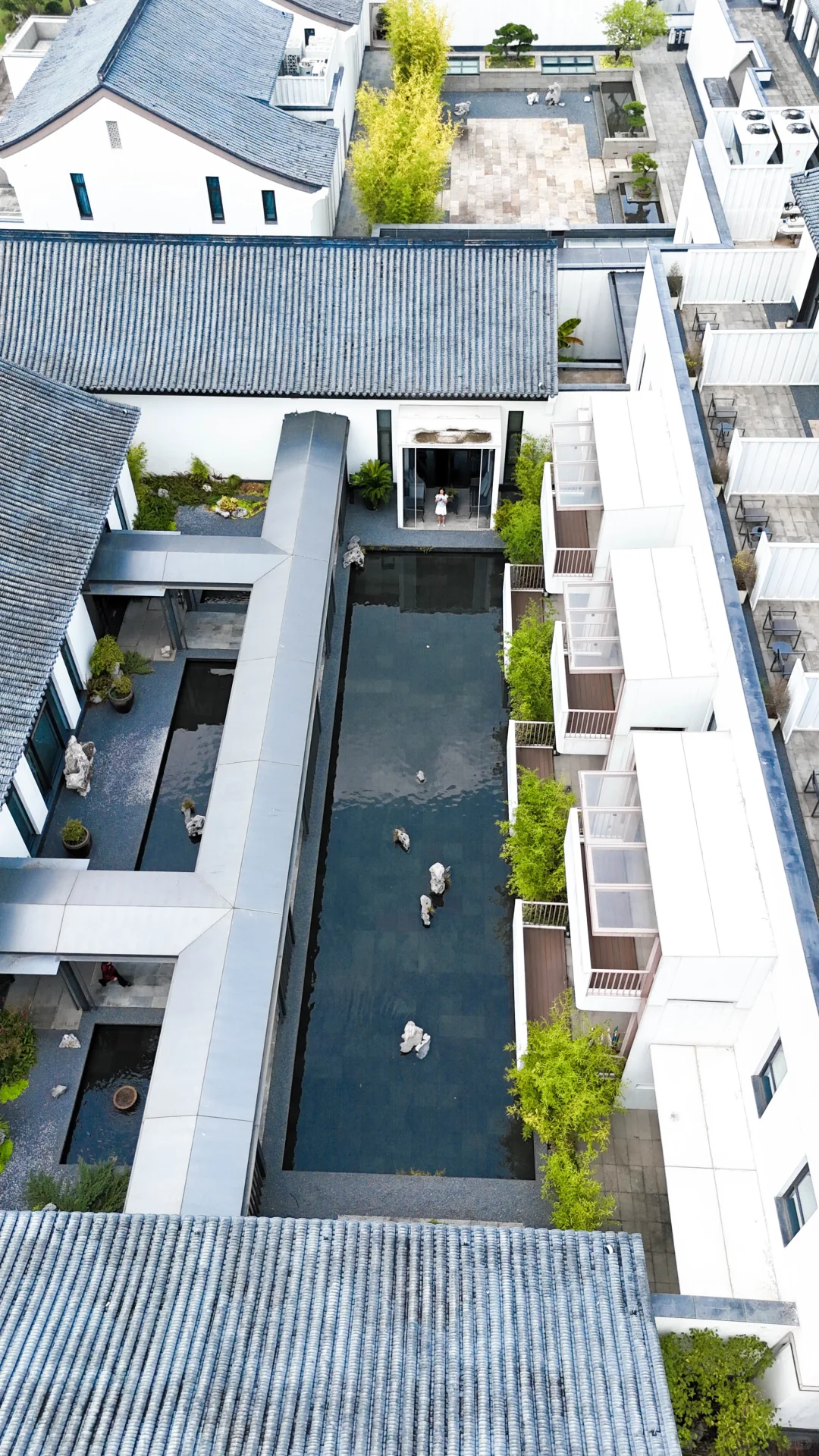 酒店毗邻稀缺的鉴湖沿岸,以建筑、艺石、字画、黑松为依托的新中式风格的艺术度假酒店。走进酒店会发现有很多白墙,白墙为底或有翠竹或有光影,营造出不一样的光影感觉。酒店以“台门”的建筑布局打造而成,粉墙乌瓦甚是好看。