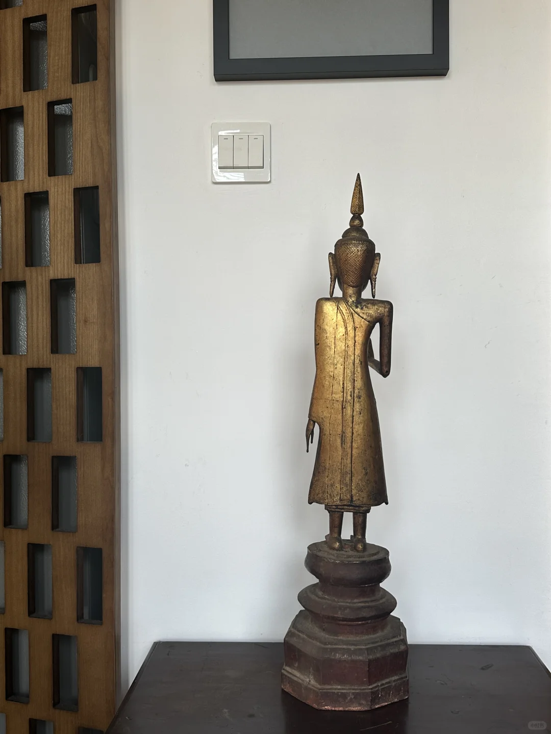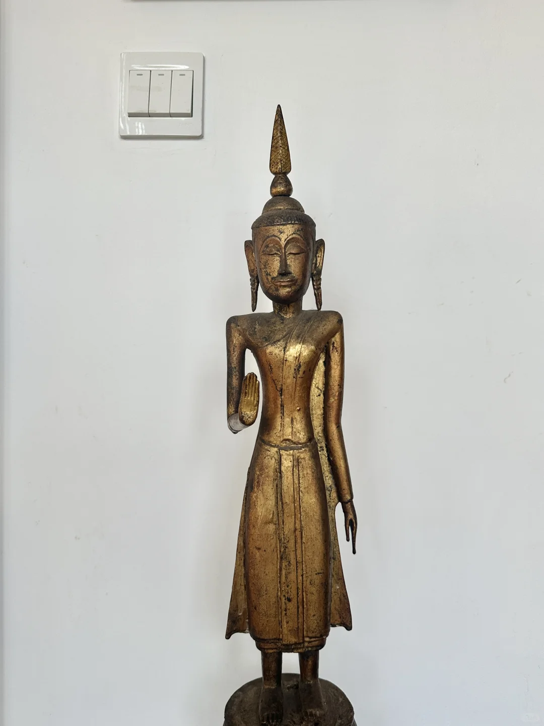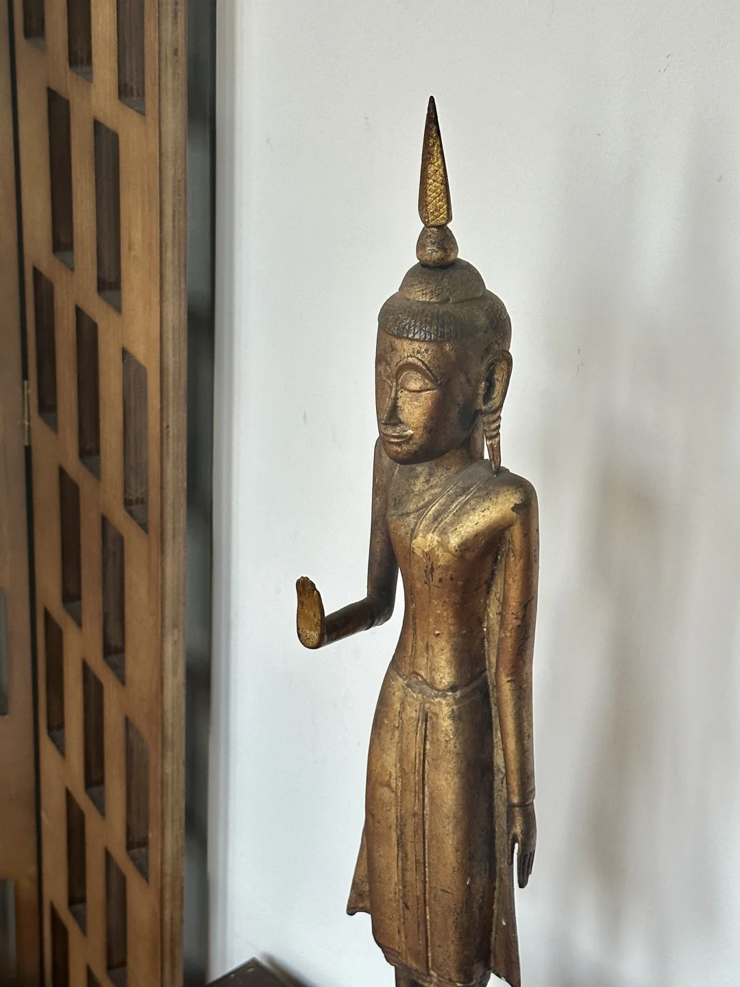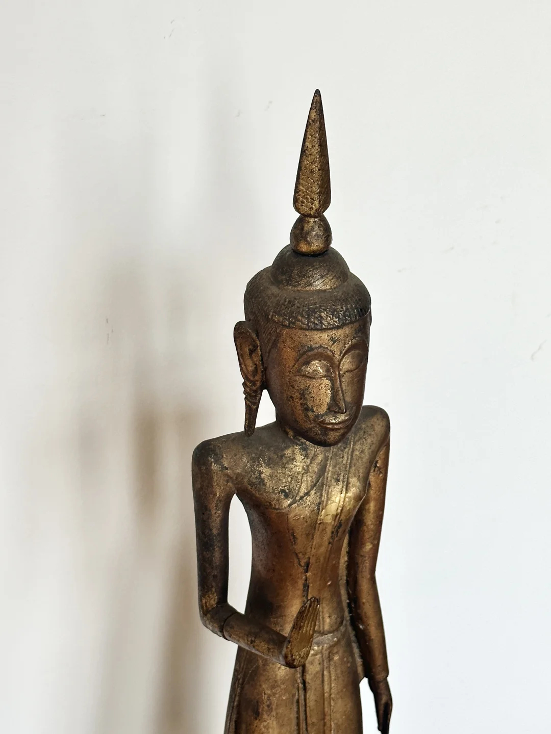 老挝18-19世纪Lan Xang澜沧(万象)风格 木漆金佛造像 南传造像 右手举起,做abhaya-mudra(无畏手势)轻微磨损,头顶的unisha可以拆卸。 尺寸:60厘米