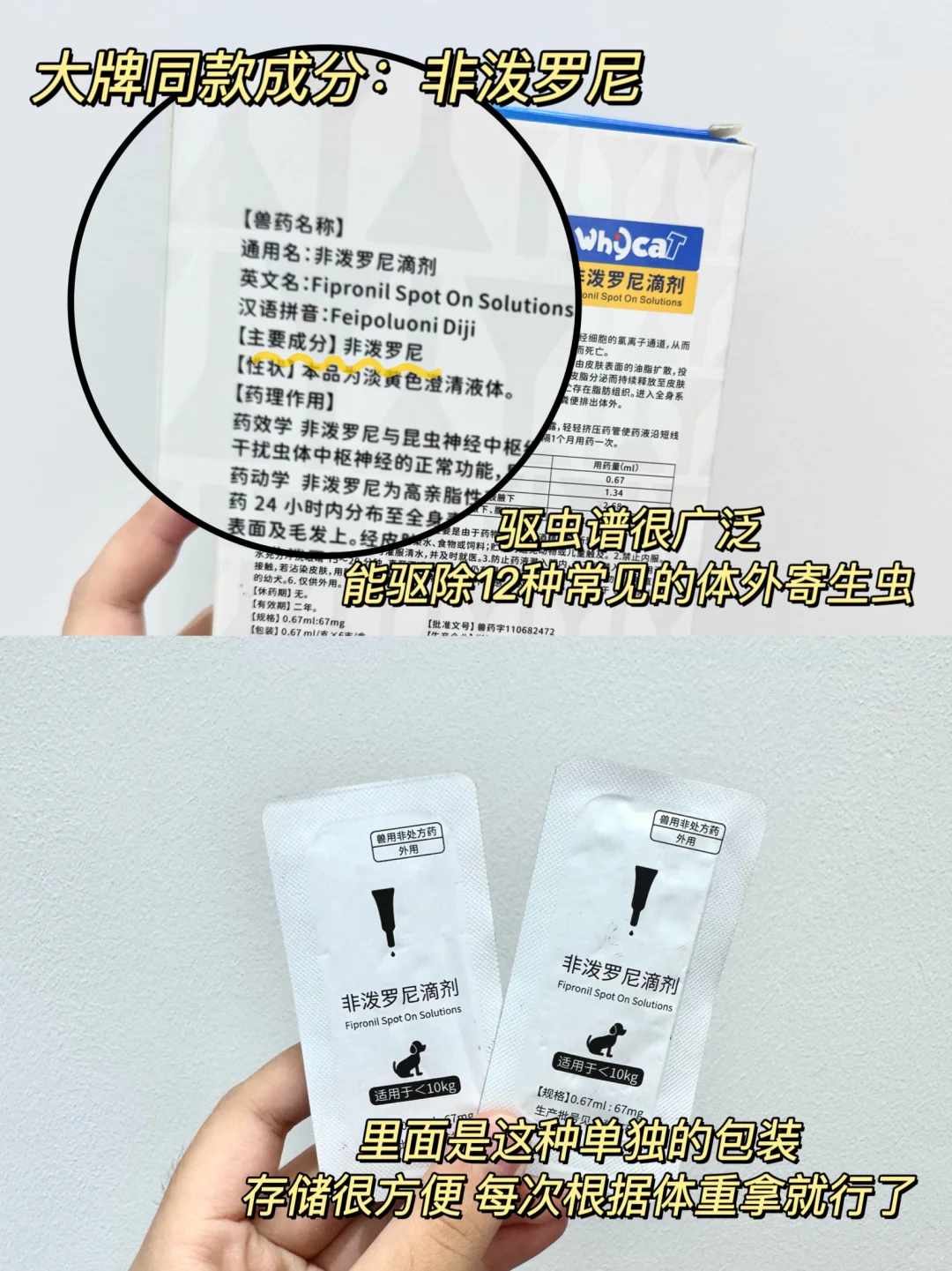 ❤️虫谱很广泛,主要成分是非泼罗尼,能驱杀12种常见的体外寄生虫,将蜱虫、跳蚤、螨虫等常见的体外寄生虫一网打尽!成虫幼虫都能搞定,不用担心反复的问题!